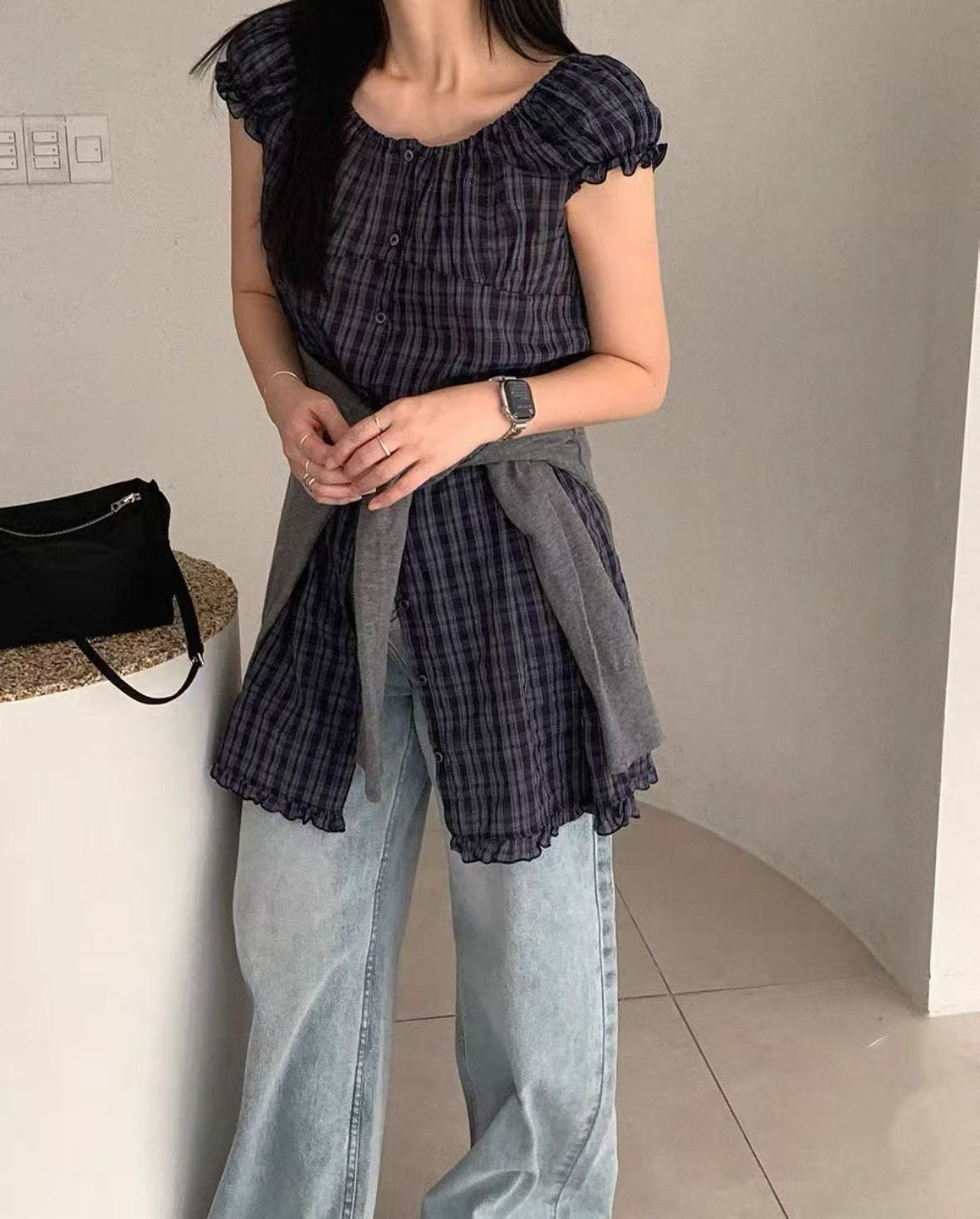한 부서 V넥 프릴 격자 무늬 셔츠 느긋한 바람 루즈핏 디자인 센스 셔츠
