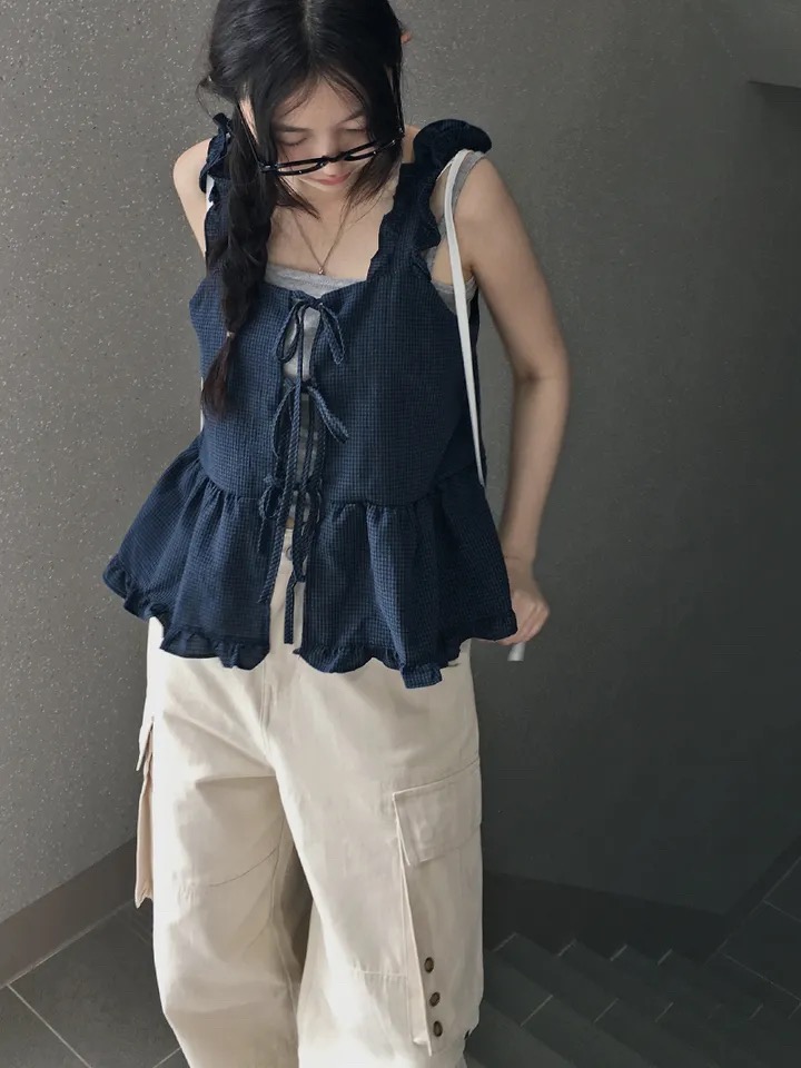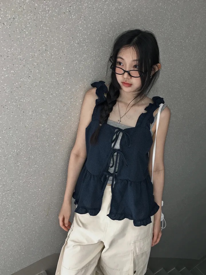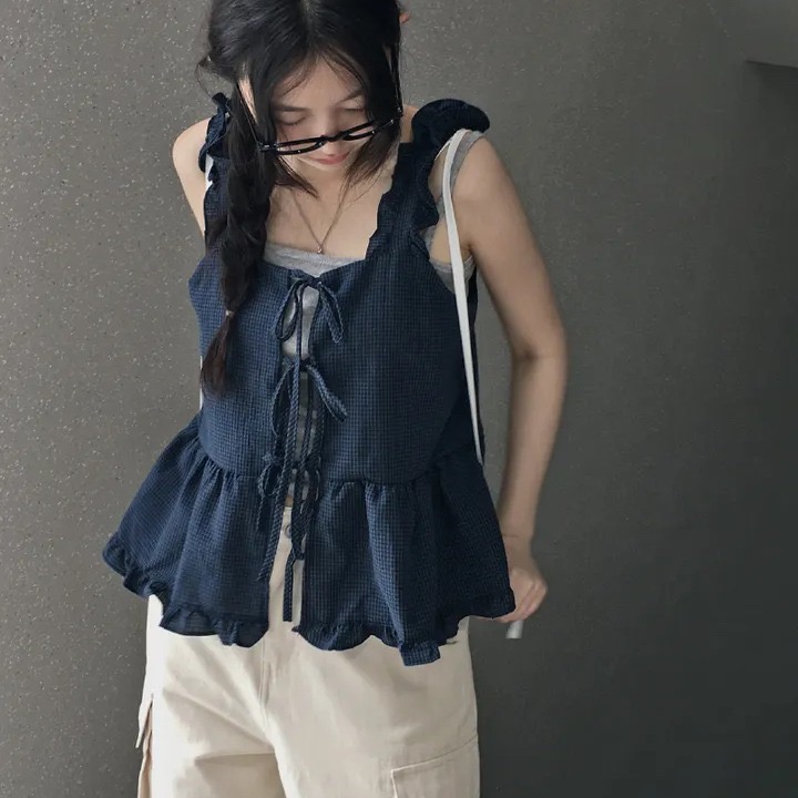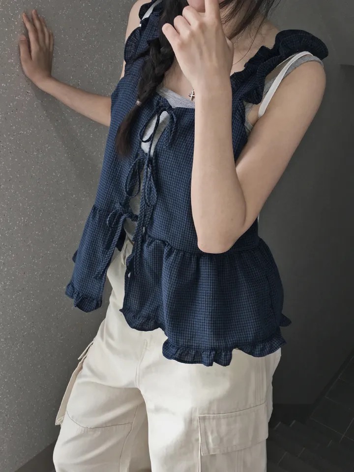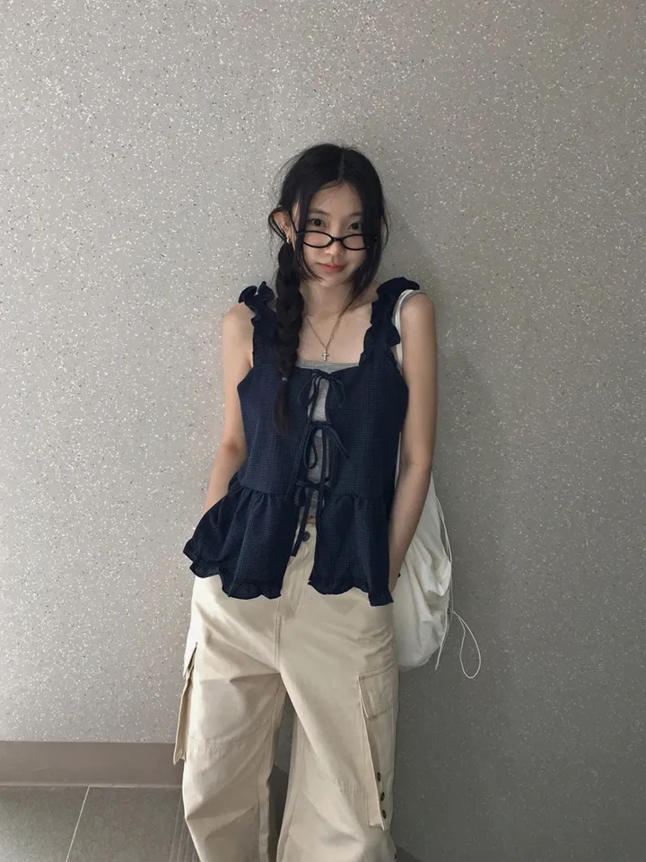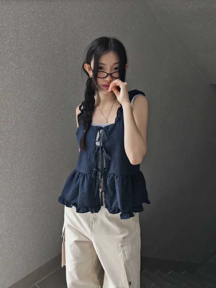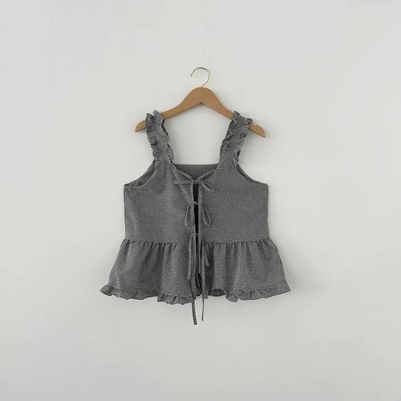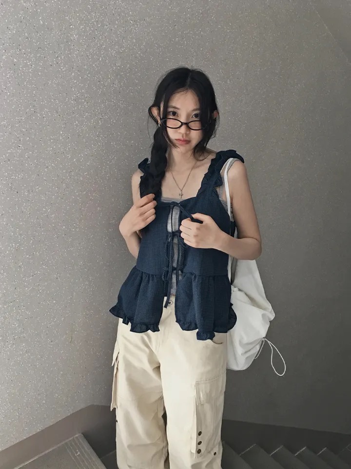 원본 한국 chic 프릴 체크무늬 쉬폰 블라우스 캐미솔 스트랩 홀로우 아웃 주름 패치워크 맨위
