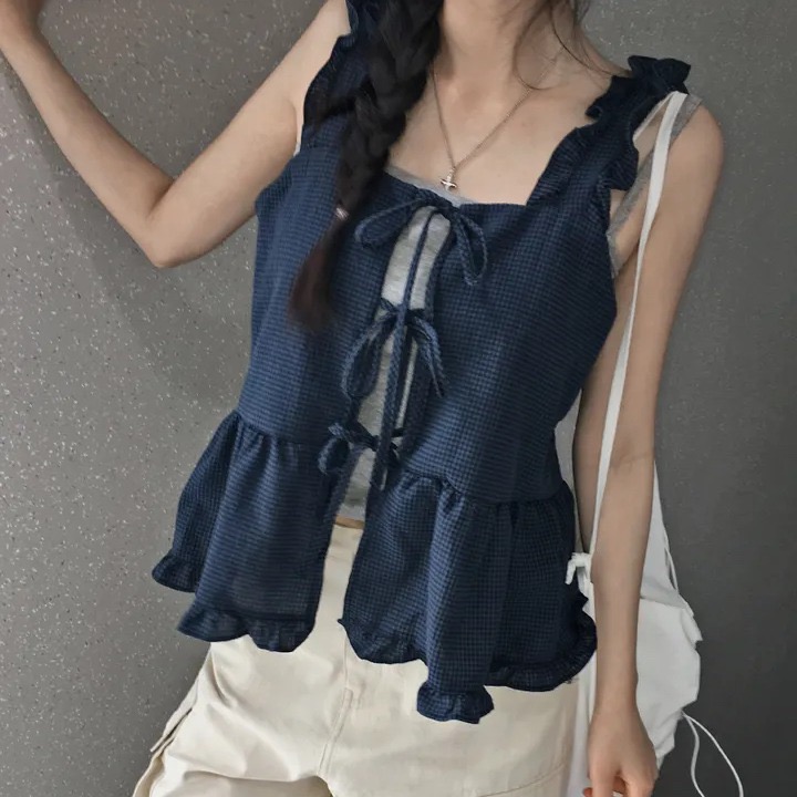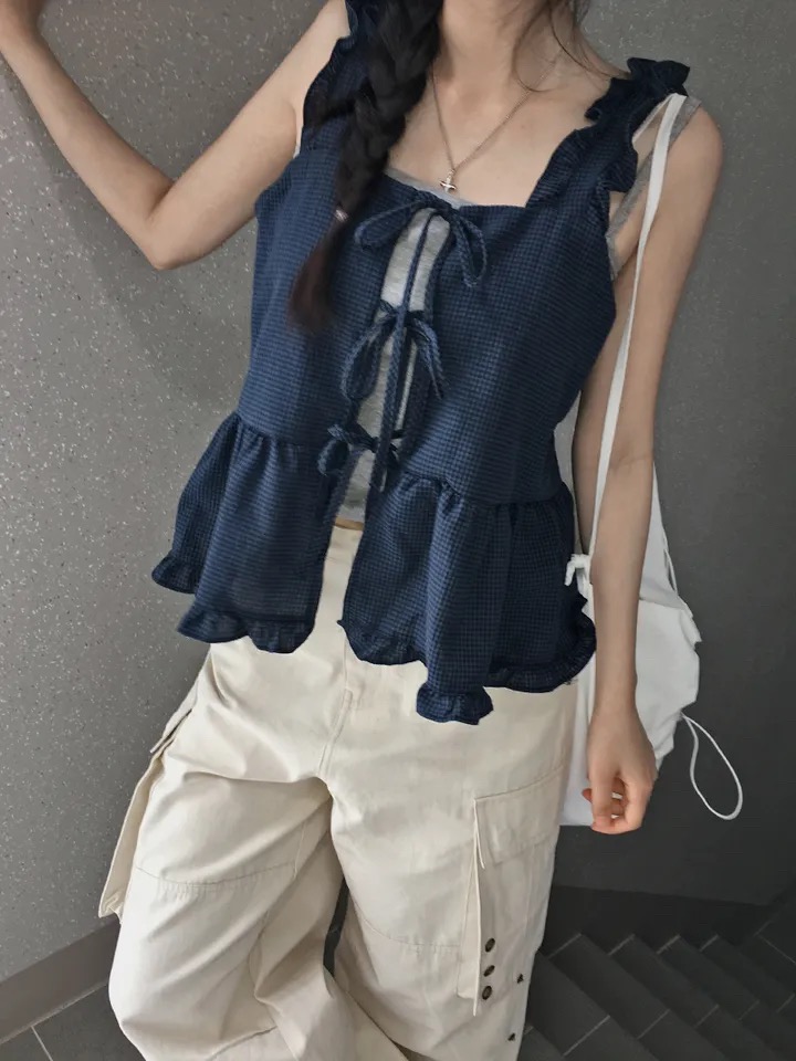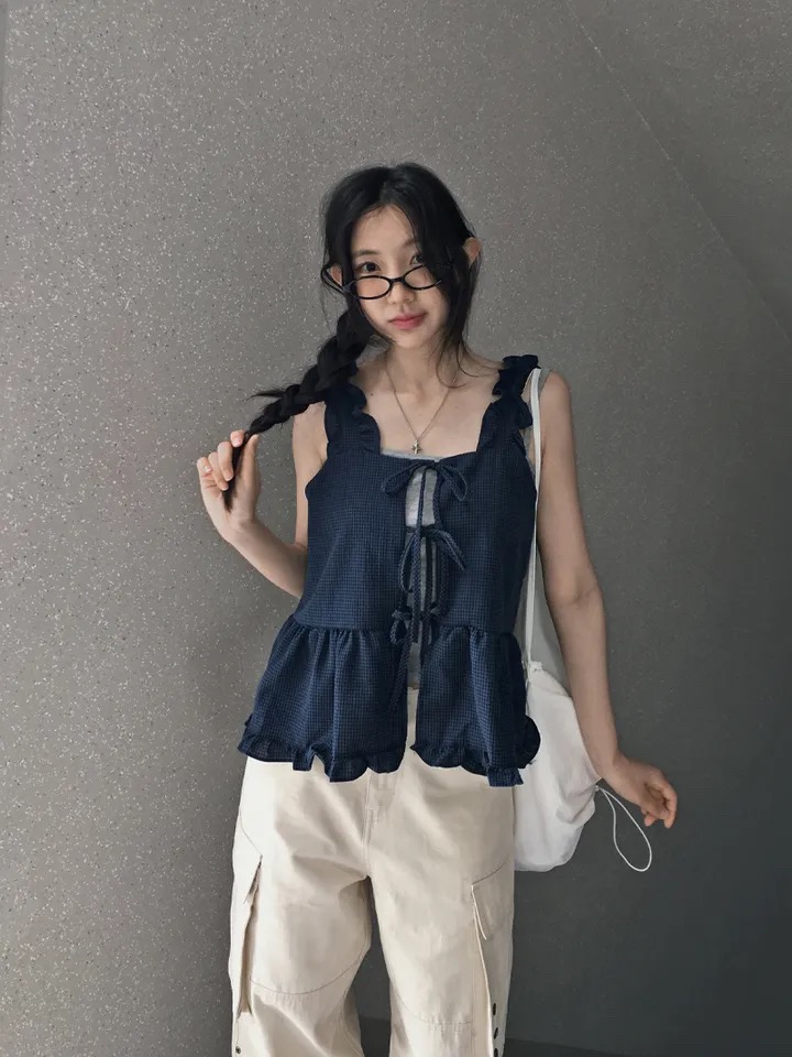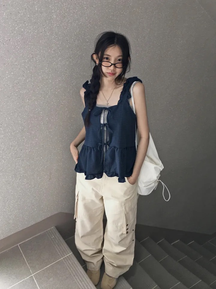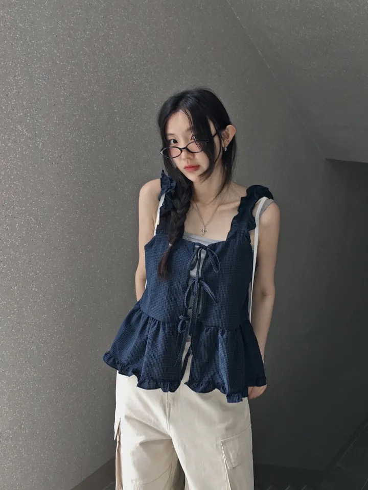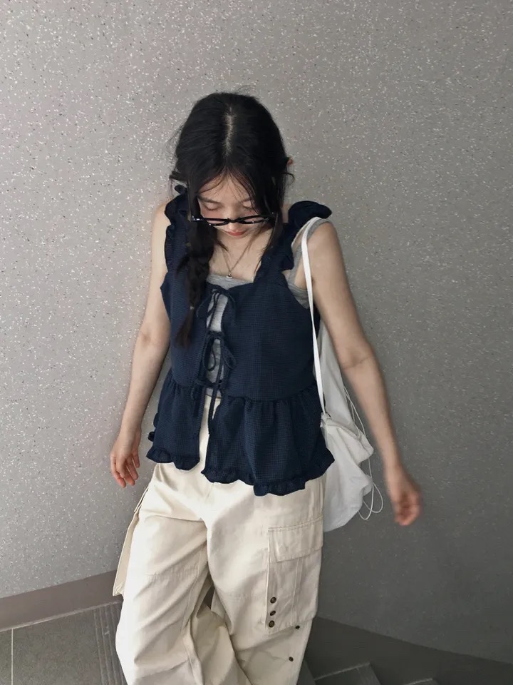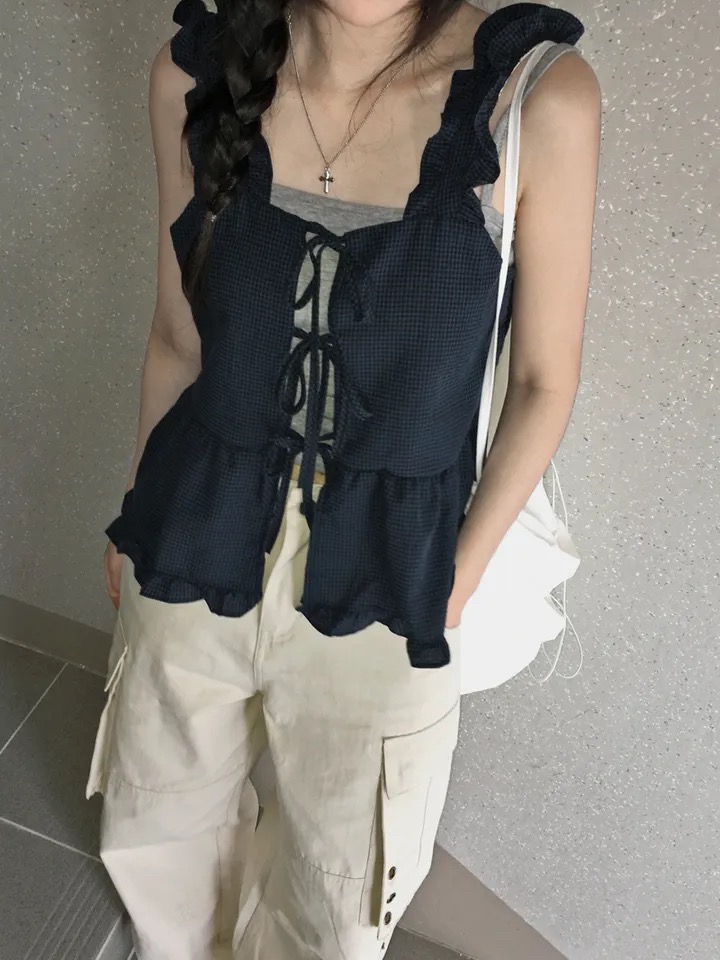 원본 한국 chic 프릴 체크무늬 쉬폰 블라우스 캐미솔 스트랩 홀로우 아웃 주름 패치워크 맨위