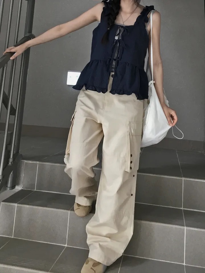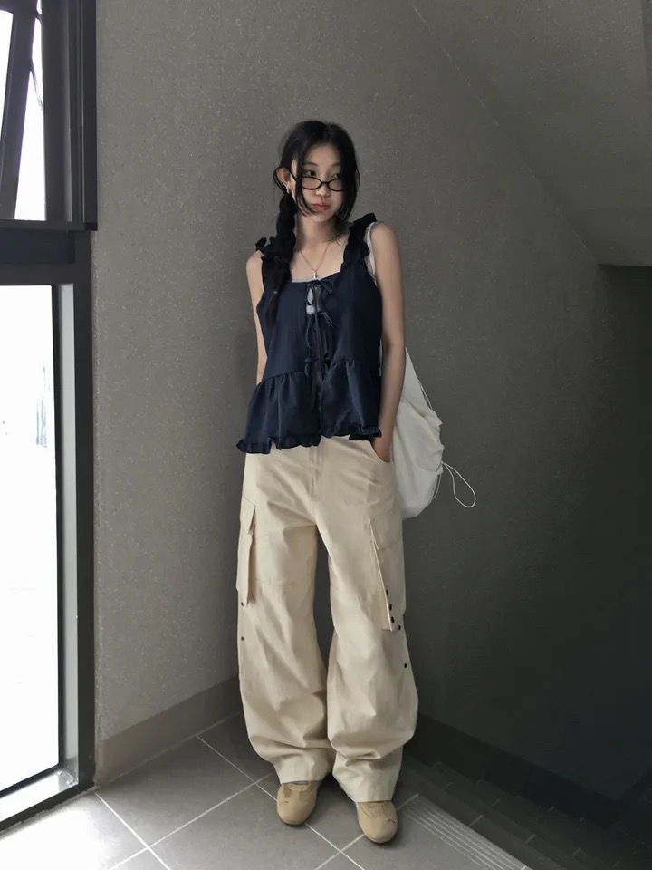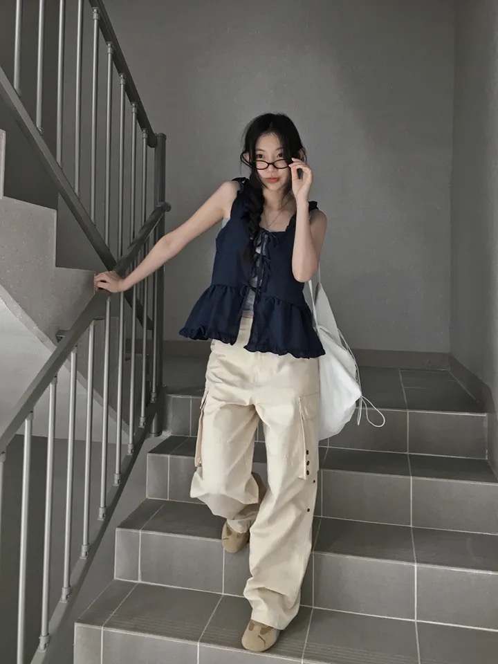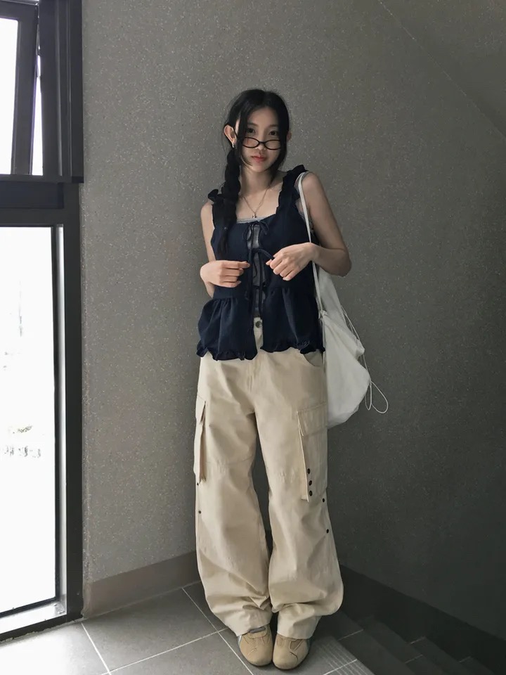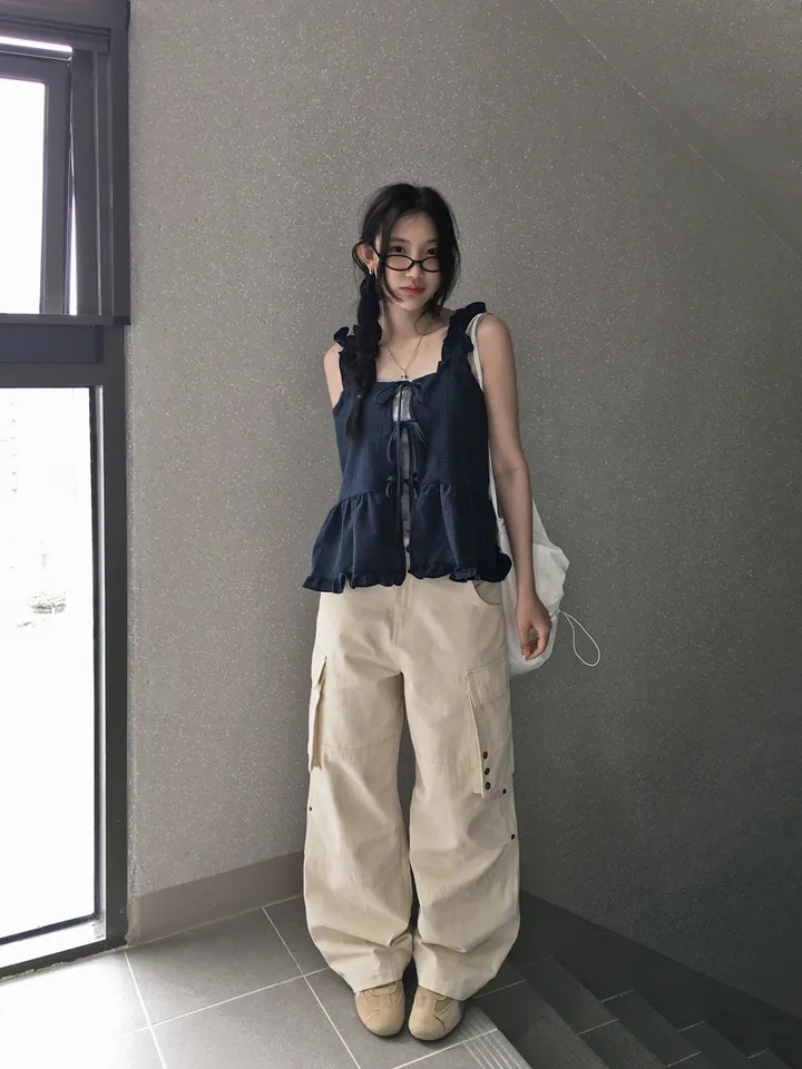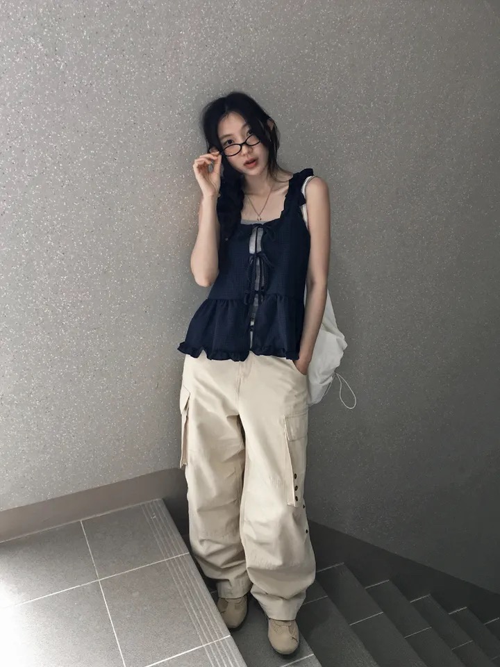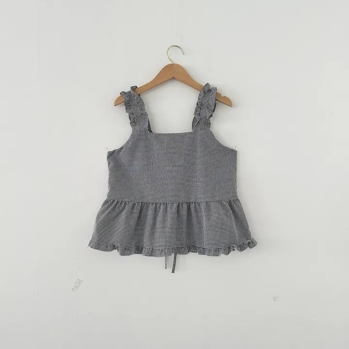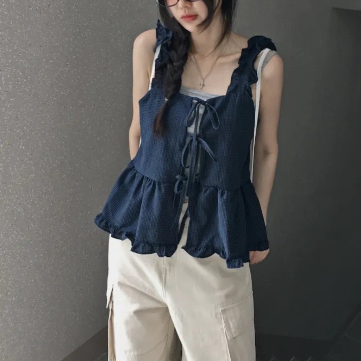 원본 한국 chic 프릴 체크무늬 쉬폰 블라우스 캐미솔 스트랩 홀로우 아웃 주름 패치워크 맨위