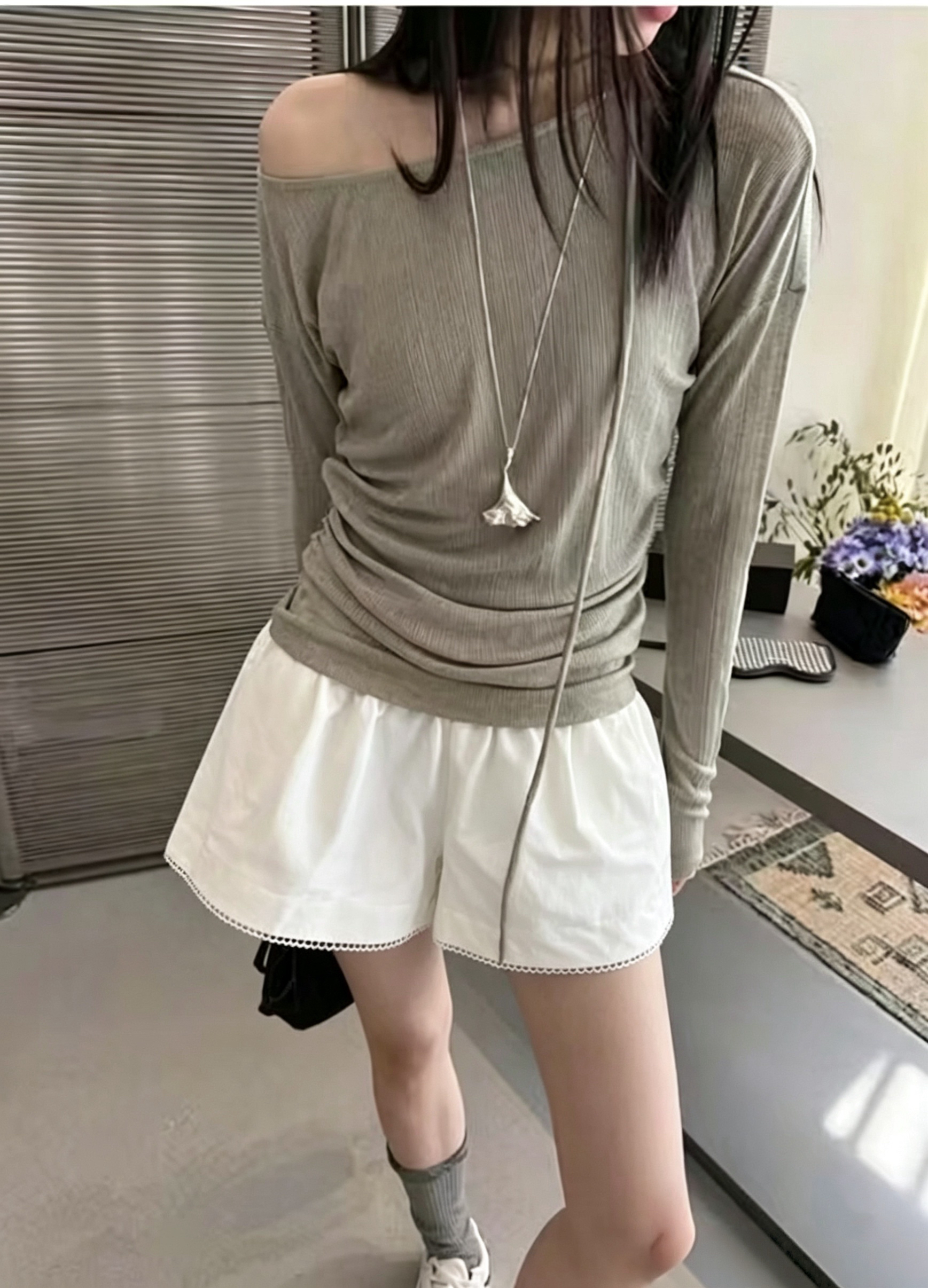 50 접착제 50 폴리에스터 t 루즈핏 비스듬한 어깨 배트윙 소매 니트 티셔츠 여성 부드러운 찹쌀 느긋한 센스 불규칙 맨위