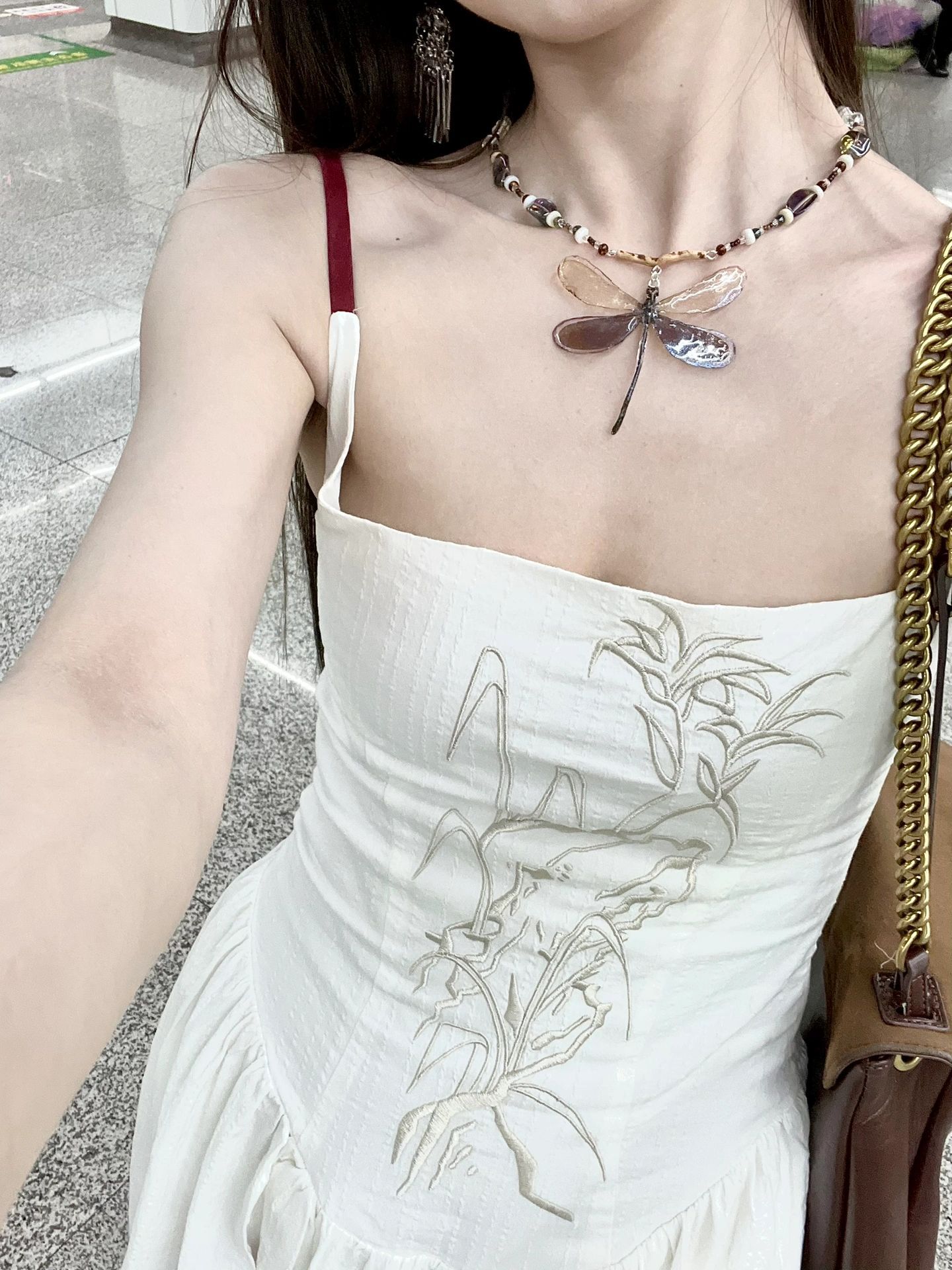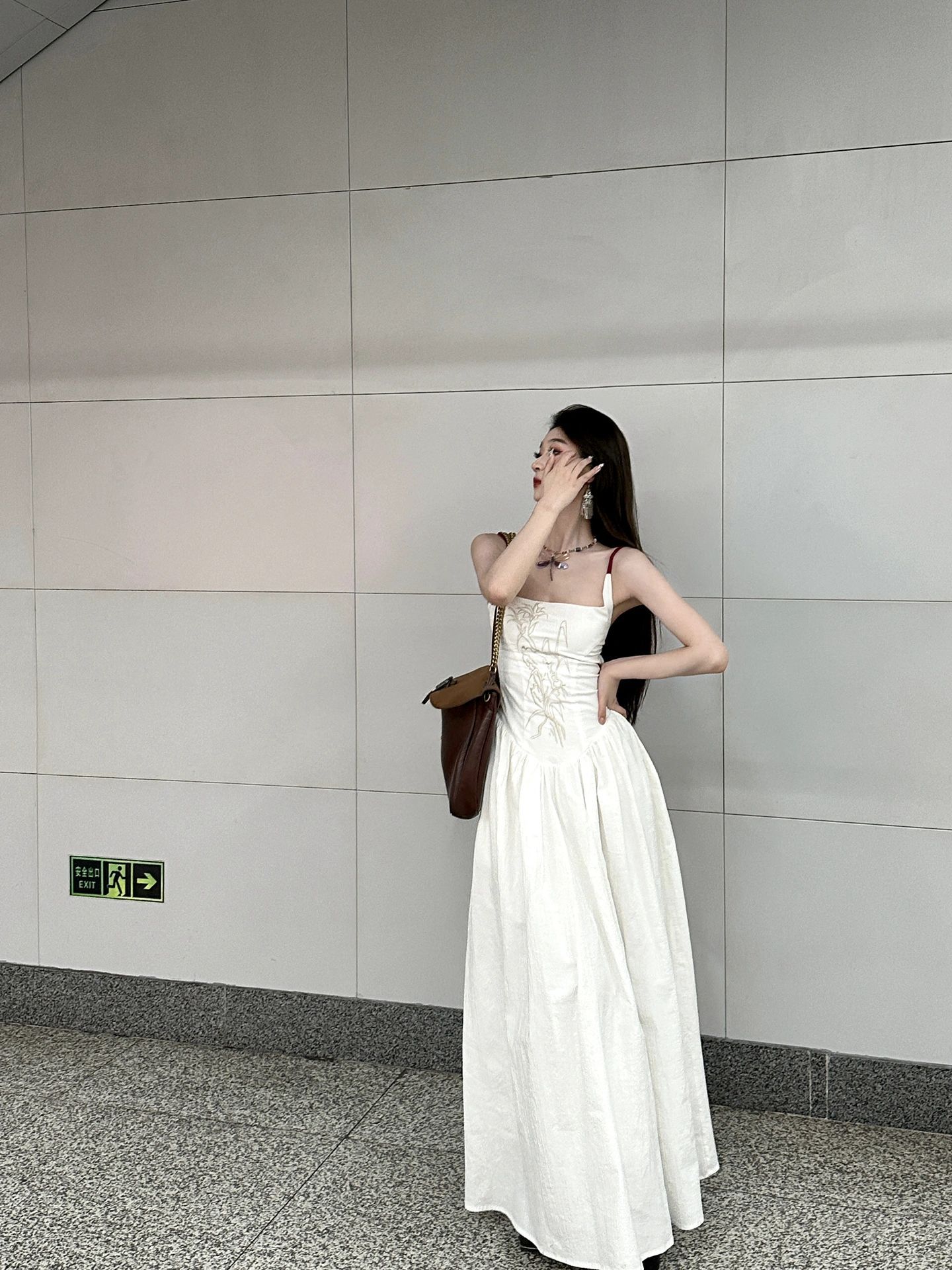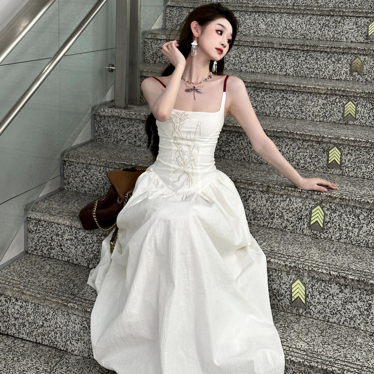 이중층 세트 인사이드 2026 새로운 새로운 중식 자수 롱 코트 백리스 허리 수축 슬림해 보이는 슬립 여성 드레스