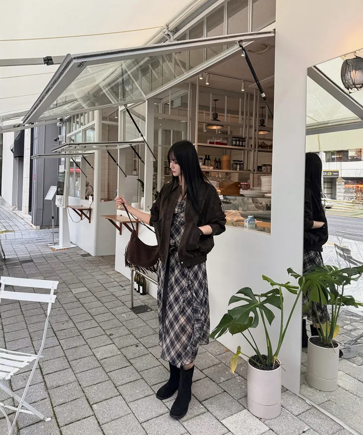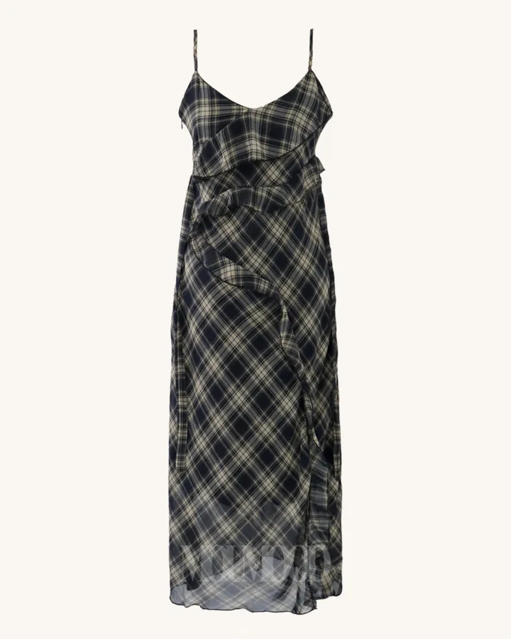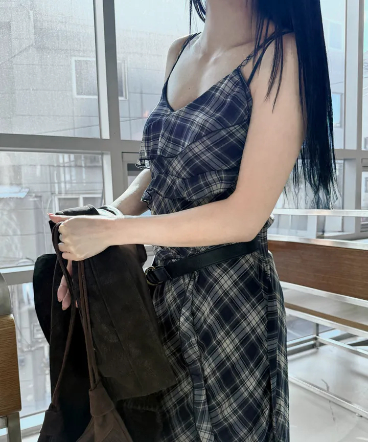 있음 선적 한국 ins 불규칙 프릴 우아한 센스 체크무늬 슬립 드레스