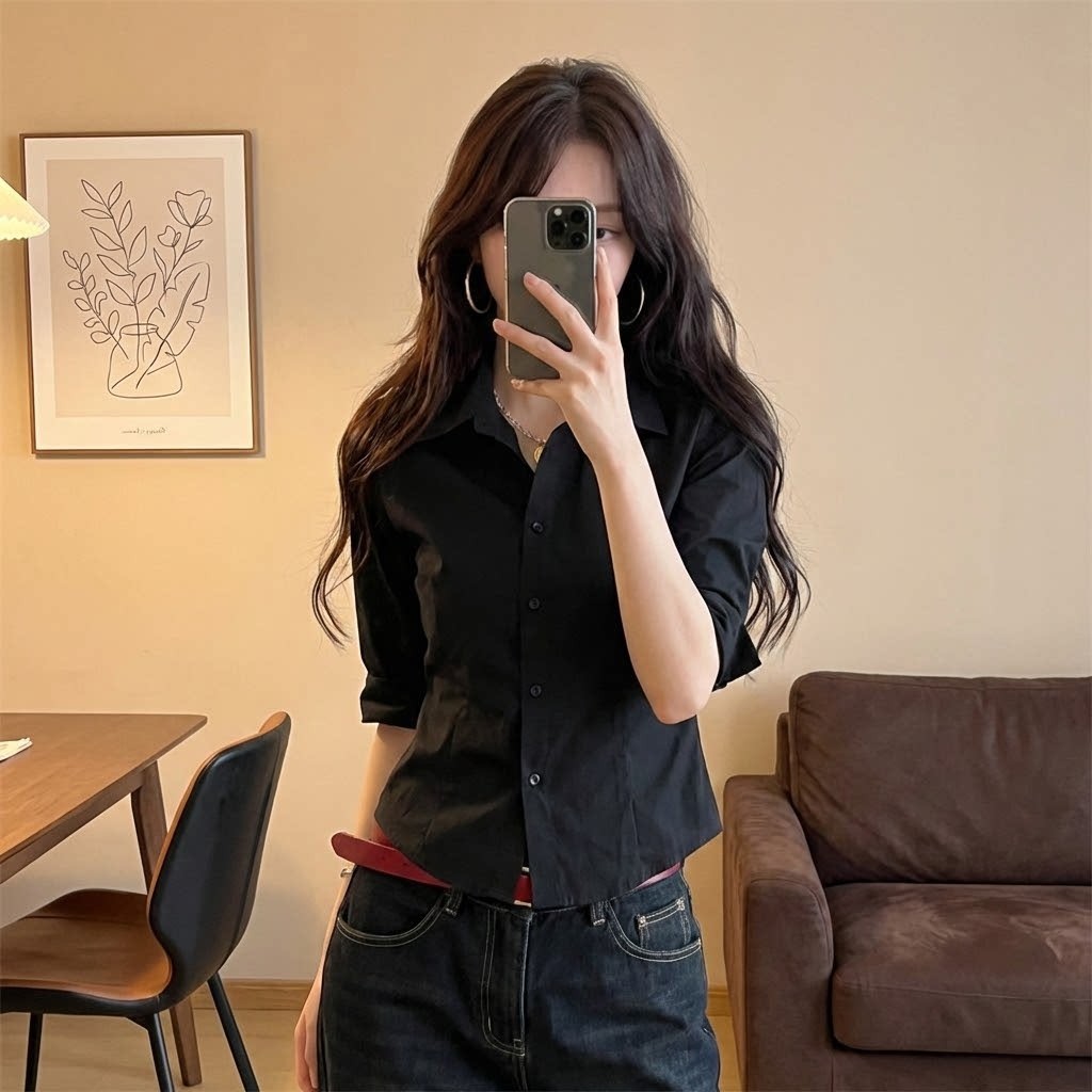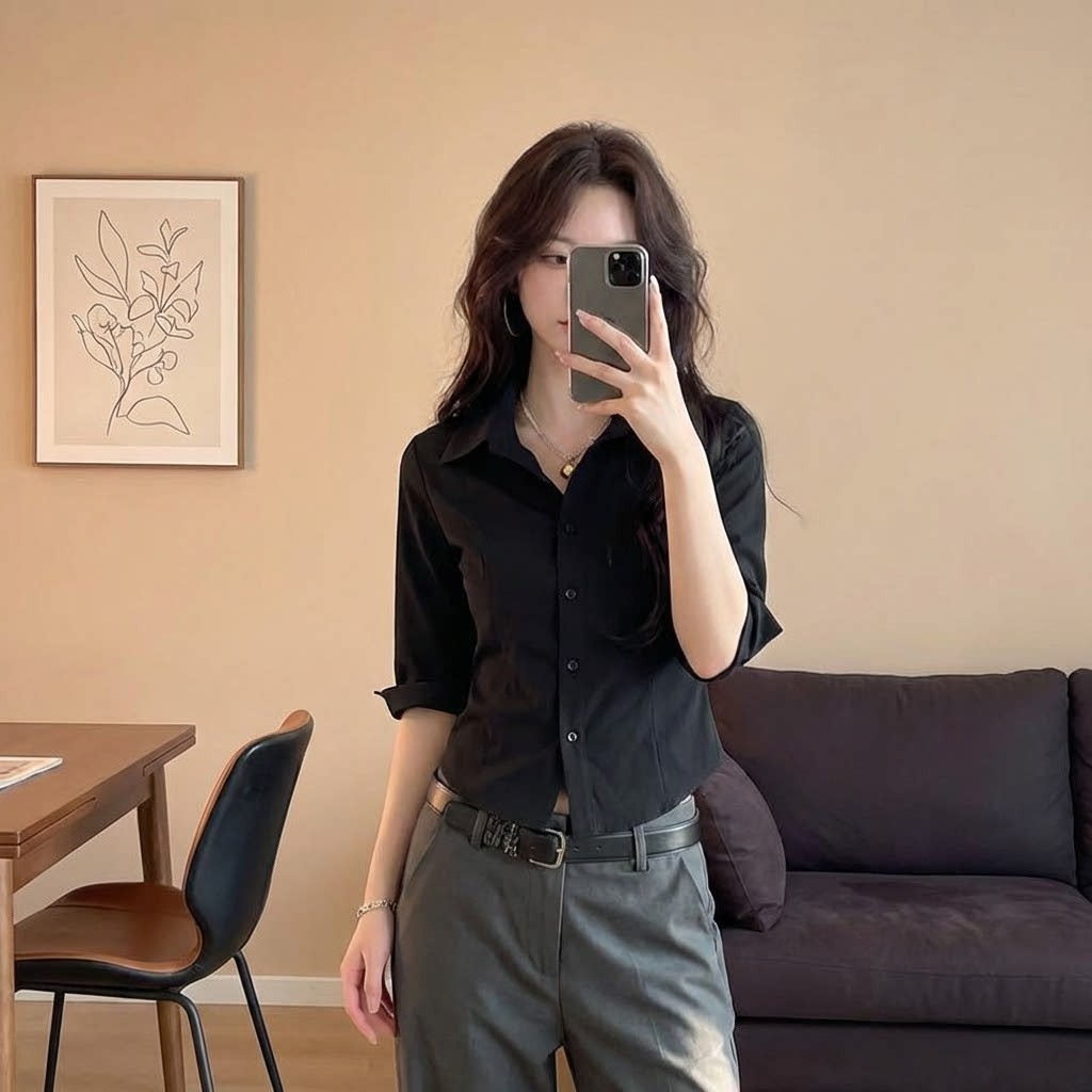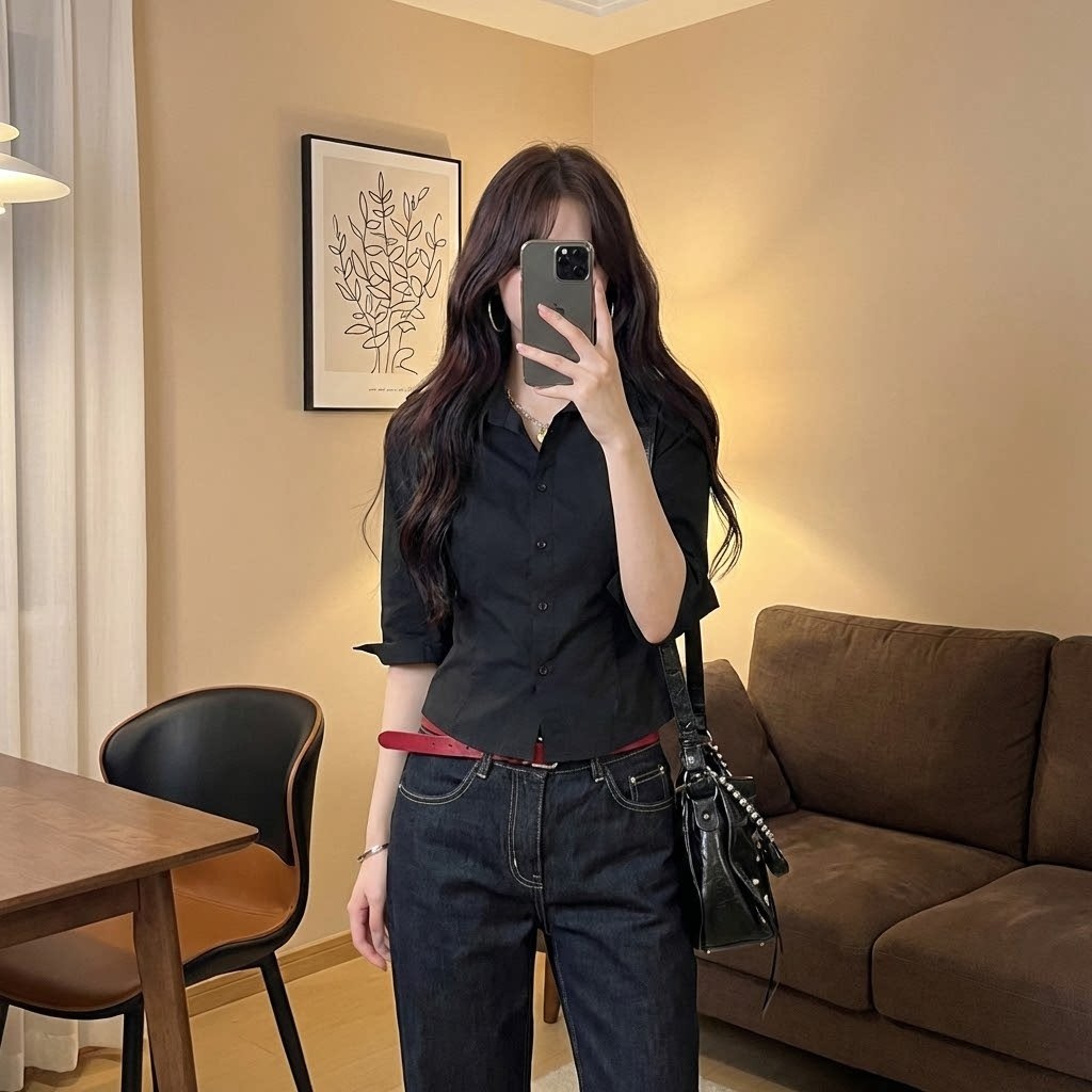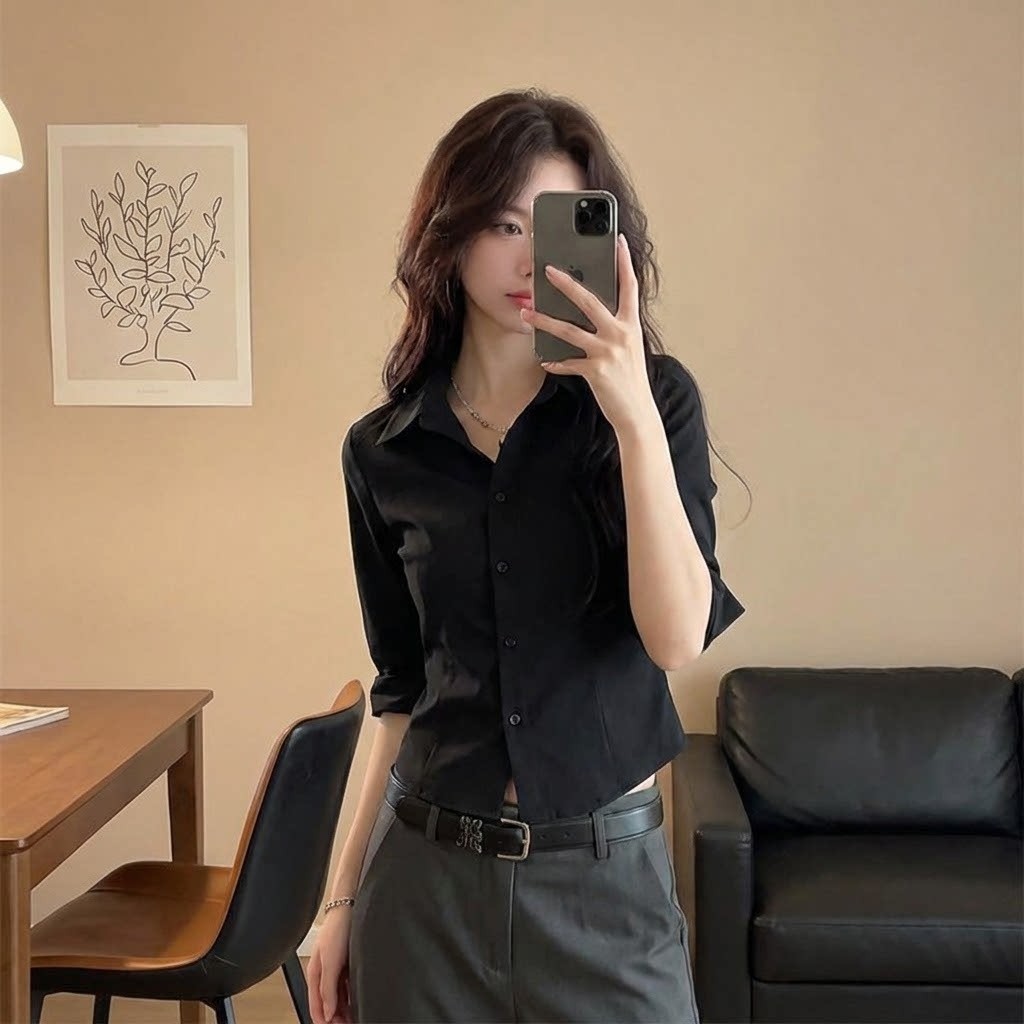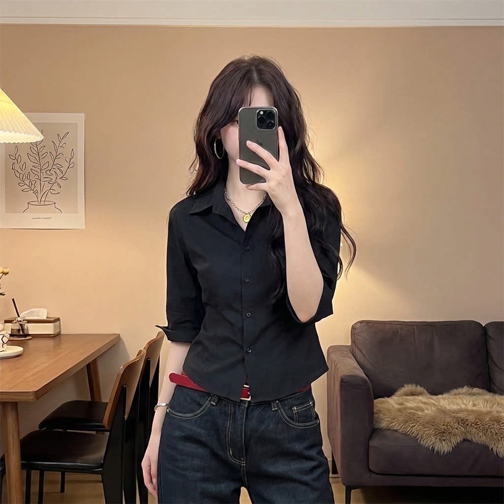 2026 여름 새로운 슬림해 보이는 세련된 빛 직업 바람 출퇴근 폴로 칼라 여성 셔츠 품격 중간 소매 셔츠