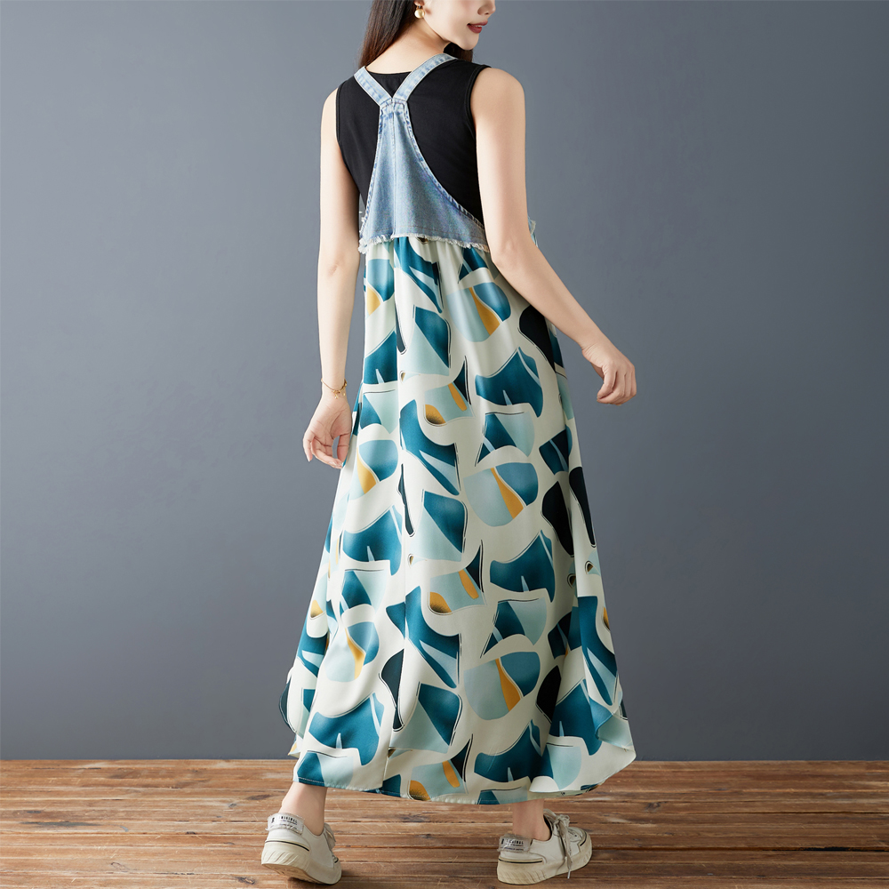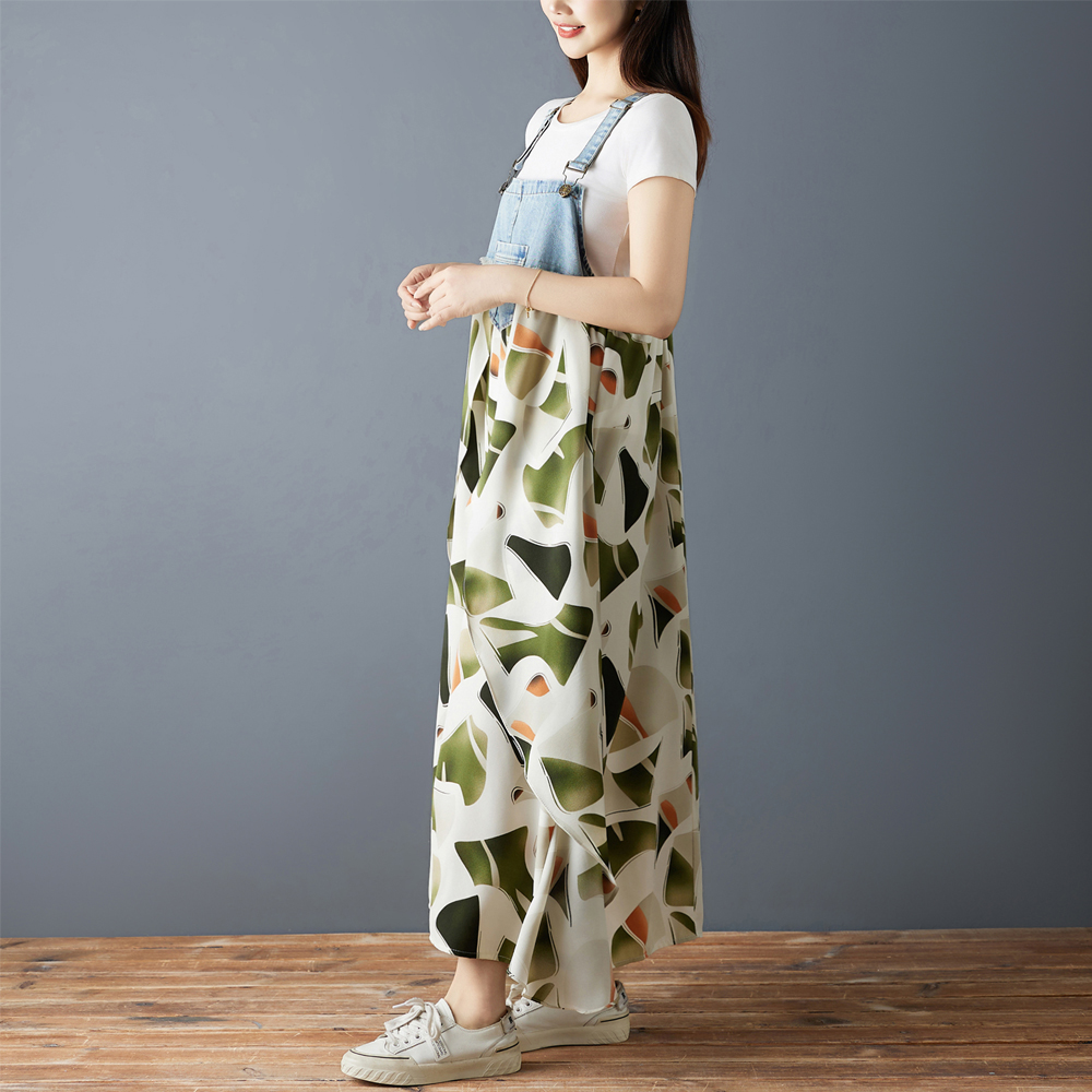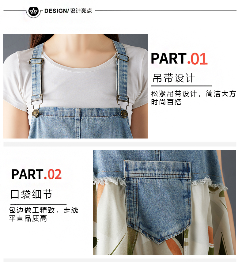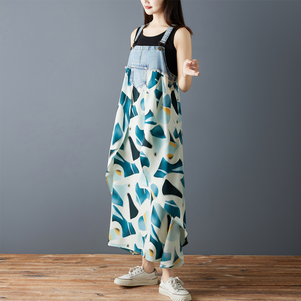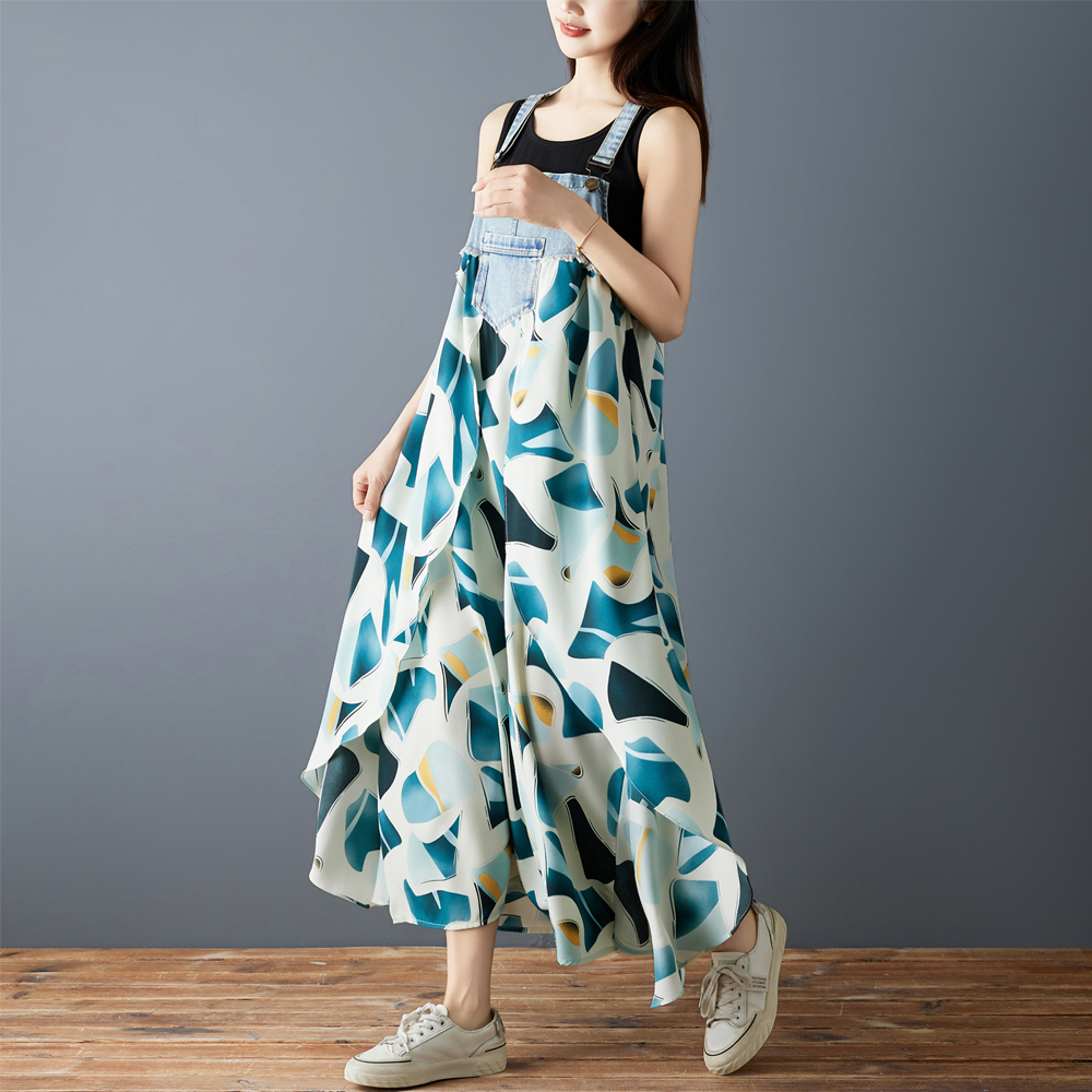 실사 2026 여름 새로운 프릴 루즈핏 쉬폰 프린트 데님 디자인 센스 멜빵 중간 길이 드레스