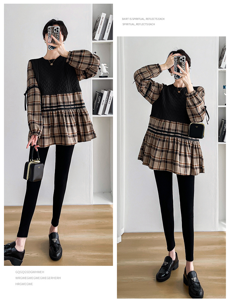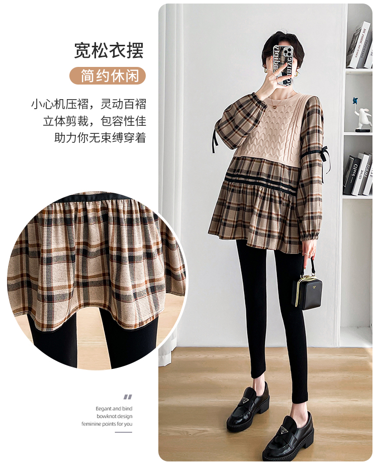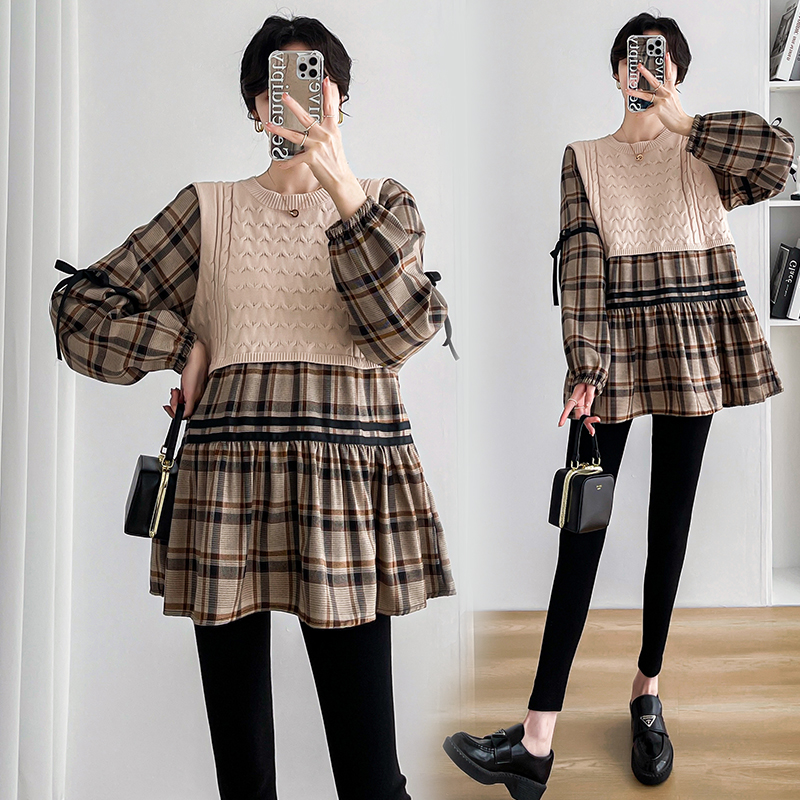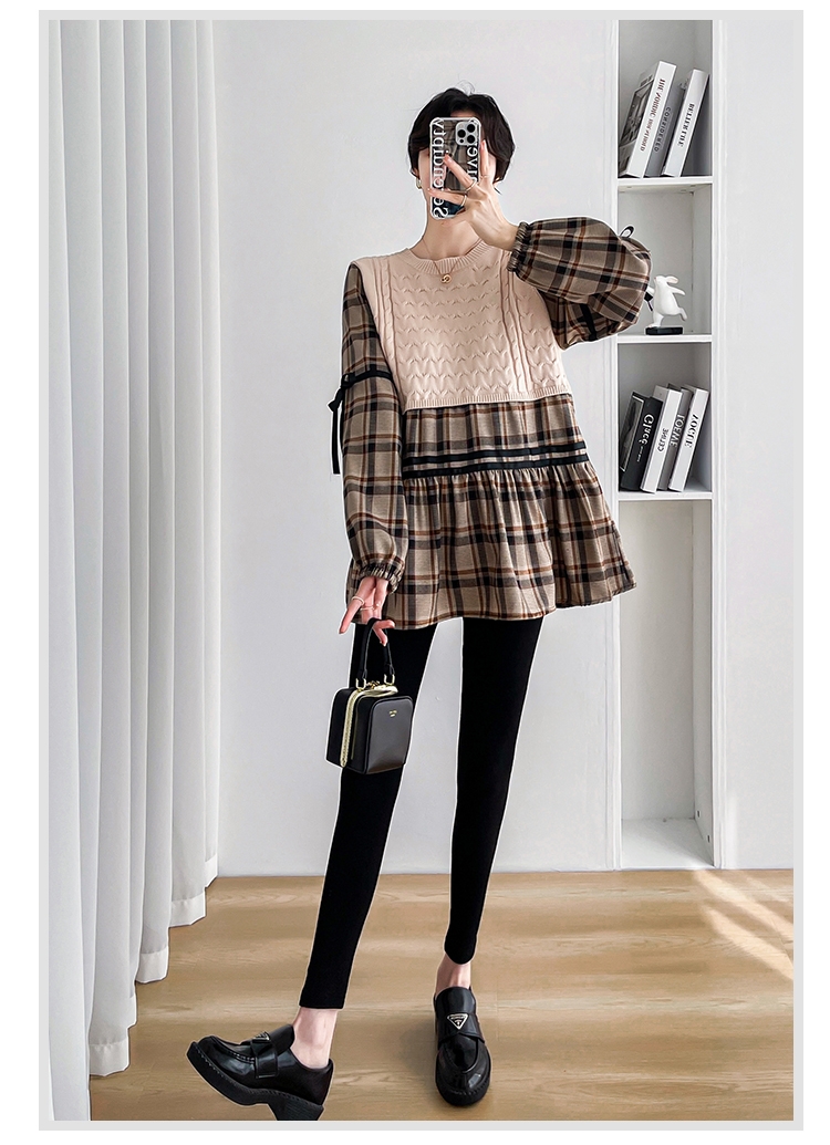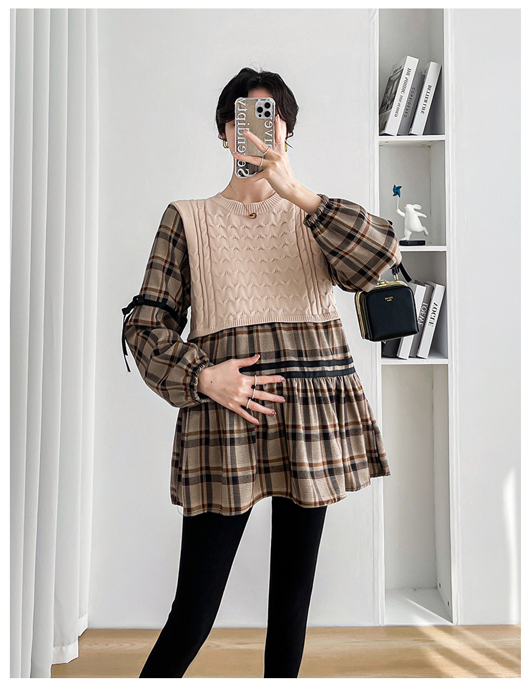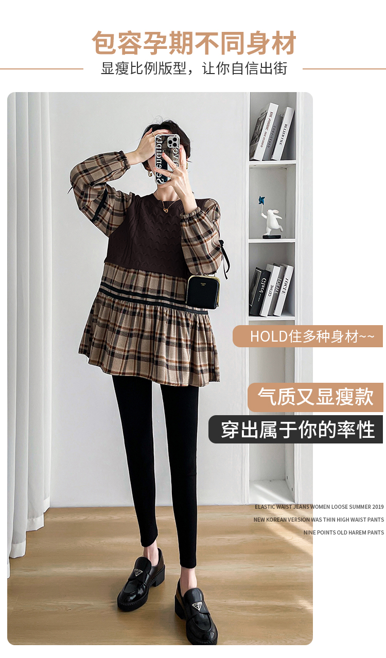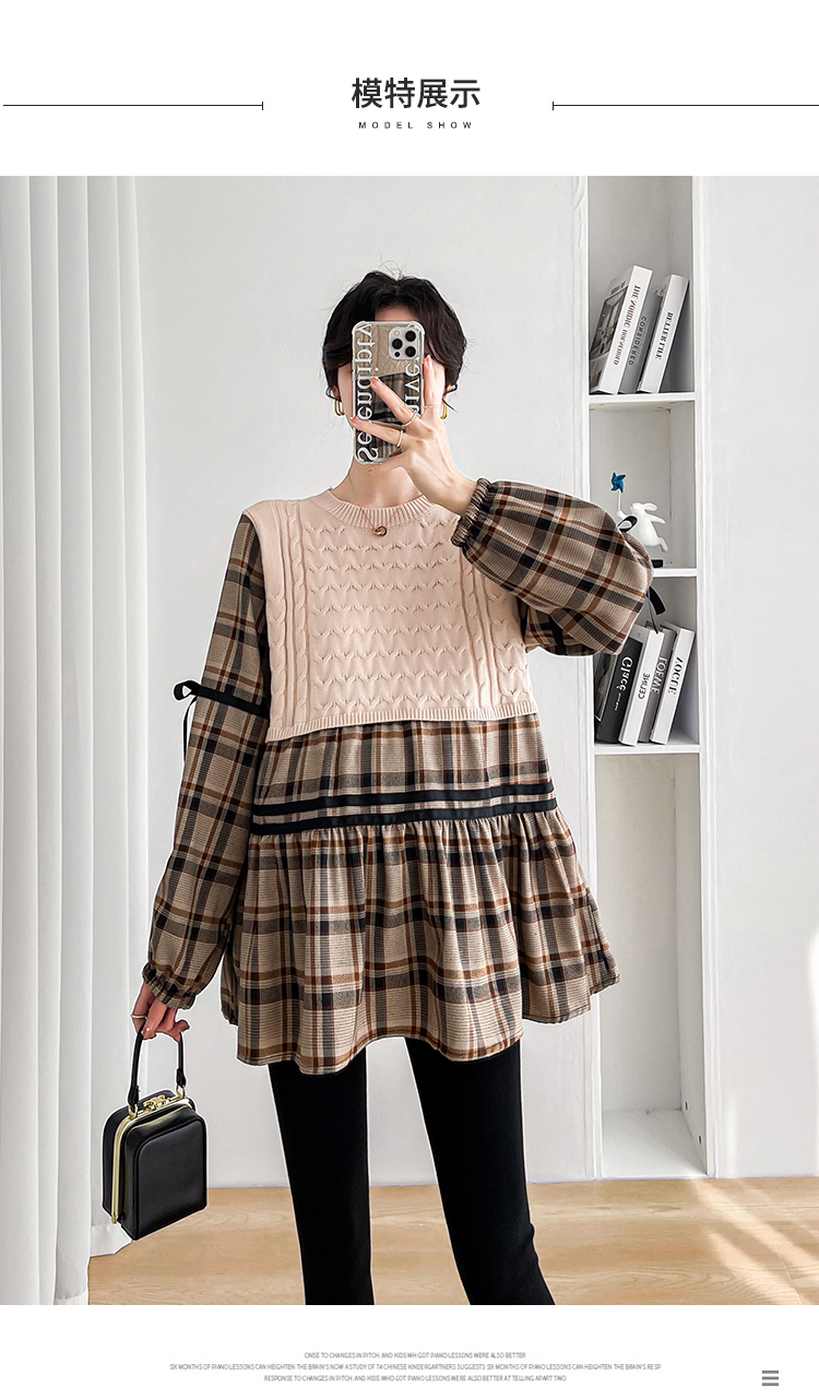 실사 임산부 봄 드레스 인터넷 유명인 한국 스타일 루즈핏 체크무늬 패치워크 패션 다용도 인형 셔츠 루즈핏 슬림해 보이는 맨위