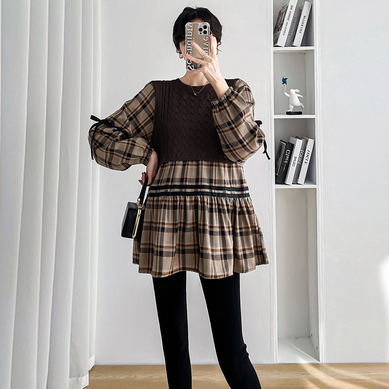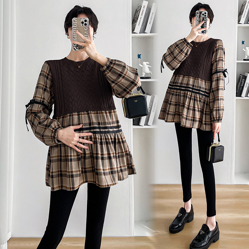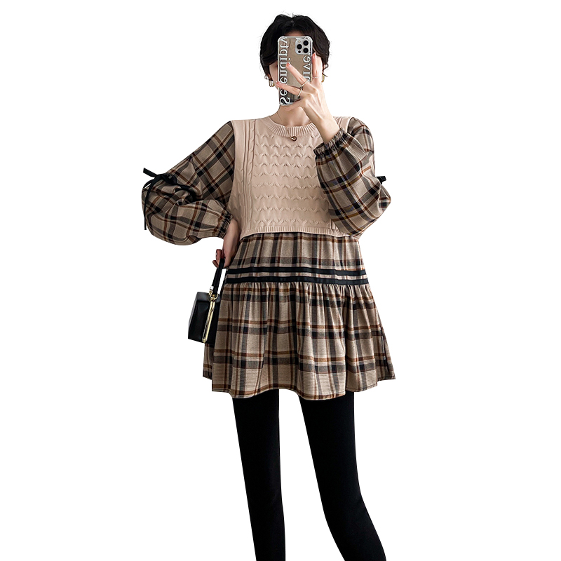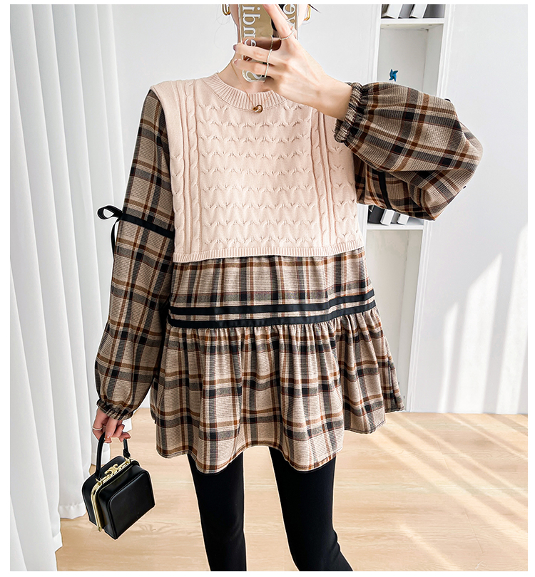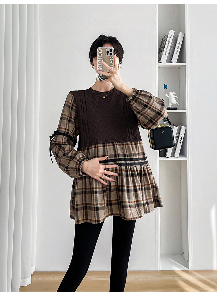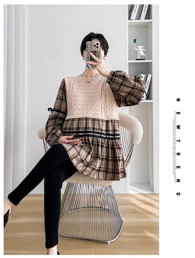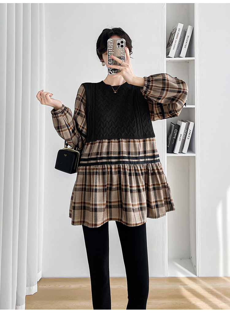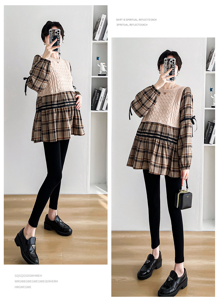 실사 임산부 봄 드레스 인터넷 유명인 한국 스타일 루즈핏 체크무늬 패치워크 패션 다용도 인형 셔츠 루즈핏 슬림해 보이는 맨위
