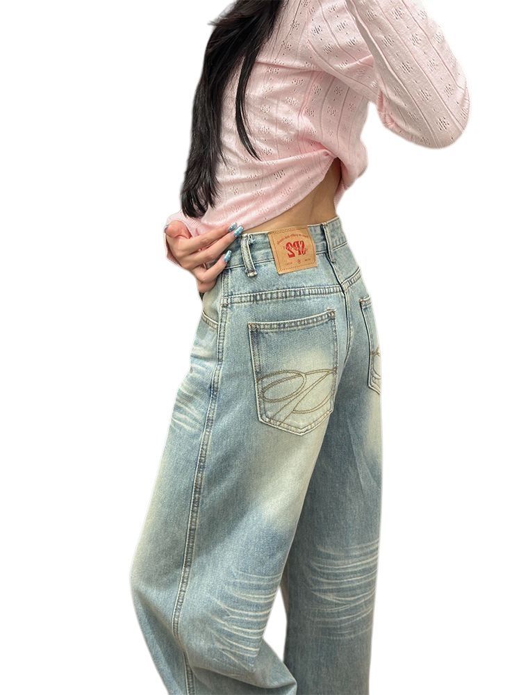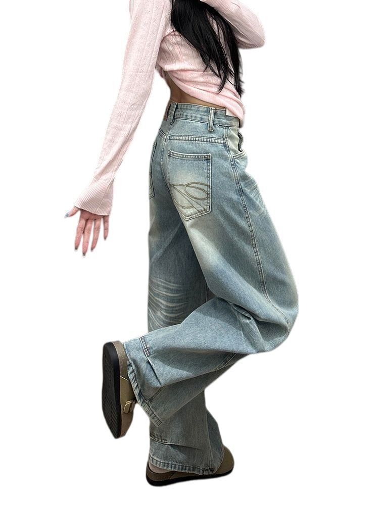 아메리칸 레트로 단추 명시적 스티치 알파벳 자수 넓은 다리 청바지 루즈핏 조수 브랜드 십자가 바닥 청소 긴 바지 y2k