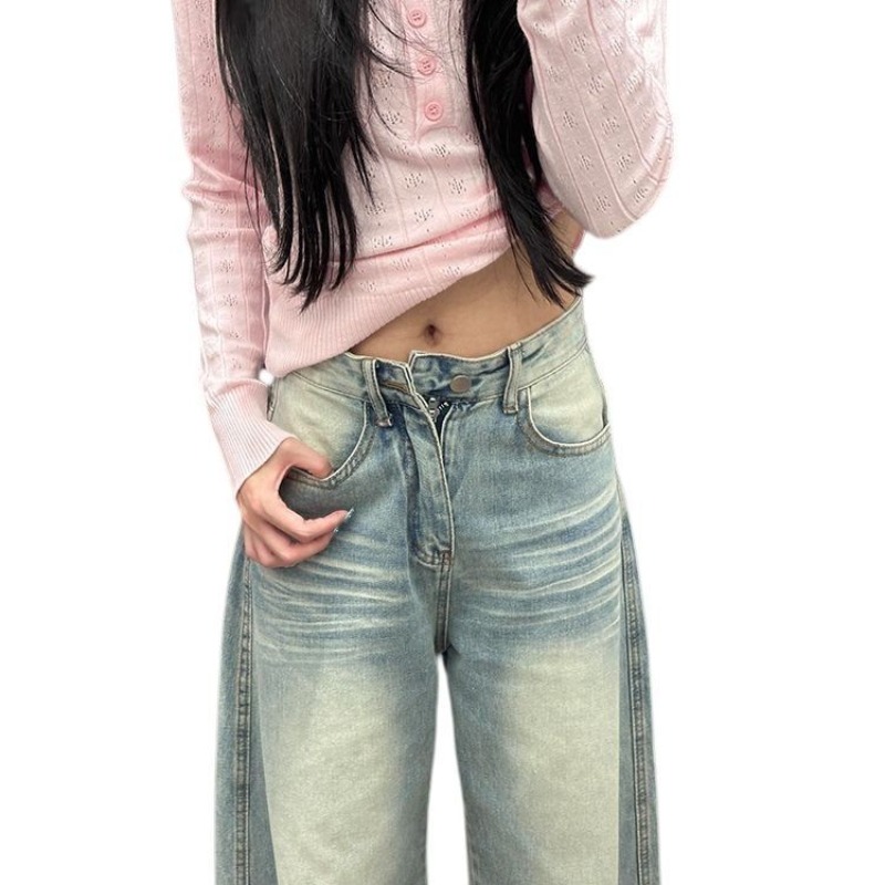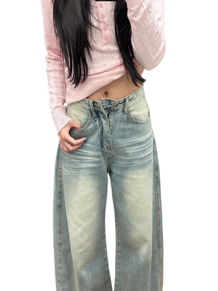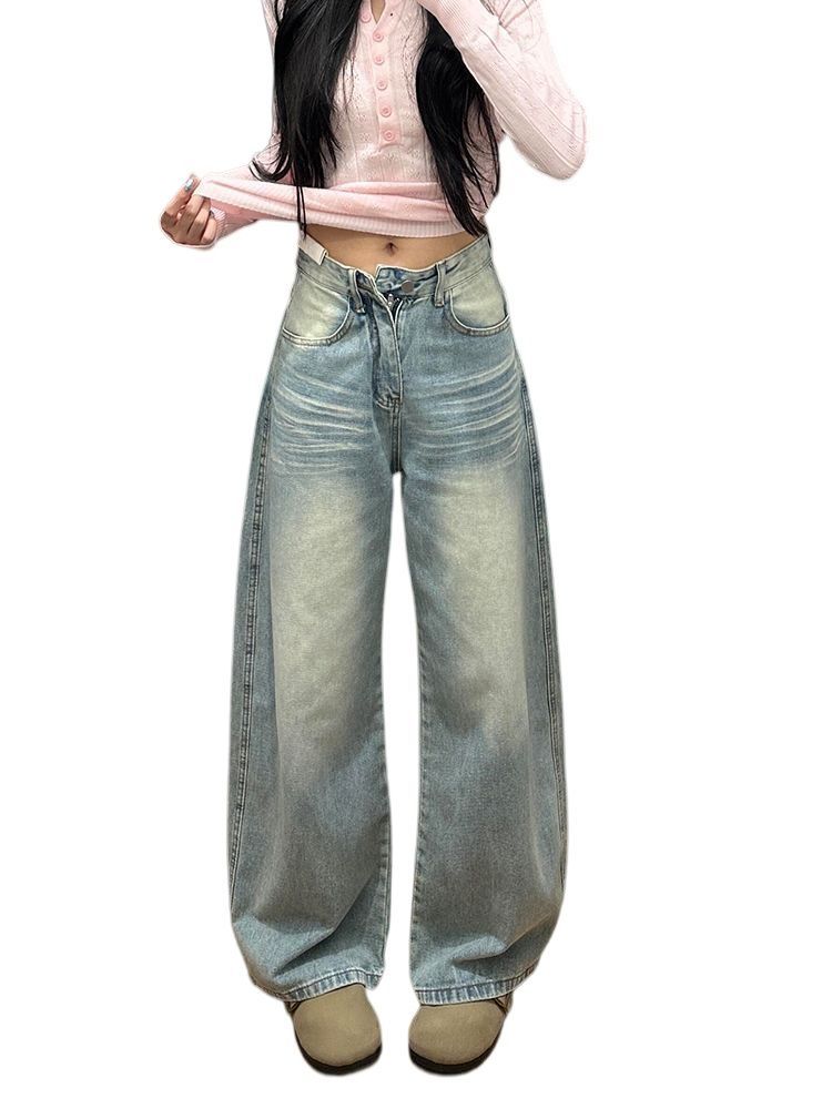 레트로 노스탤지어 워싱 루즈핏 청바지 여성 여름 하이웨이스트 다용도 하늘색 와이드 레그 팬츠 긴 바지 모통이 칼 바지