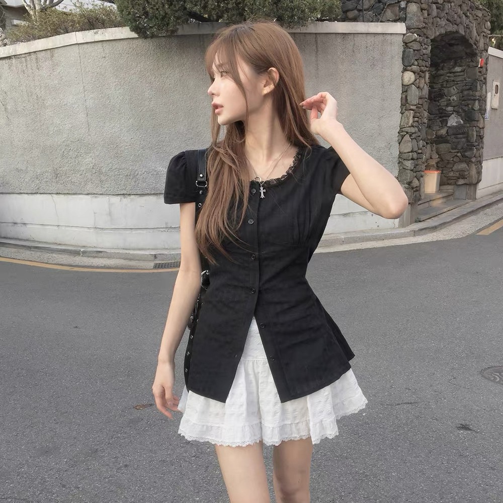 실사 새로운 중식 국풍 반팔 셔츠 2026 여름 새로운 여성 몸매 가꾸기 허리 수축 거품 소매 레이스 쉬폰 블라우스