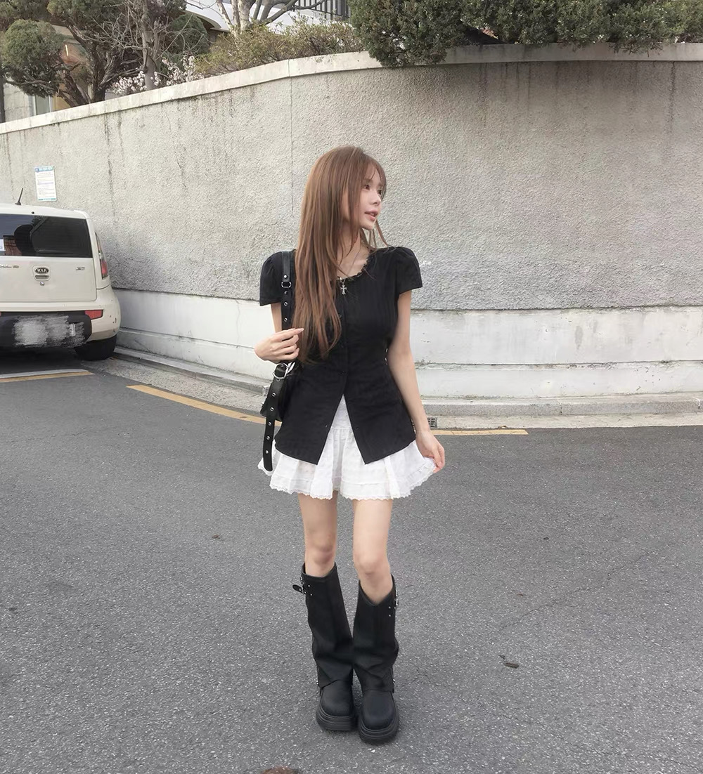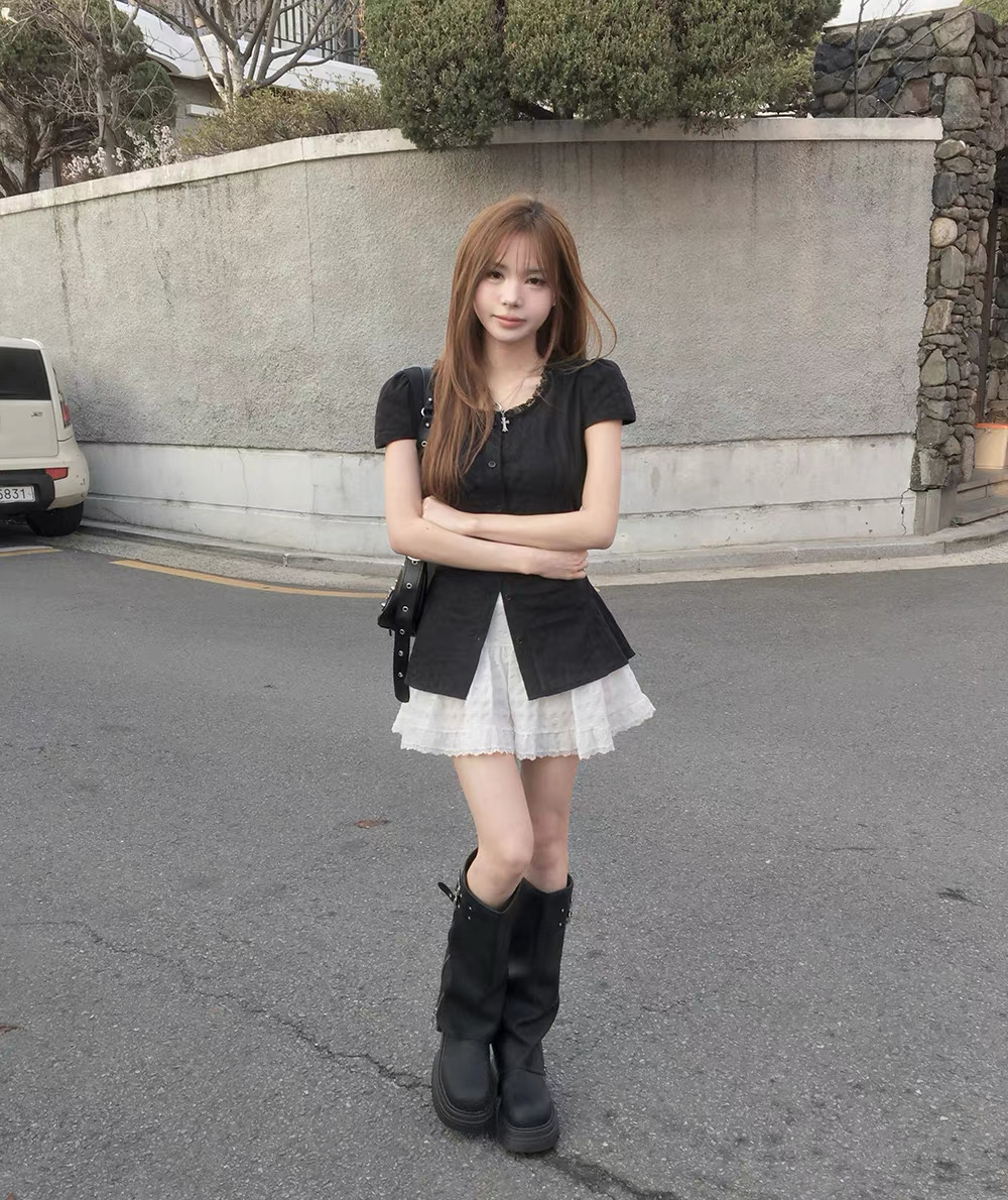 있음 선적 한국 ins 귀여운 ~ 중 반팔 Pleat 측면 니트 스웨터