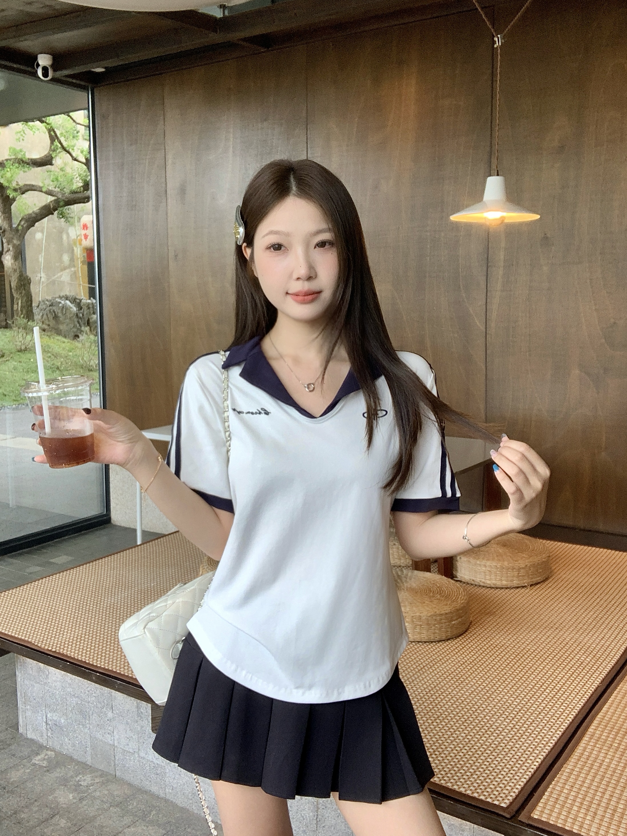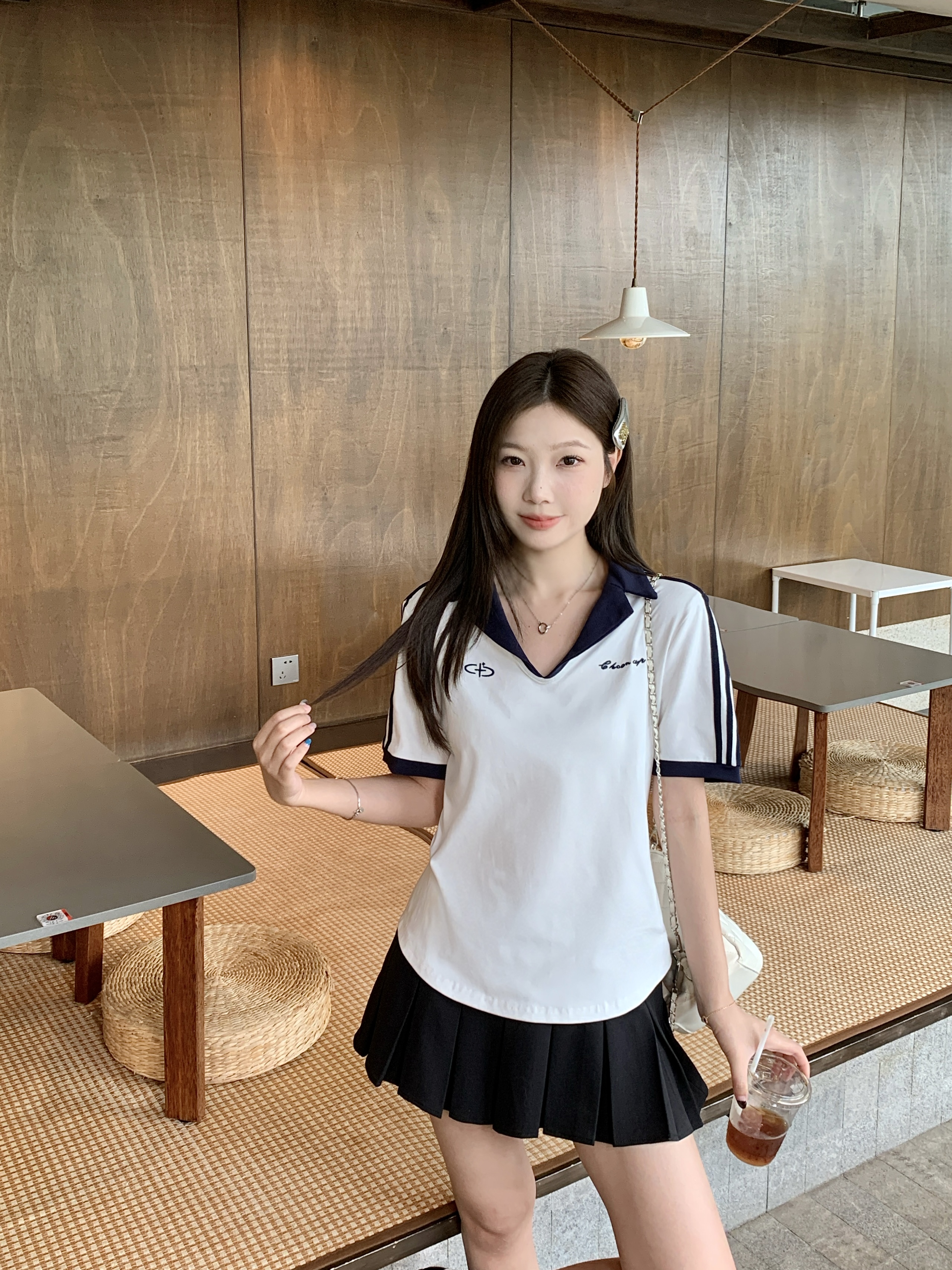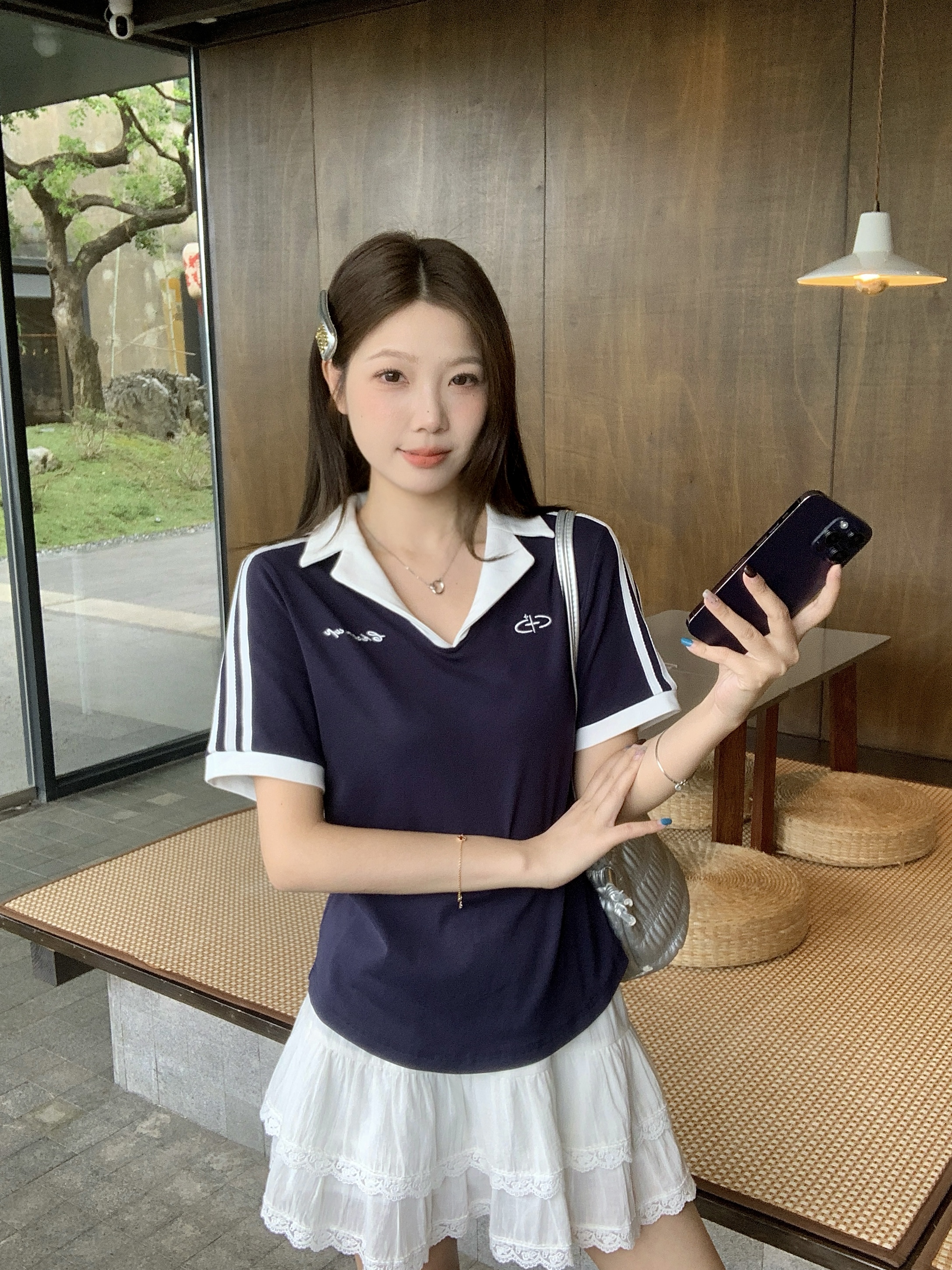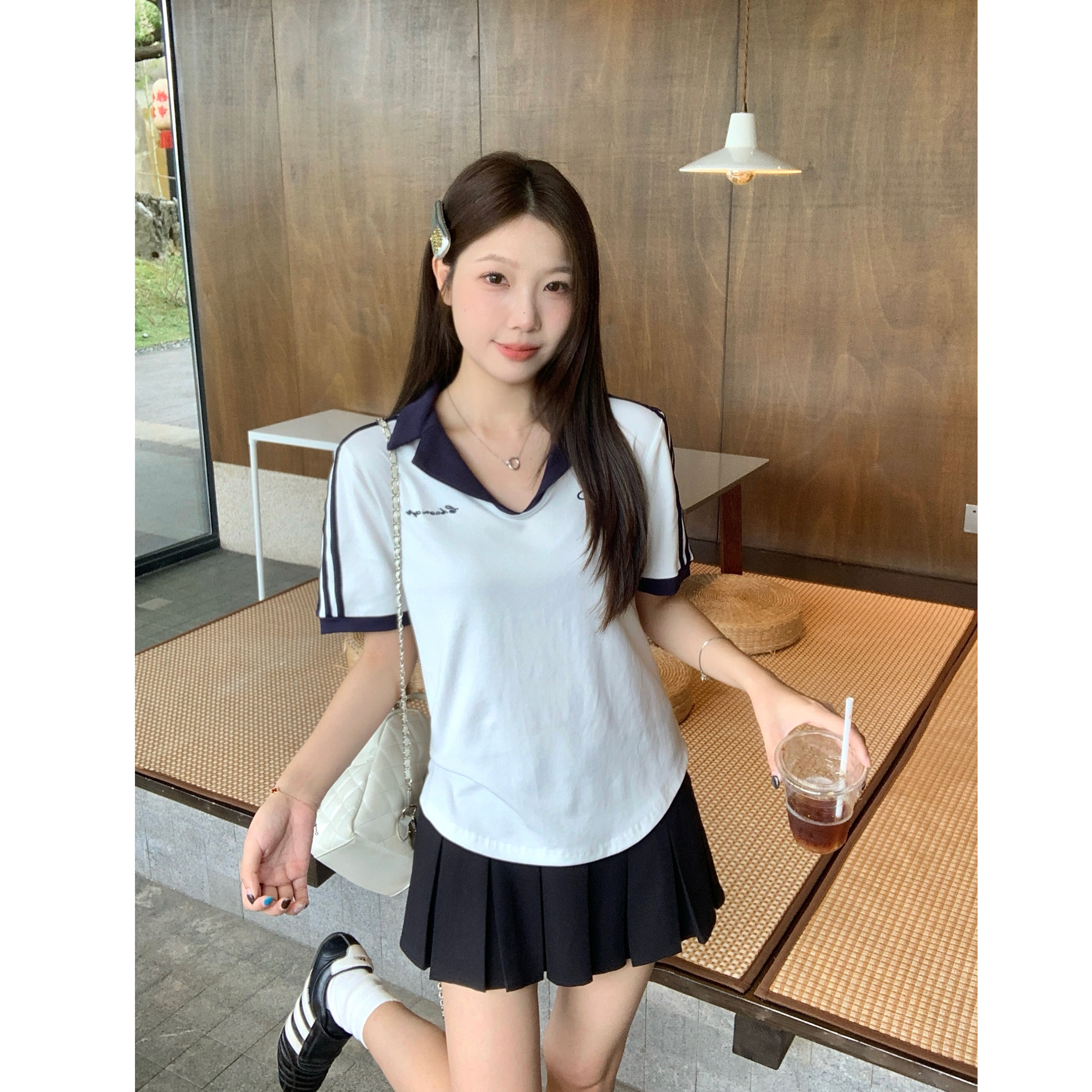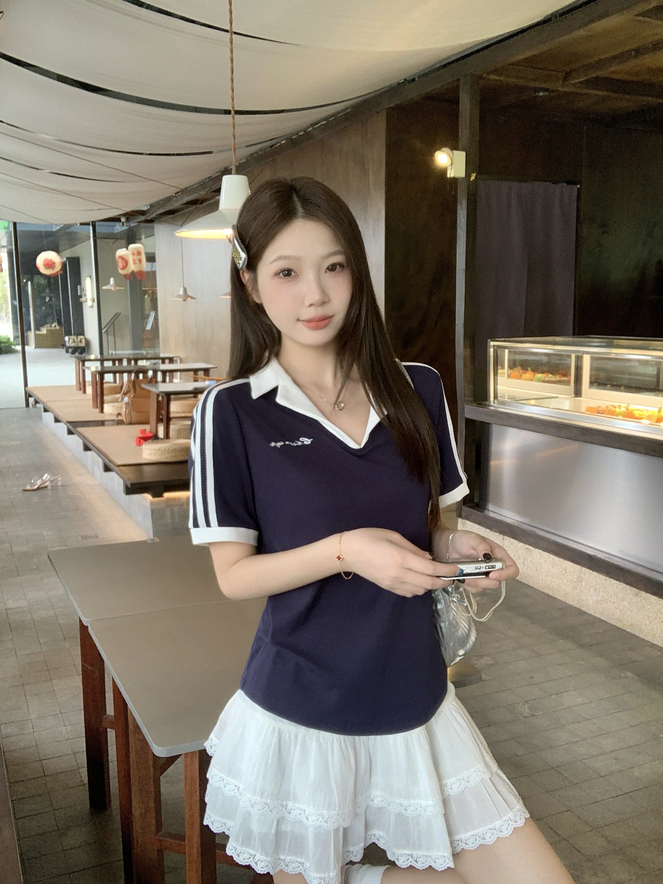 디자인 센스 V넥 긍정적 인 어깨 반팔 티셔츠 여성 2026 여름 새로운 지방 mm 고유 한 작은 셔츠 불규칙 펌프 로프 맨위