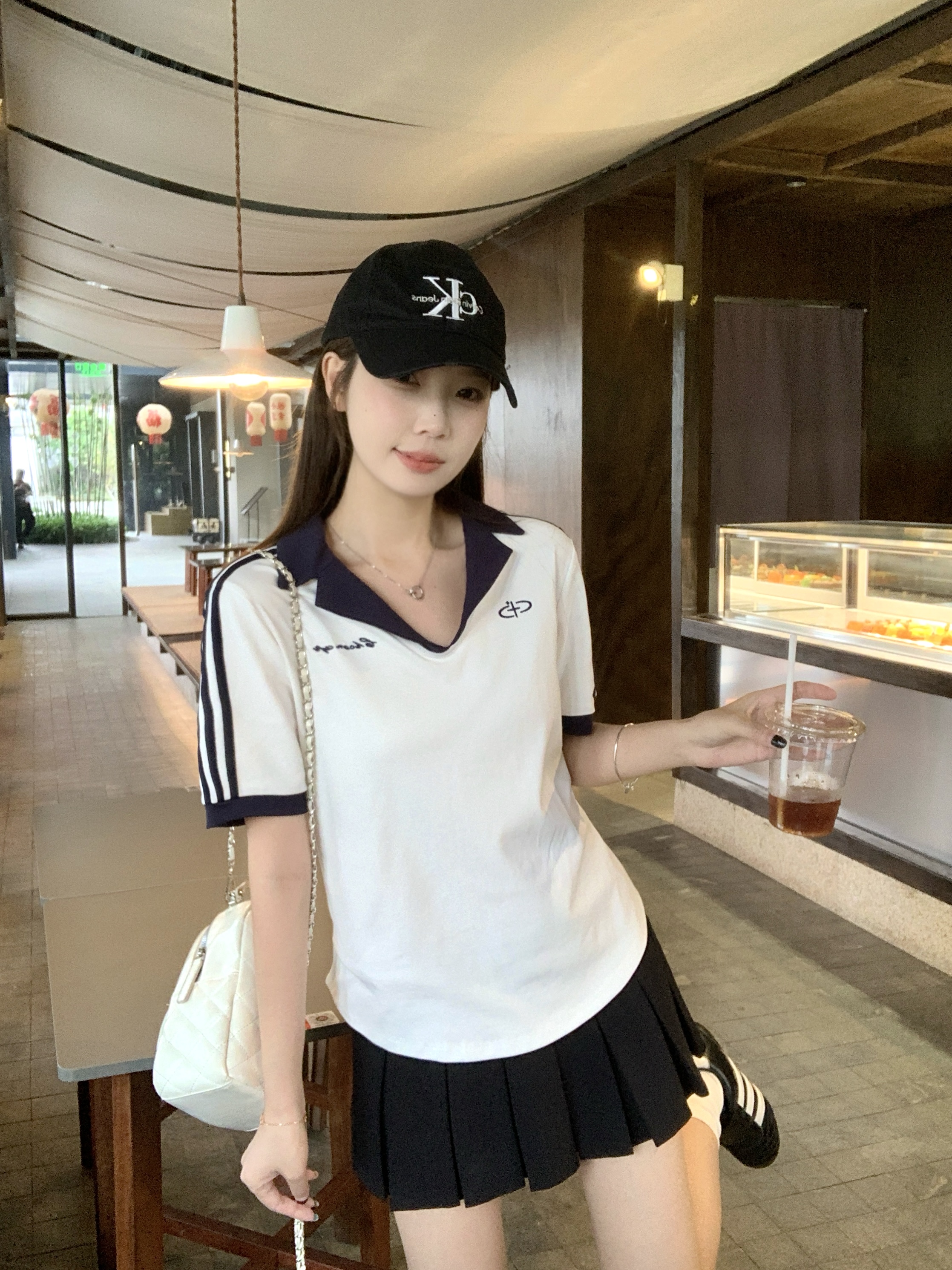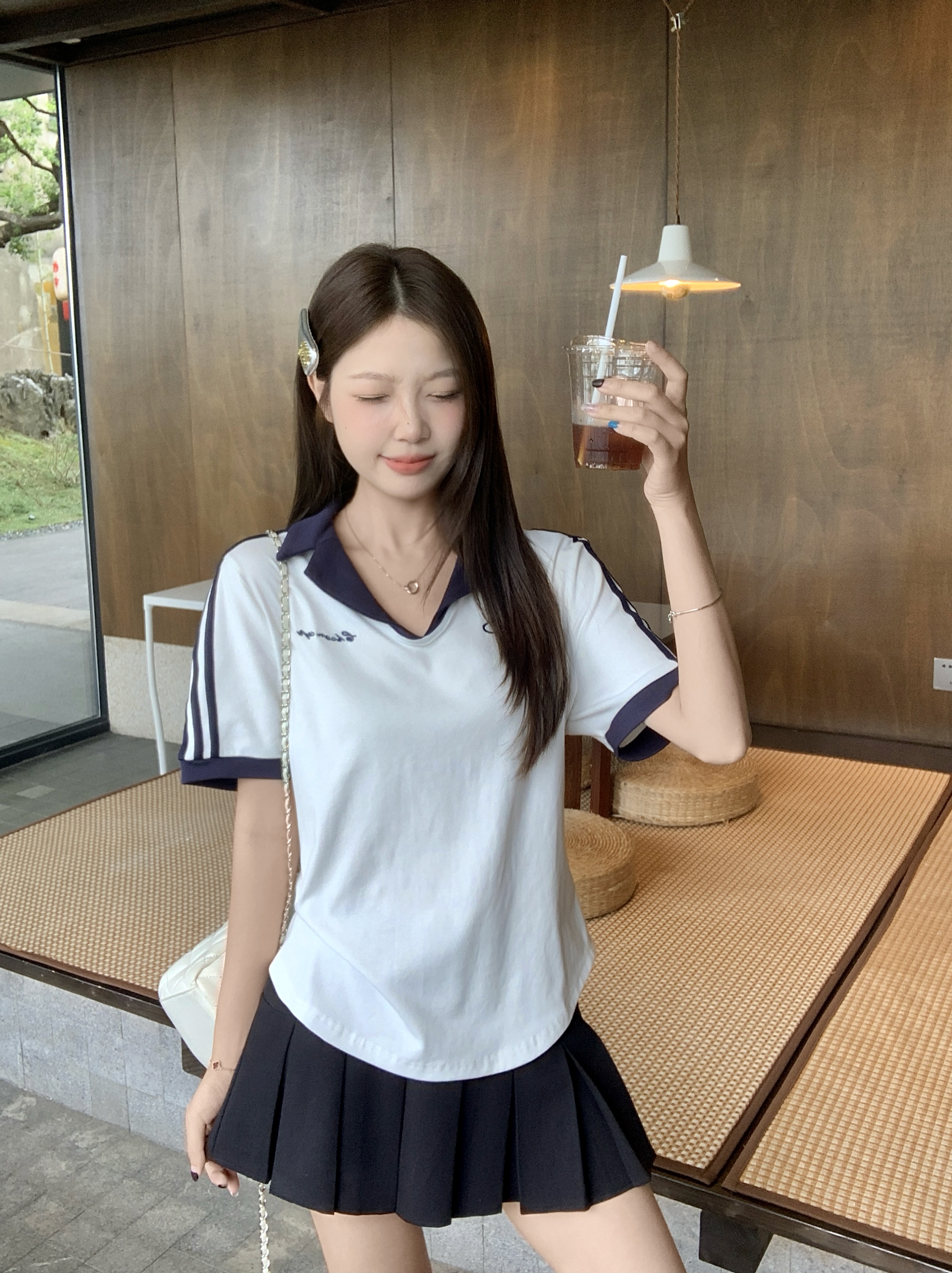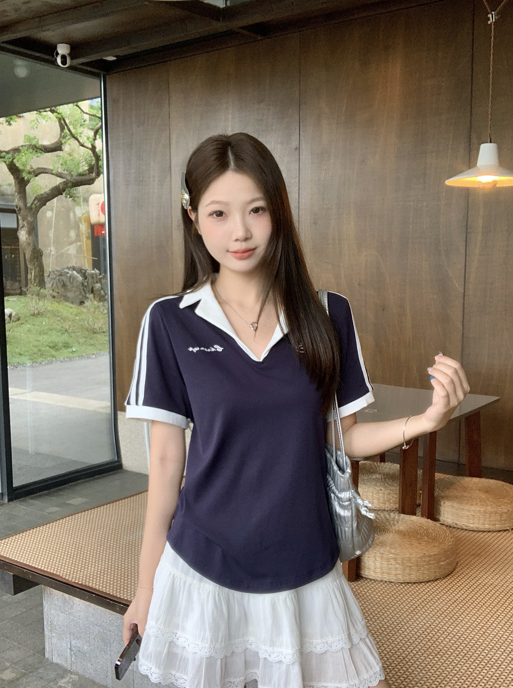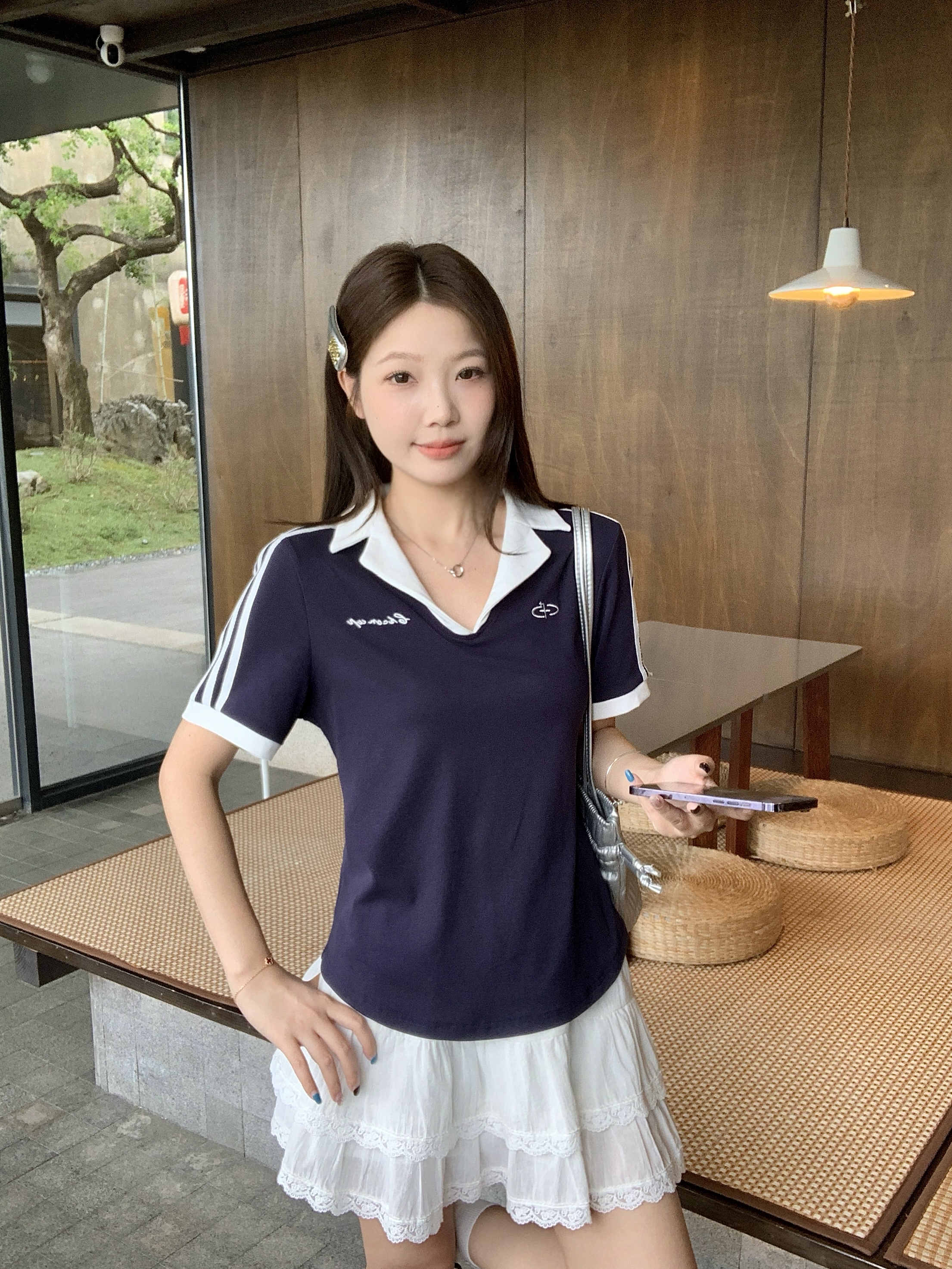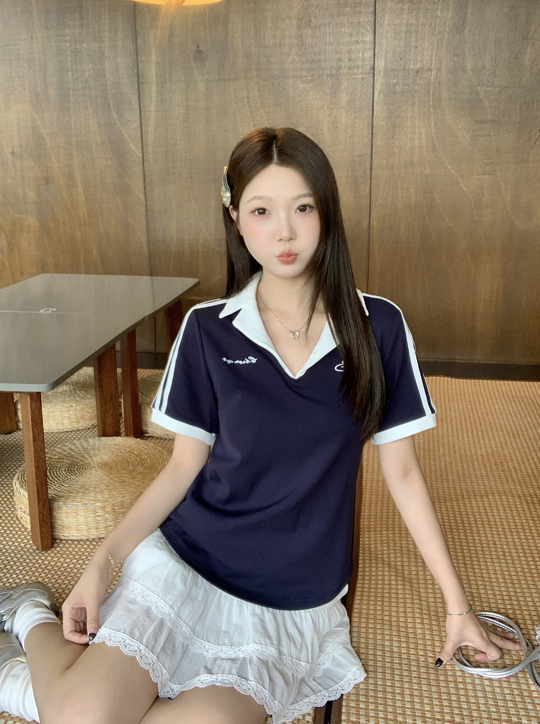 디자인 센스 V넥 긍정적 인 어깨 반팔 티셔츠 여성 2026 여름 새로운 지방 mm 고유 한 작은 셔츠 불규칙 펌프 로프 맨위
