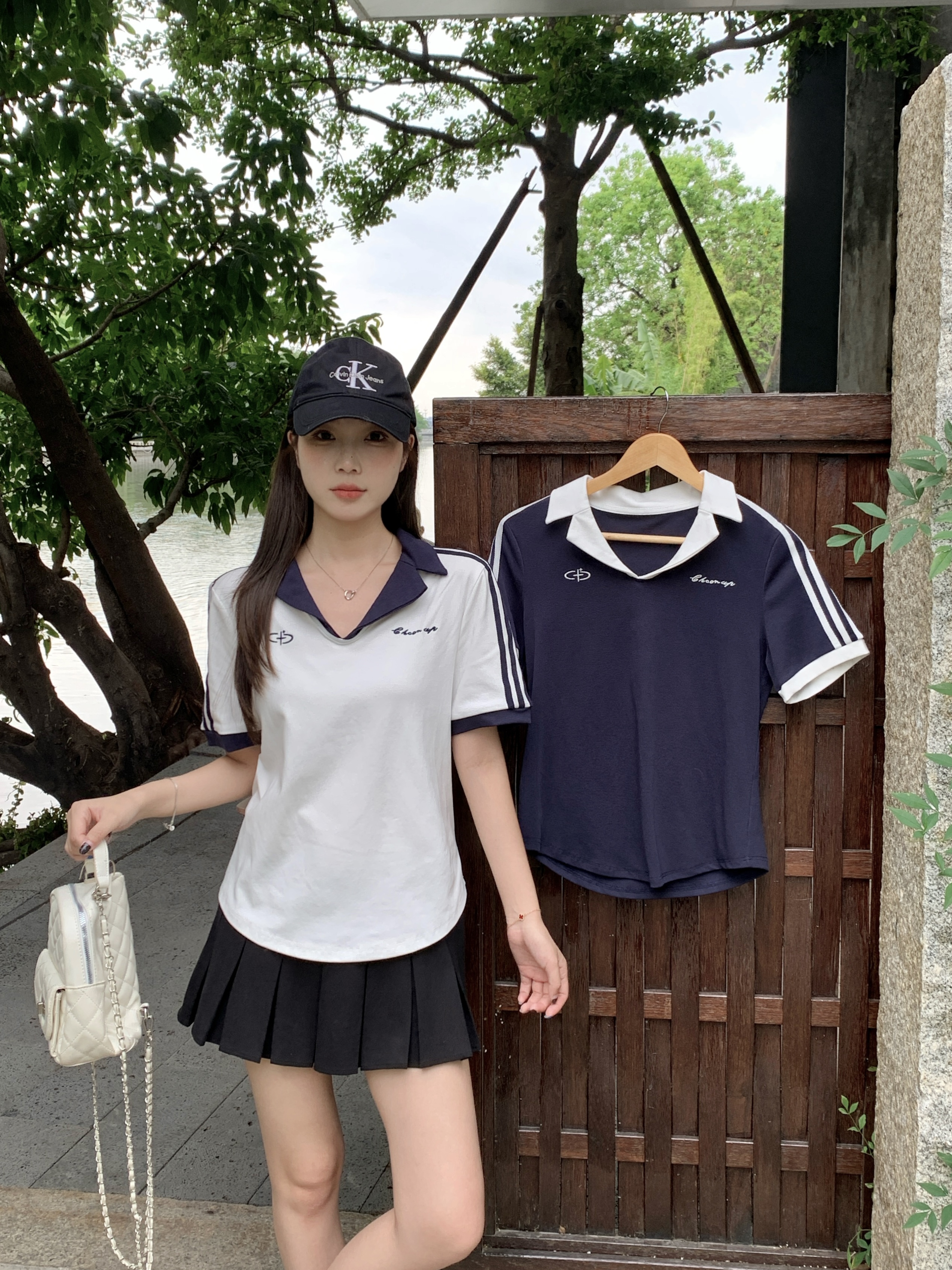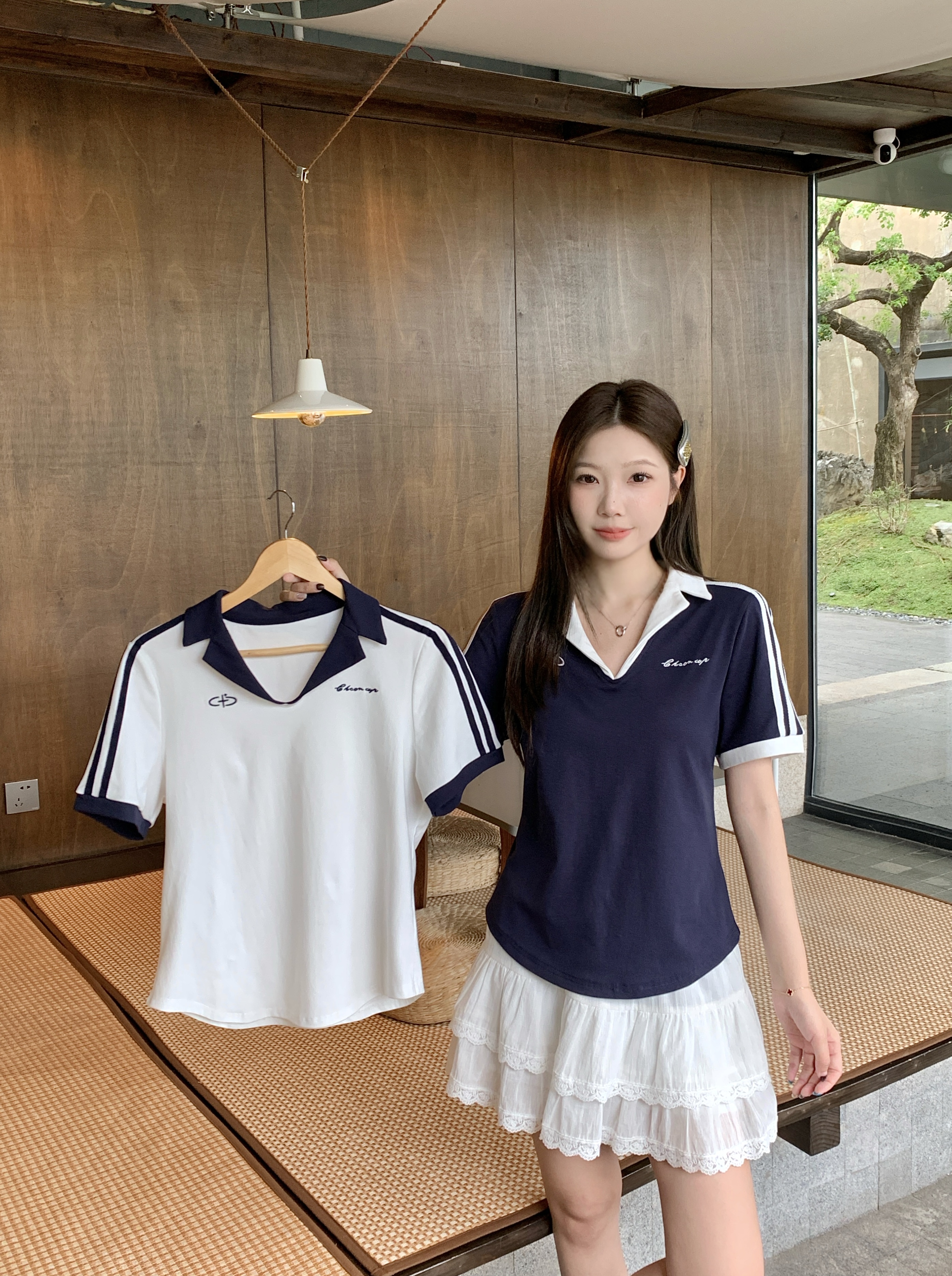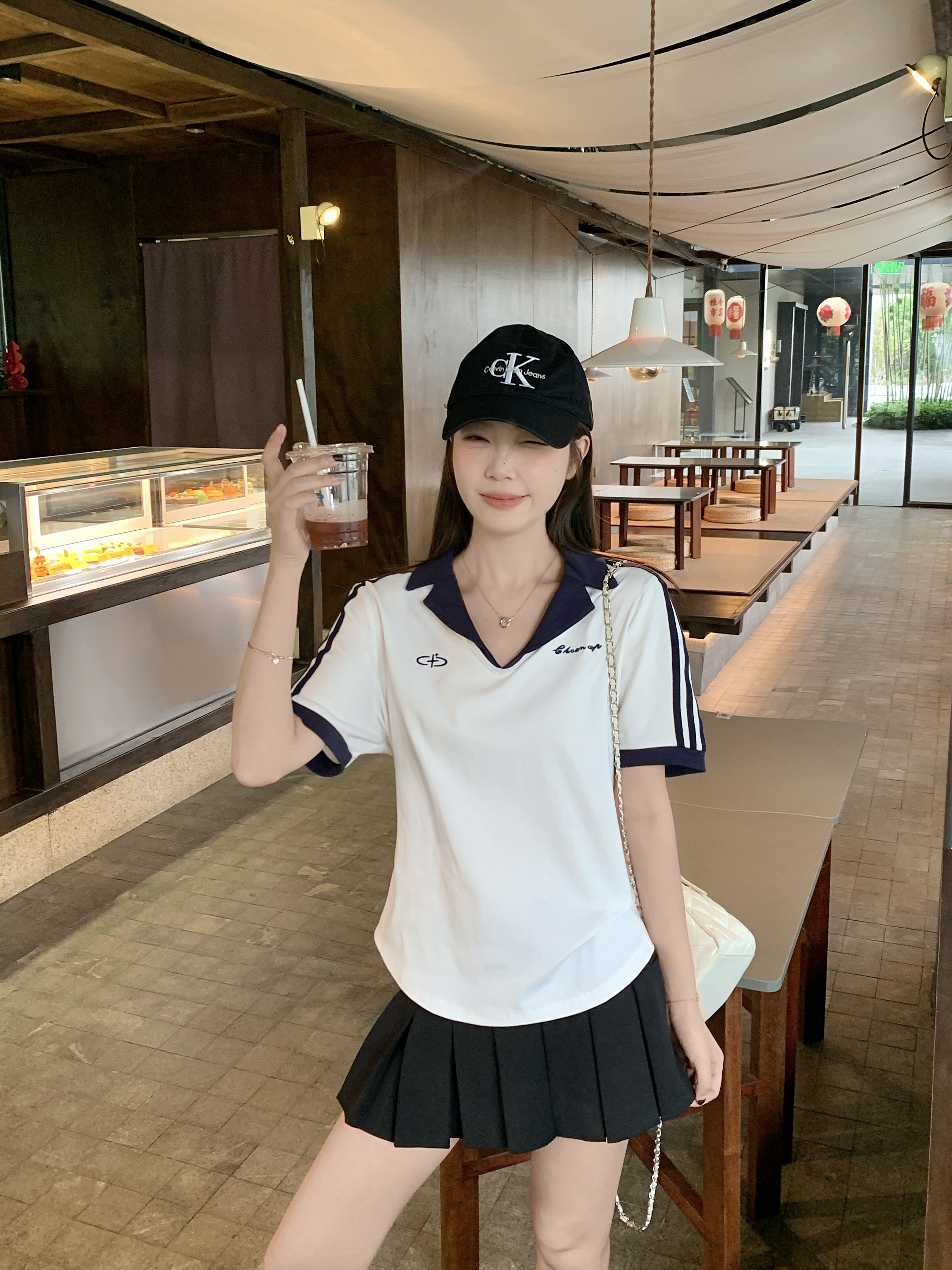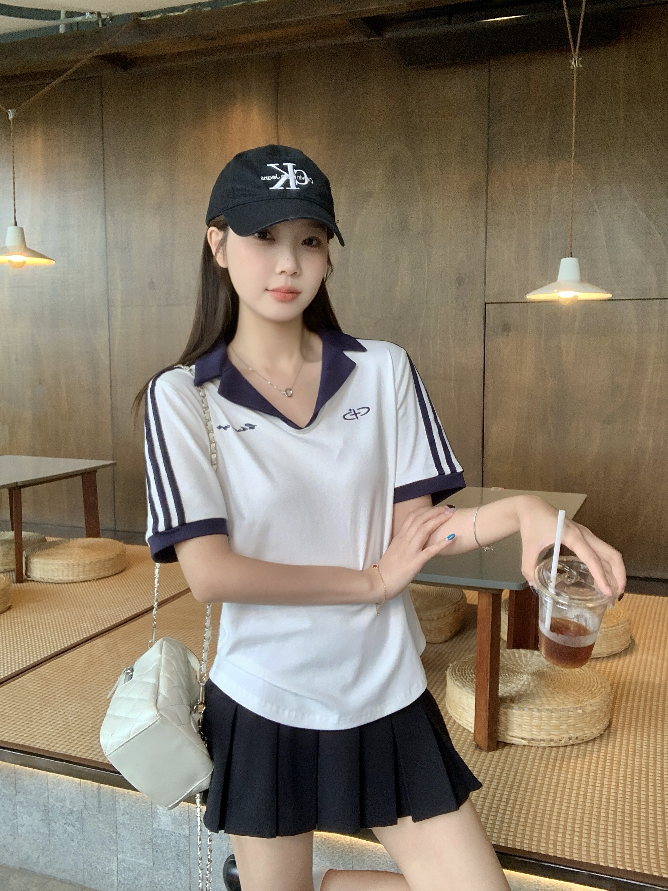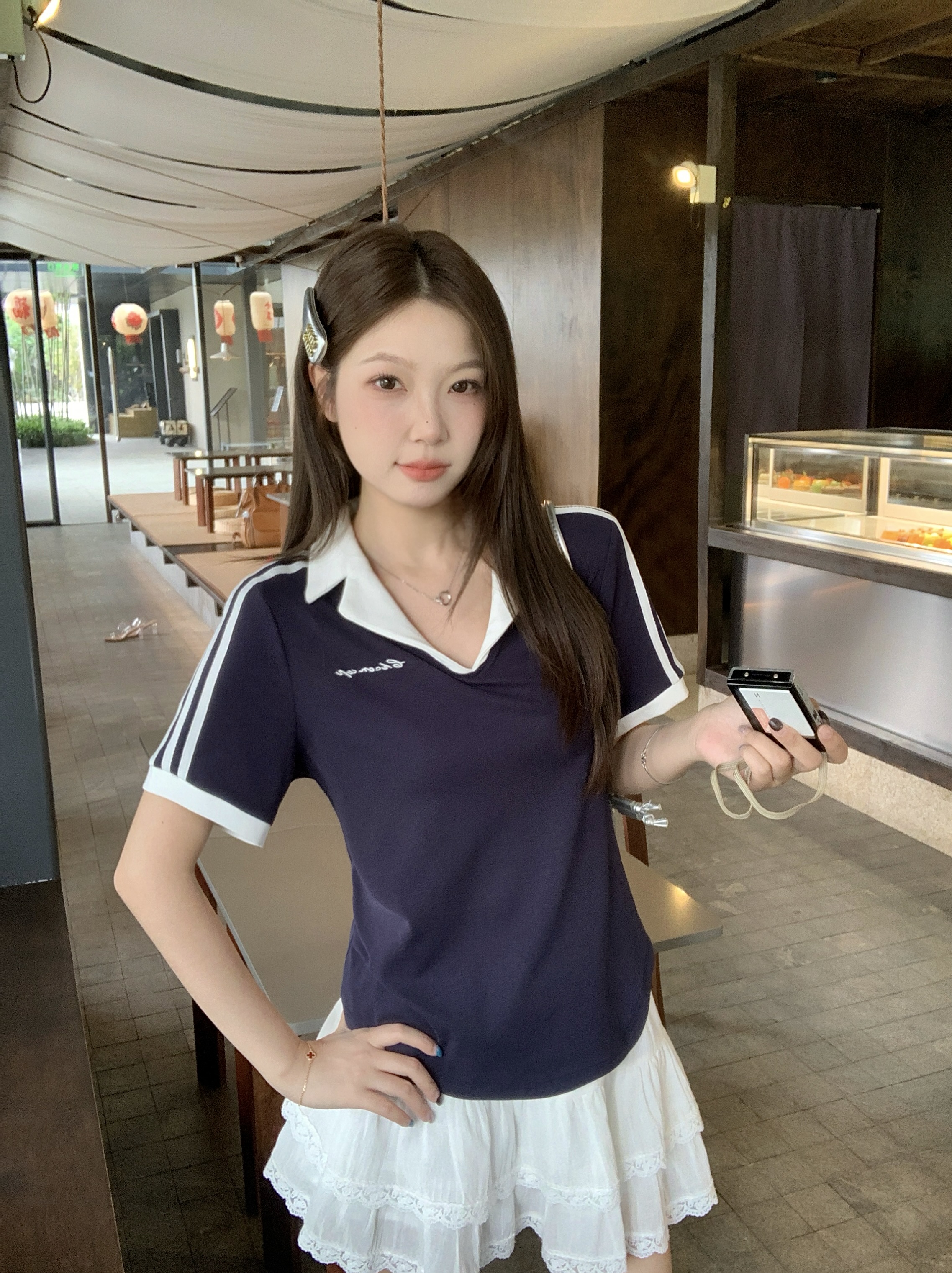 디자인 센스 V넥 긍정적 인 어깨 반팔 티셔츠 여성 2026 여름 새로운 지방 mm 고유 한 작은 셔츠 불규칙 펌프 로프 맨위