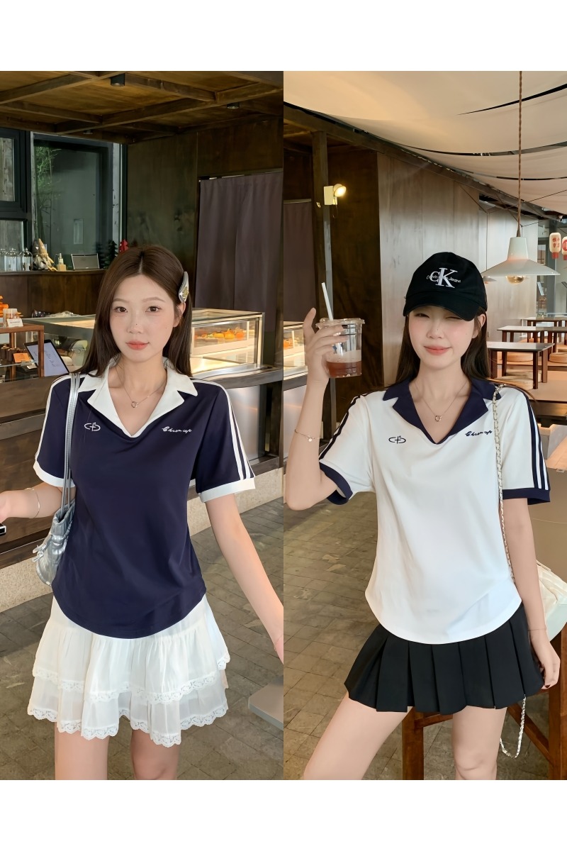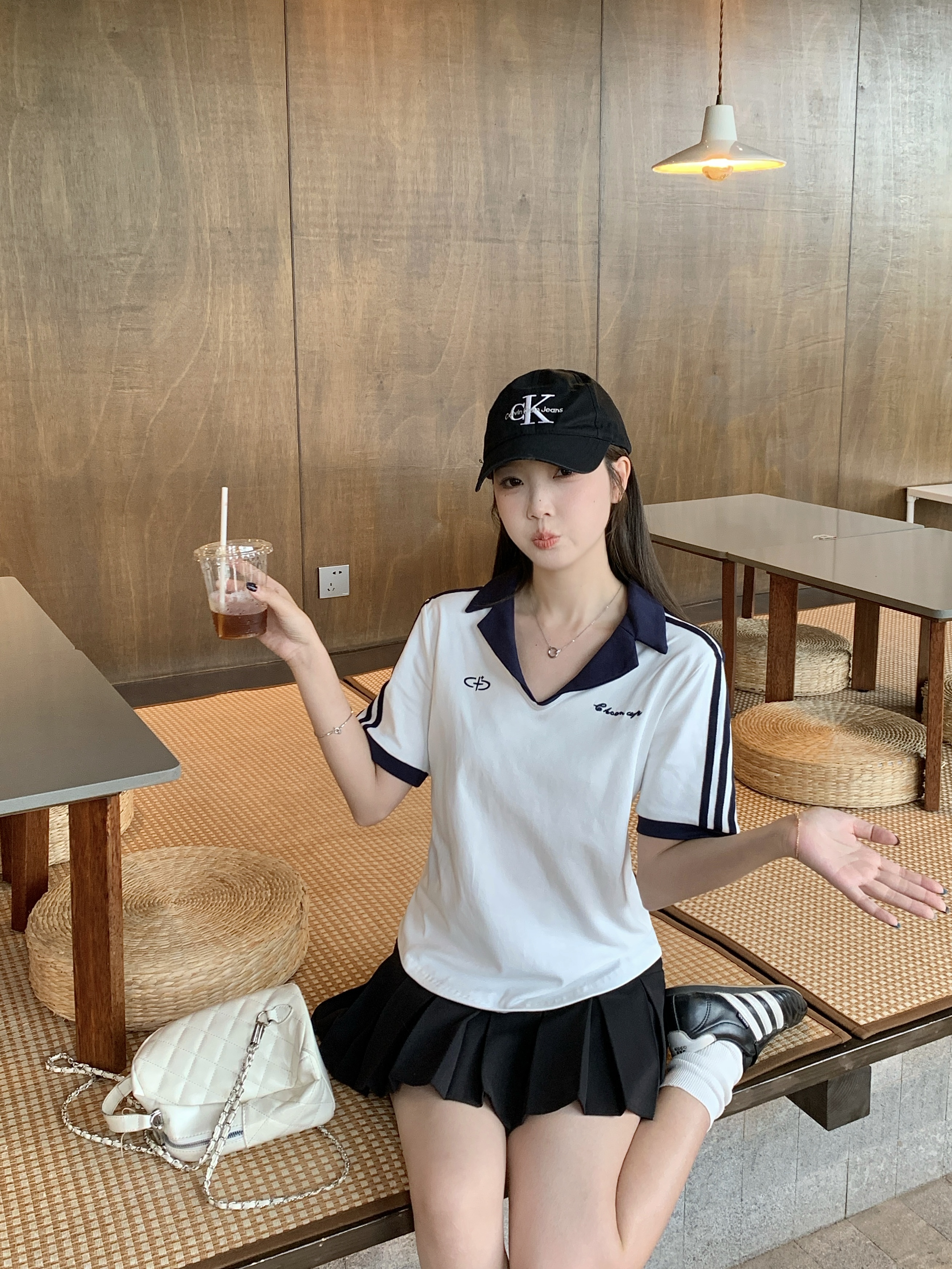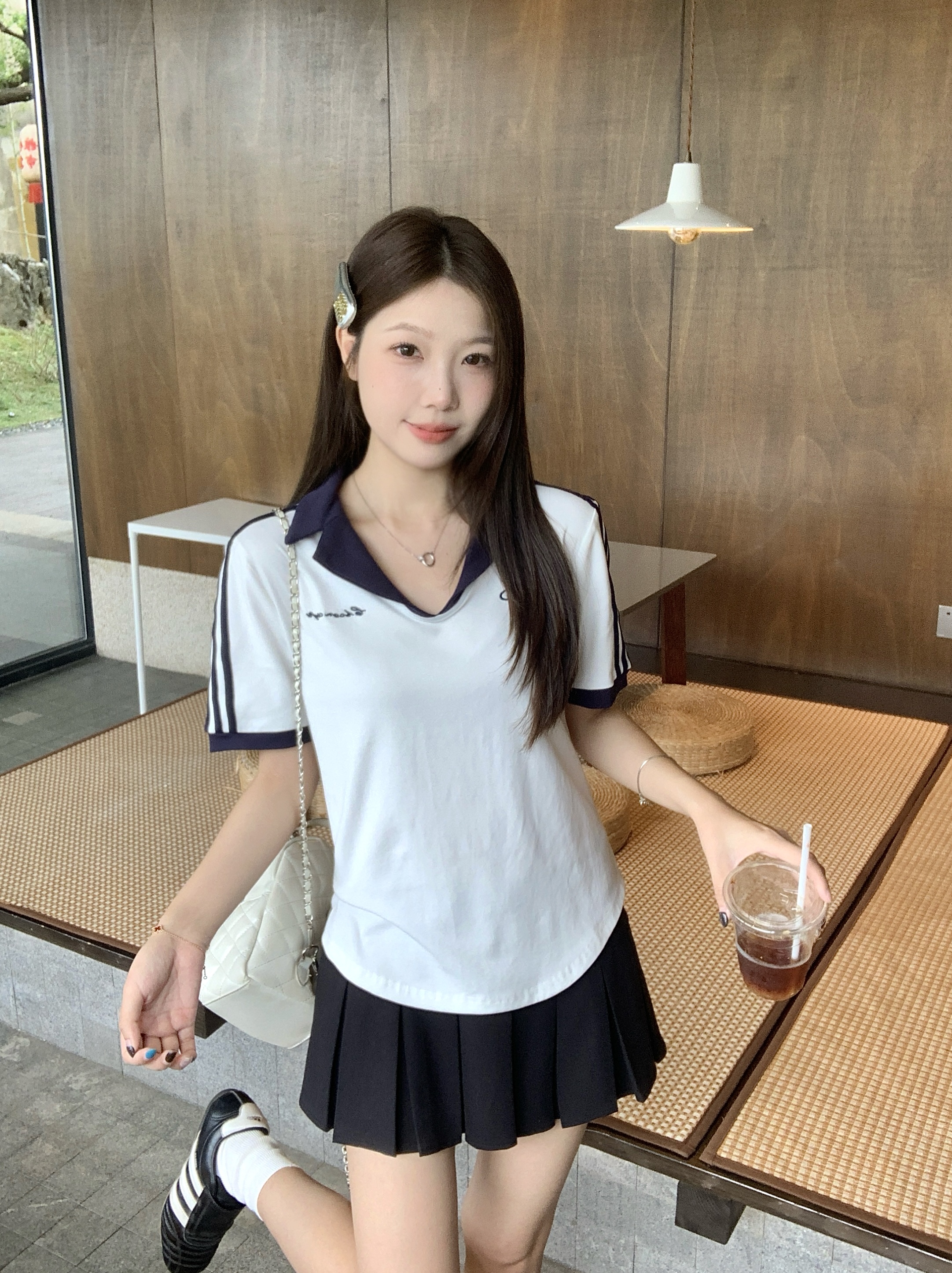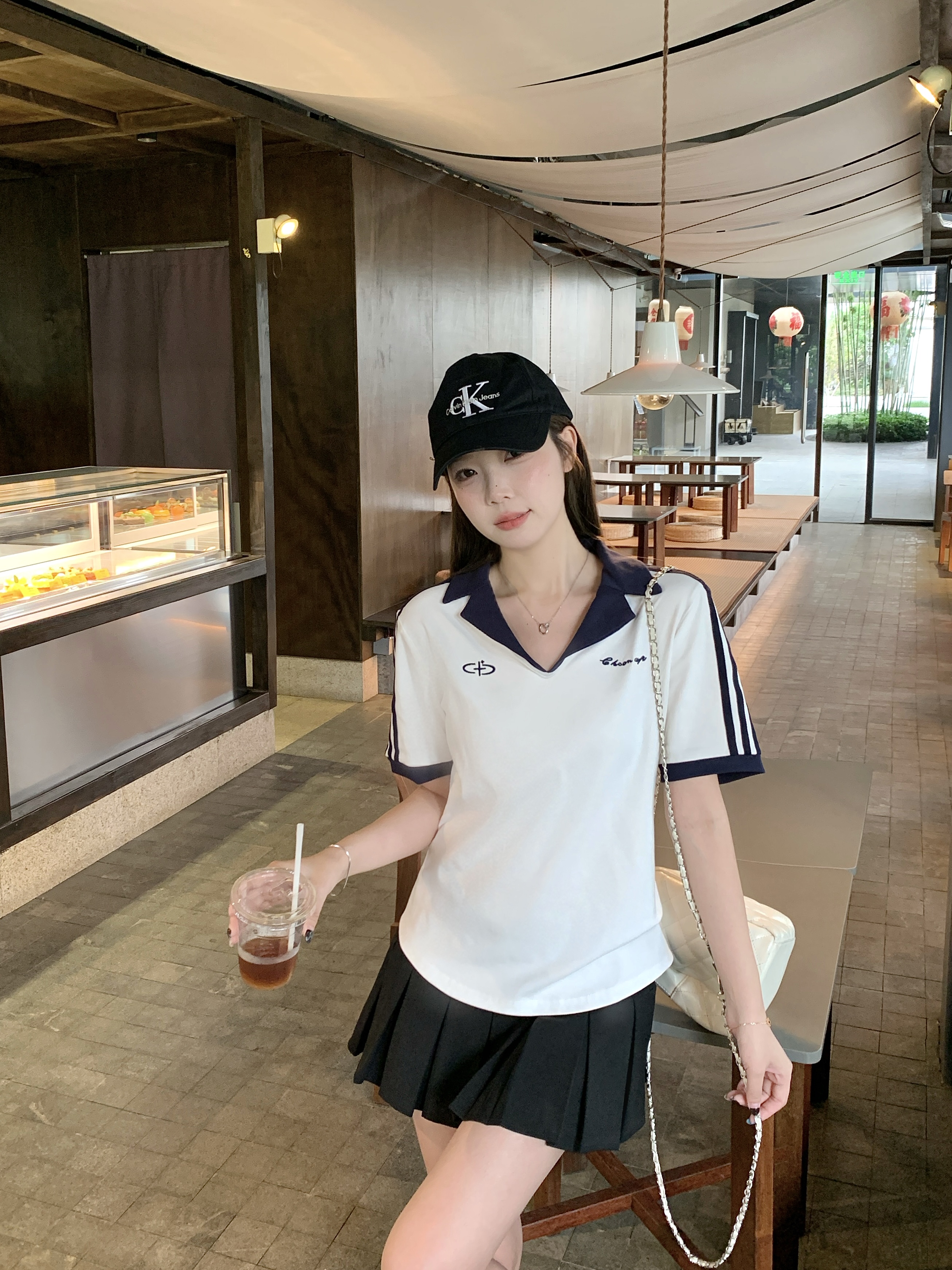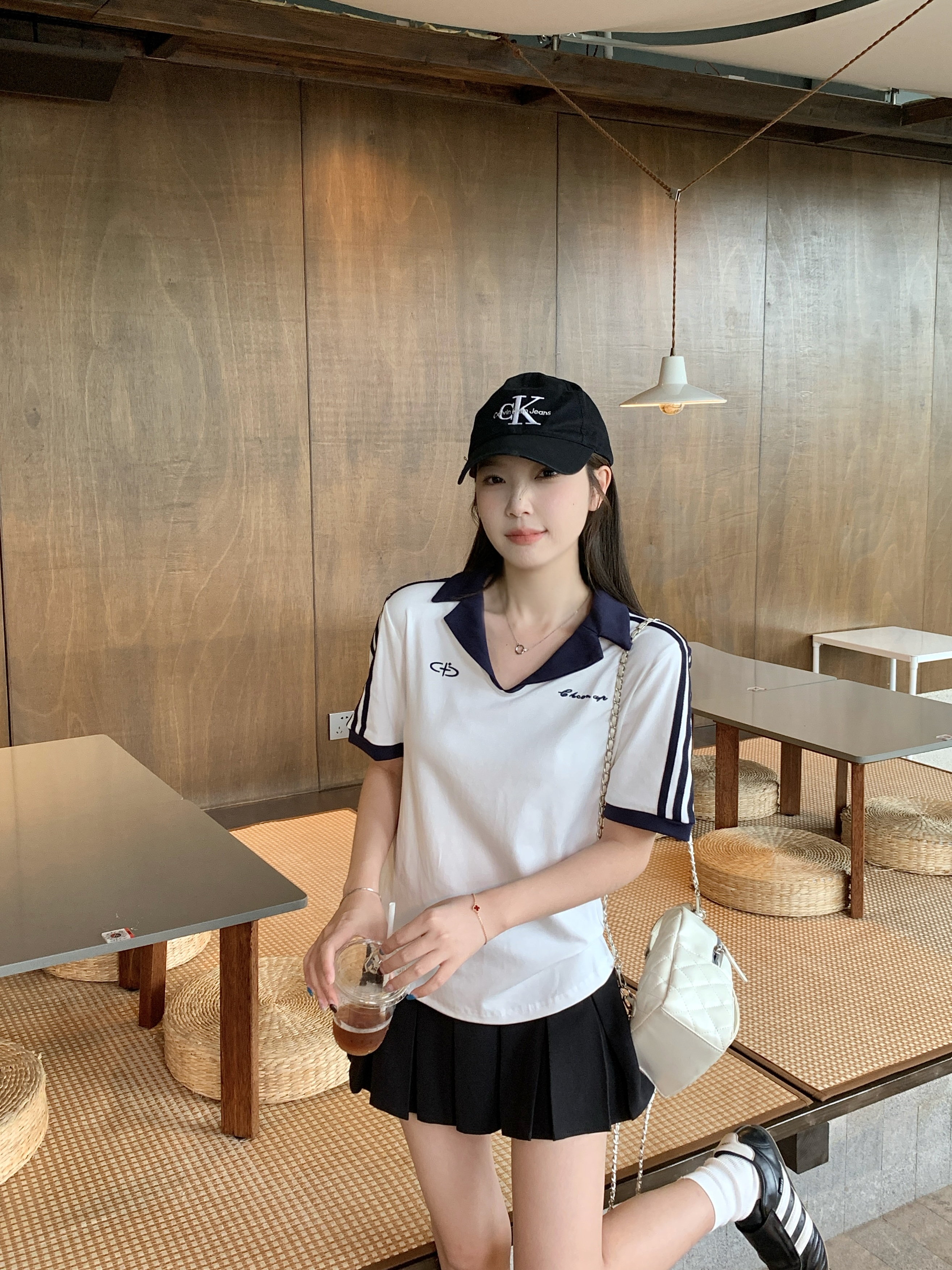 디자인 센스 V넥 긍정적 인 어깨 반팔 티셔츠 여성 2026 여름 새로운 지방 mm 고유 한 작은 셔츠 불규칙 펌프 로프 맨위