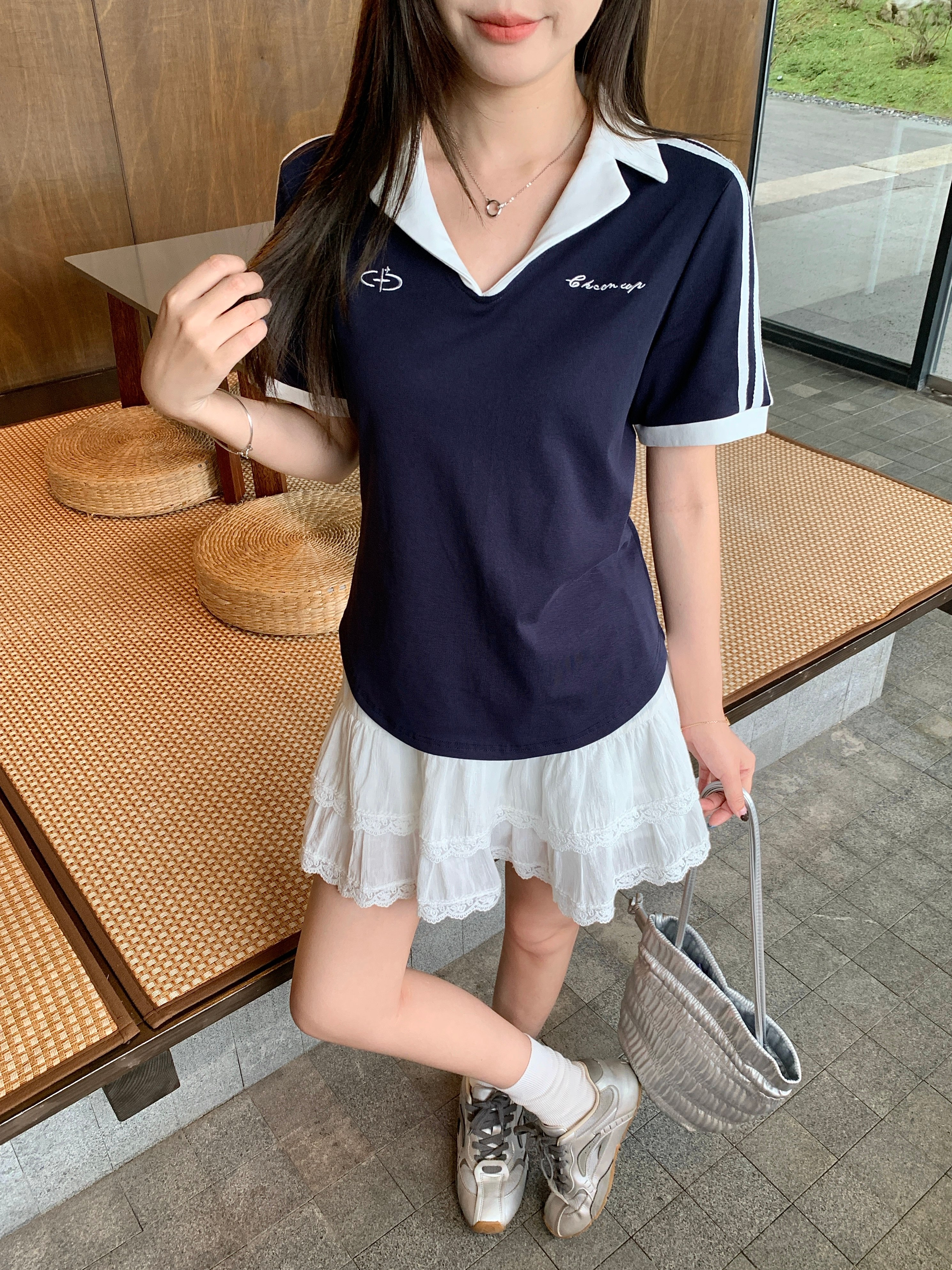 실사 2026 여름 드레스 새로운 지방 mm 빅 사이즈 디자인 센스 슬림해 보이는 반팔 맨위 페이크 레이어드 배색 패치워크 셔츠