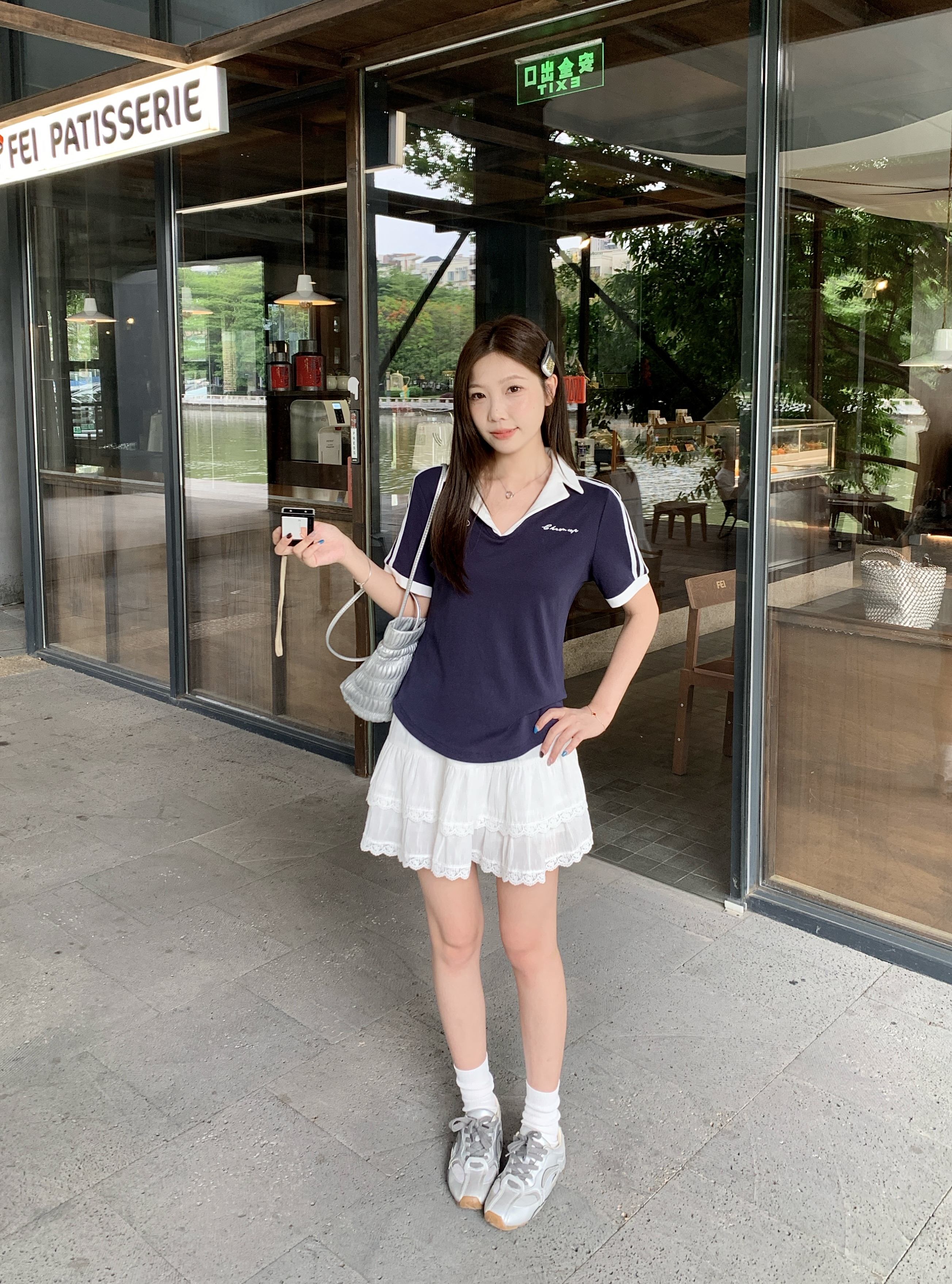 실사 2026 여름 새로운 지방 mm 빅 사이즈 달콤한 매운맛 알파벳 레이스 V넥 반팔 티셔츠 작은 키 몸매 가꾸기 맨위