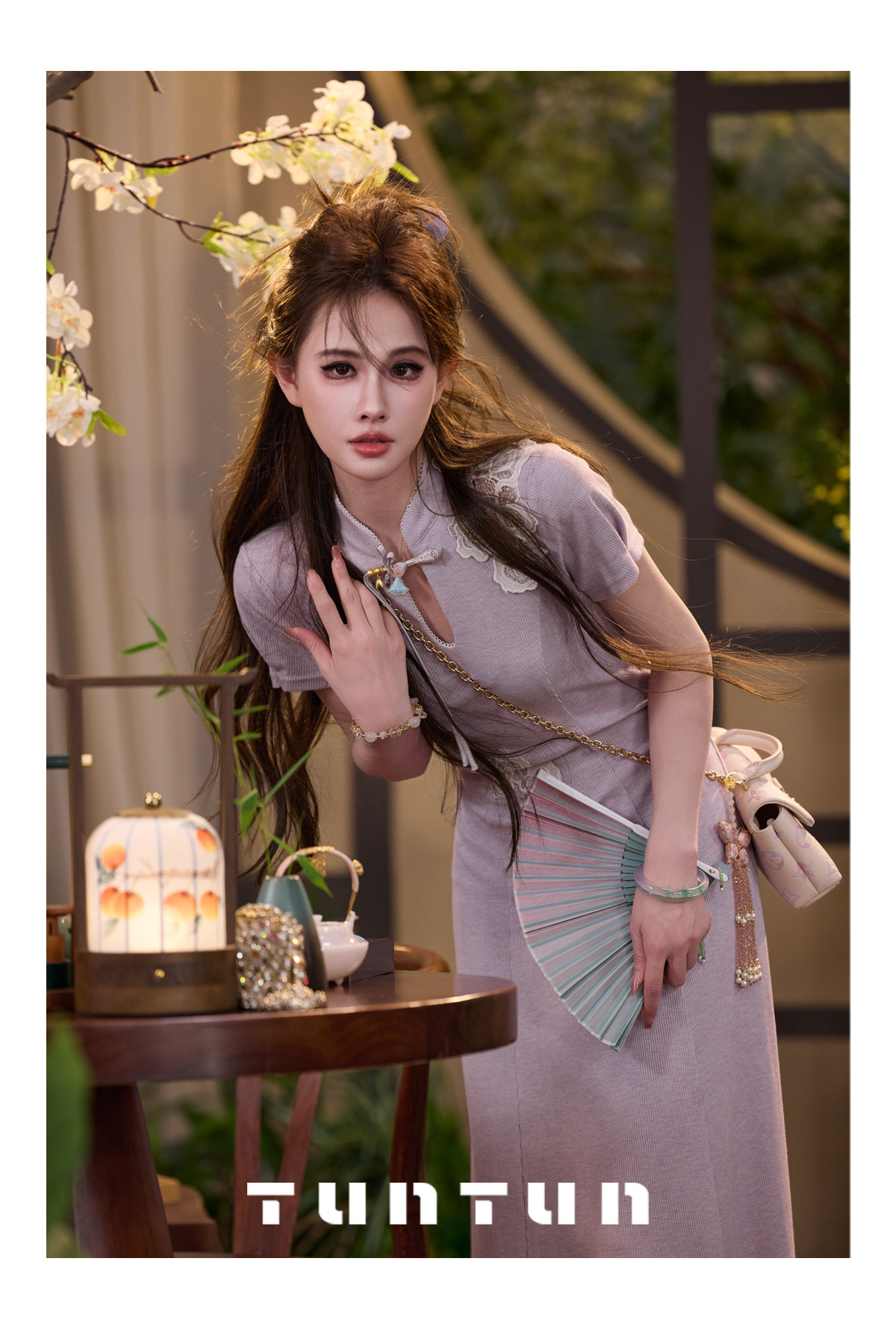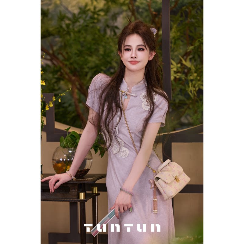 삼키기 tunt 봄 여름 동양의 아름다움 새로운 중식 치파오 연기 보라색 단추 레이스 니트 드레스