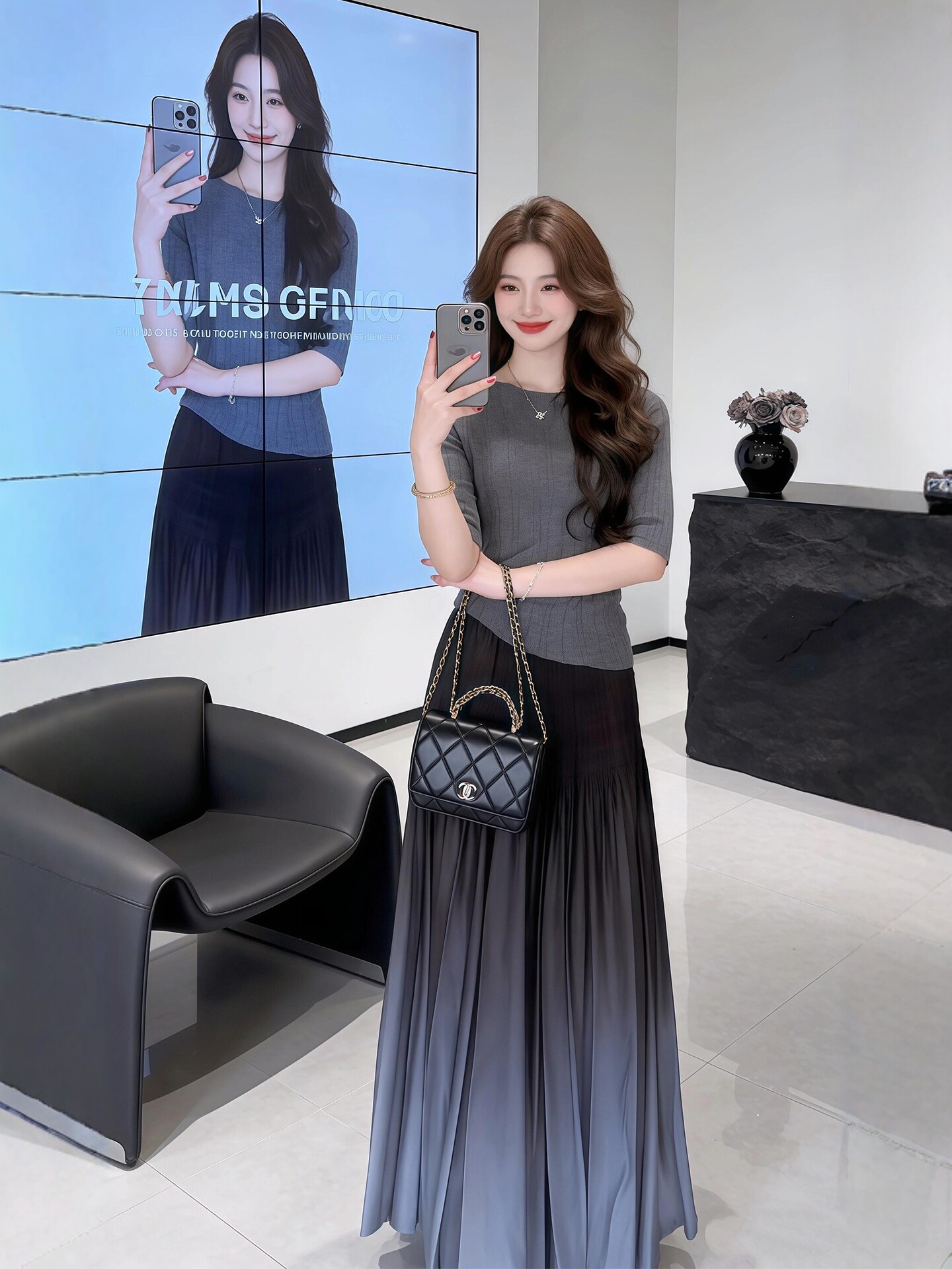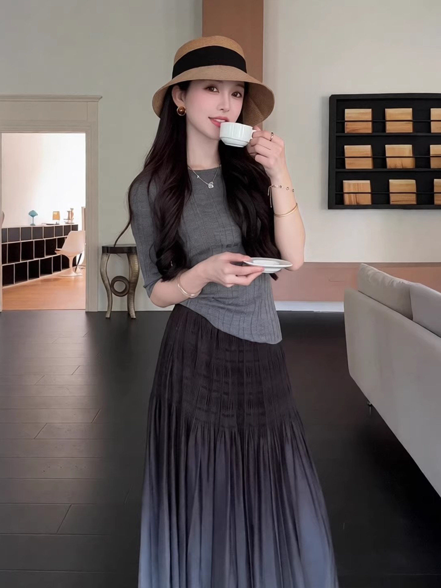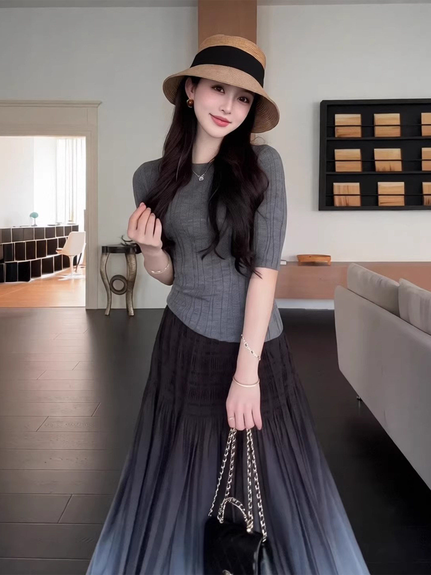 여름 코디 전체 집합 빅 사이즈 지방 mm 중간 소매 니트 스웨터 맨위 망사 반신 스커트 느긋한 레트로 세트 여성