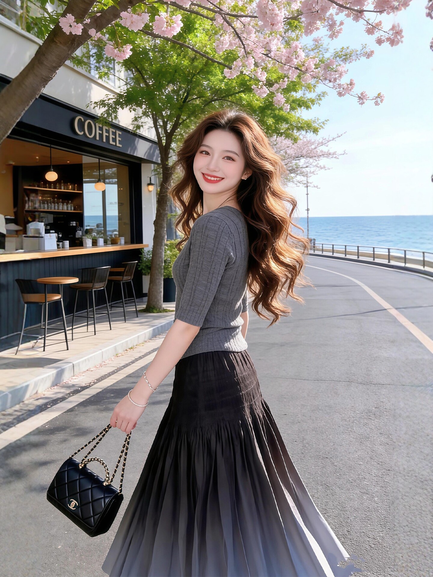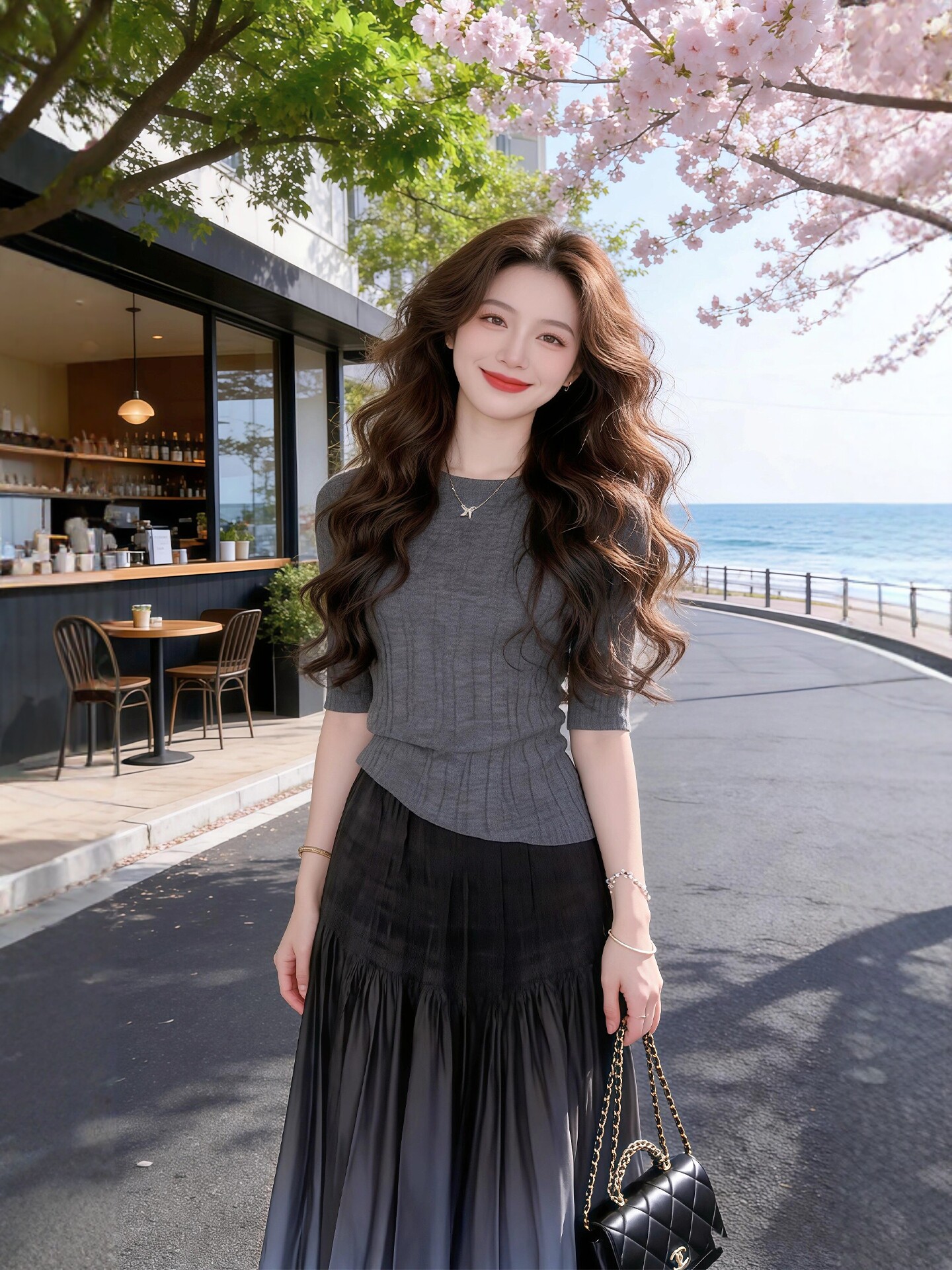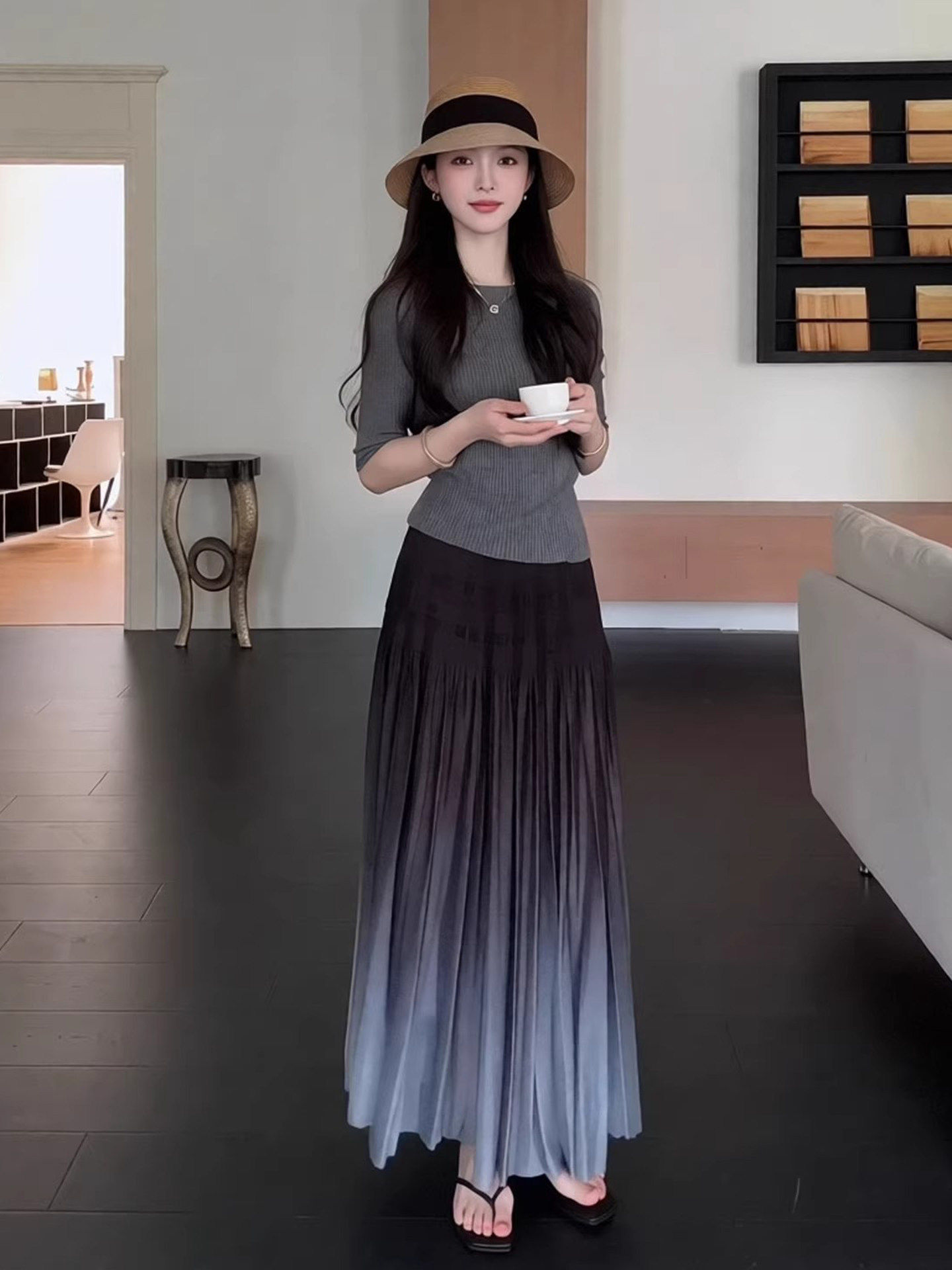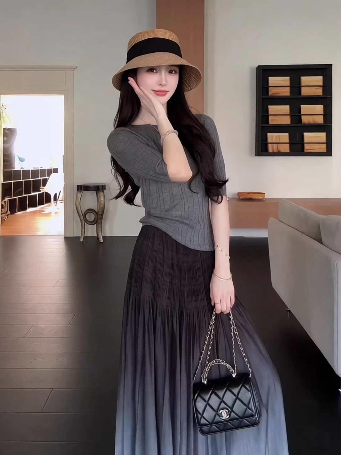 여름 코디 전체 집합 빅 사이즈 지방 mm 중간 소매 니트 스웨터 맨위 망사 반신 스커트 느긋한 레트로 세트 여성