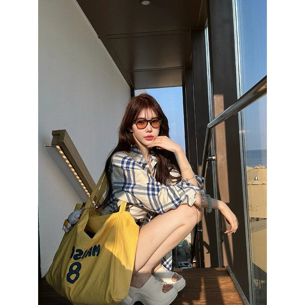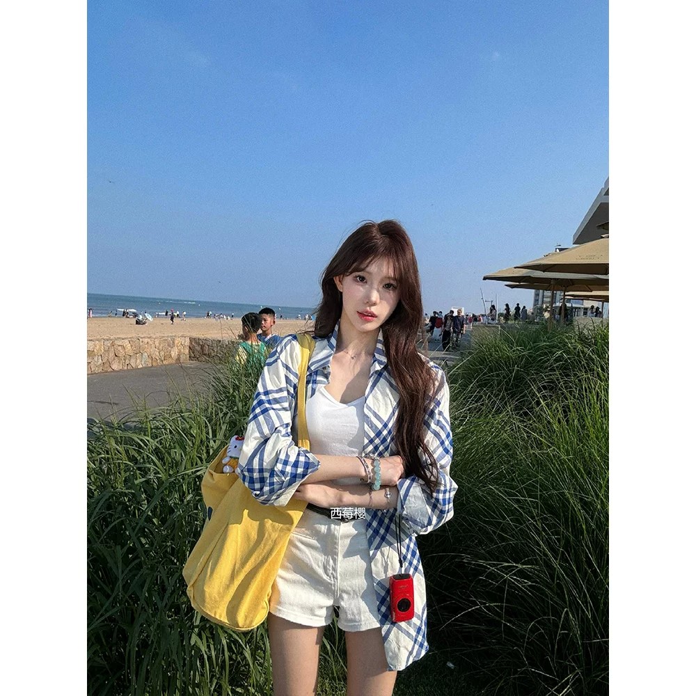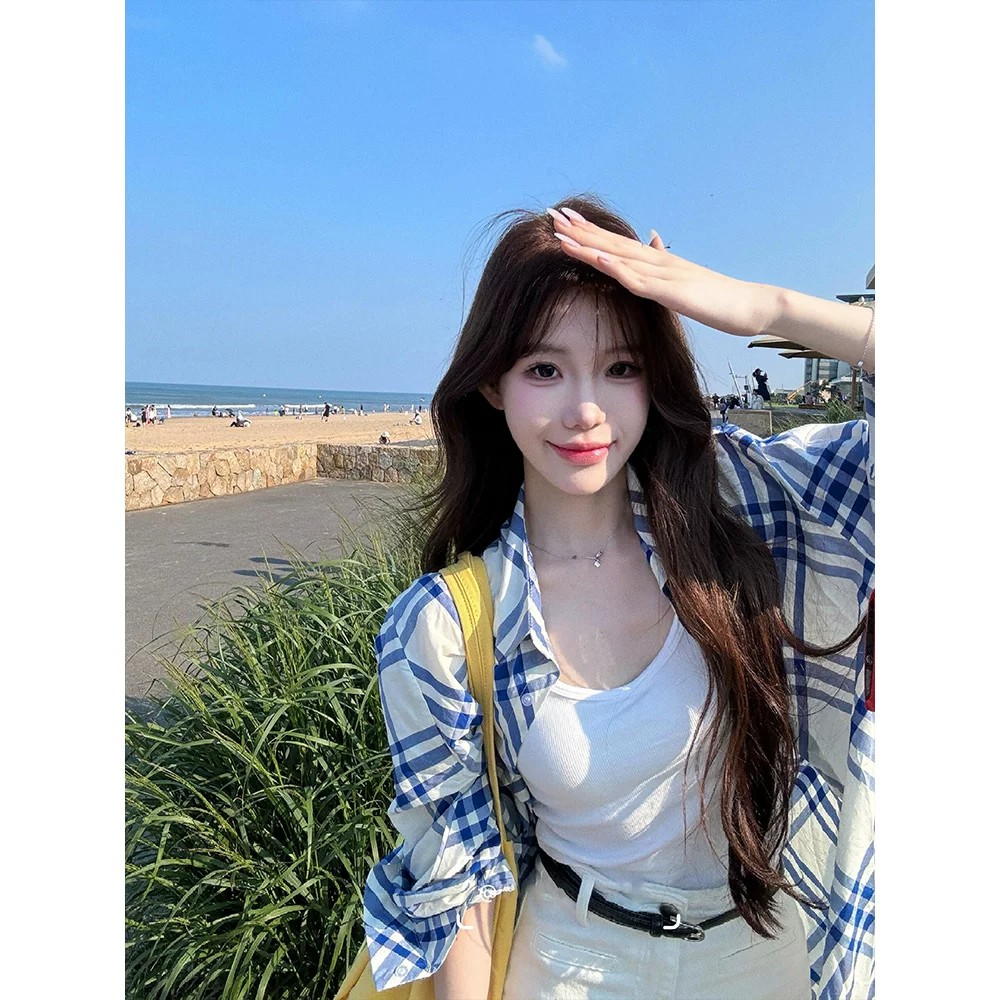 블루 화이트 사선 무늬 체크무늬 자외선 차단 여성 셔츠 여름 루즈핏 긴팔 맨위 재킷 슈퍼 디스플레이 화이트