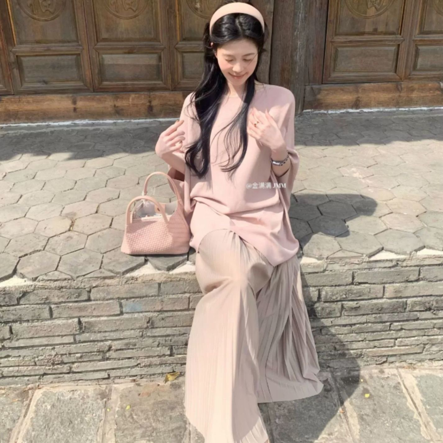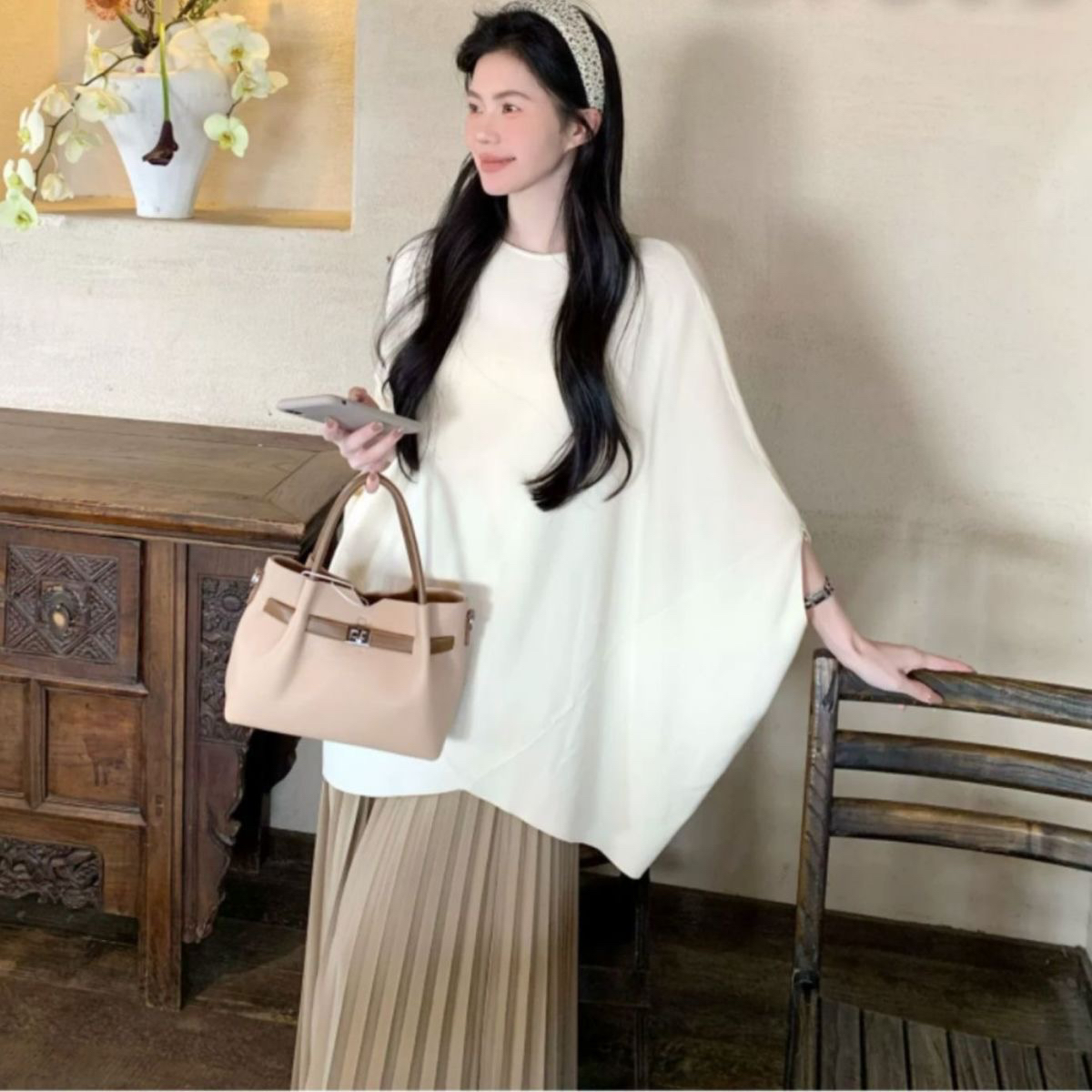 프랑스식 느긋한 바람 배트윙 소매 니트 스웨터 허리 수축 슬림해 보이는 구덩이 기사 맨위 라운드 넥 중간 소매 부드러운 바람 티셔츠