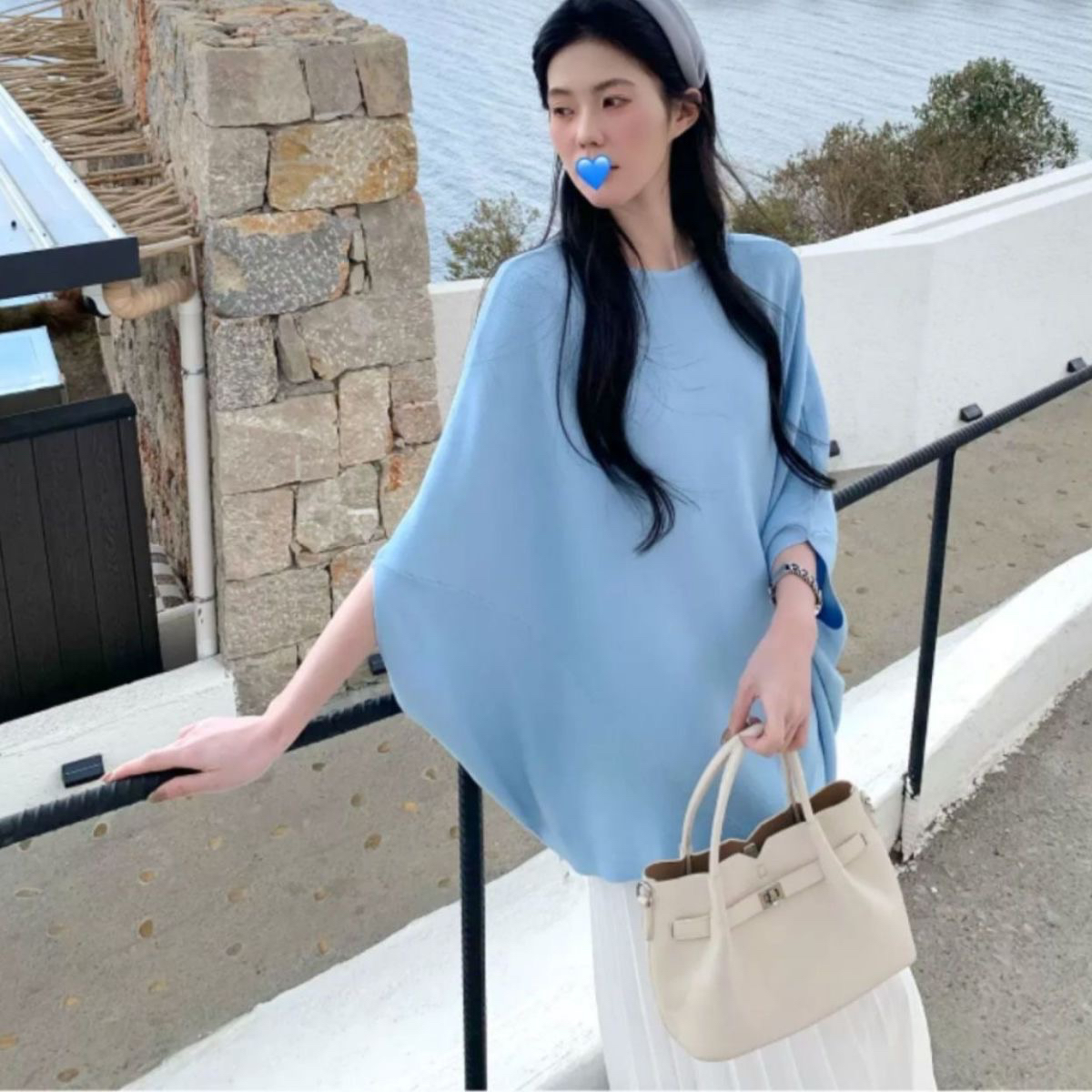 프랑스식 배트윙 소매 카키 반팔 얼음 실크 니트 스웨터 여성 여름 디자인 센스 작은 대중 루즈핏 슬림해 보이는 표지 고기 맨위
