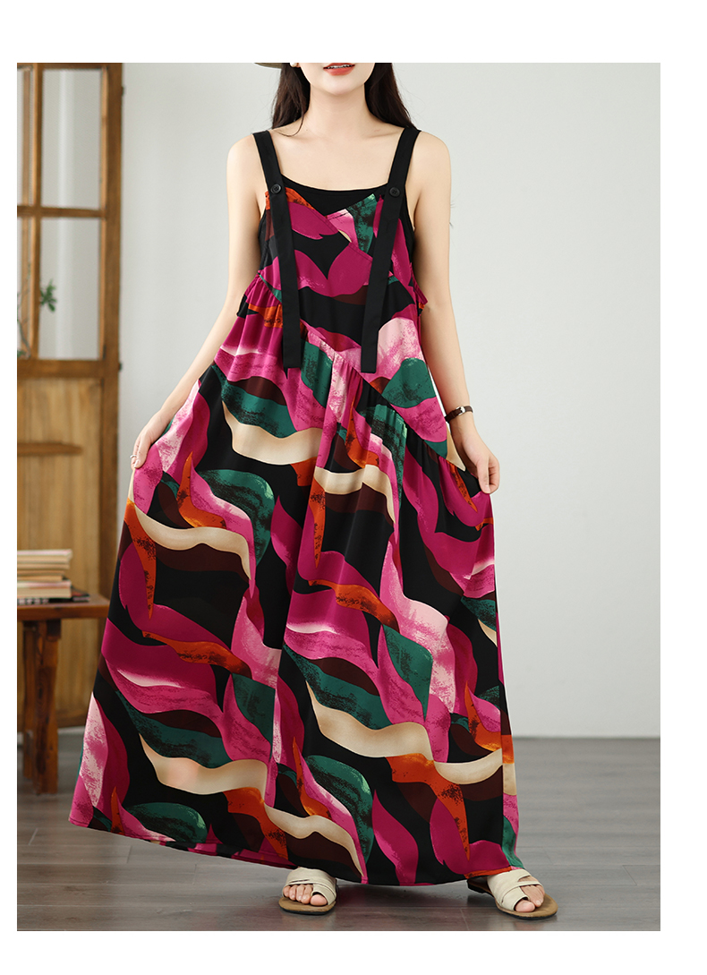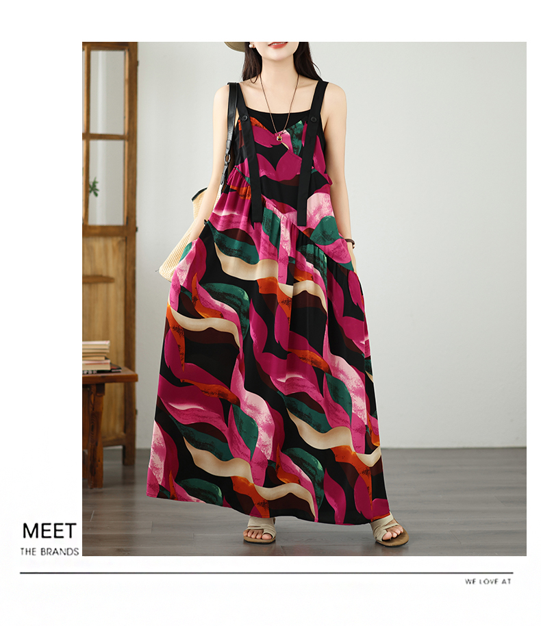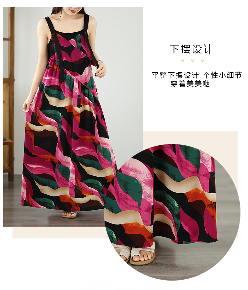 실사 2026 여름 새로운 빅 사이즈 루즈핏 롱 스커트 쉬폰 프린트 디자인 센스 멜빵 중간 길이 드레스