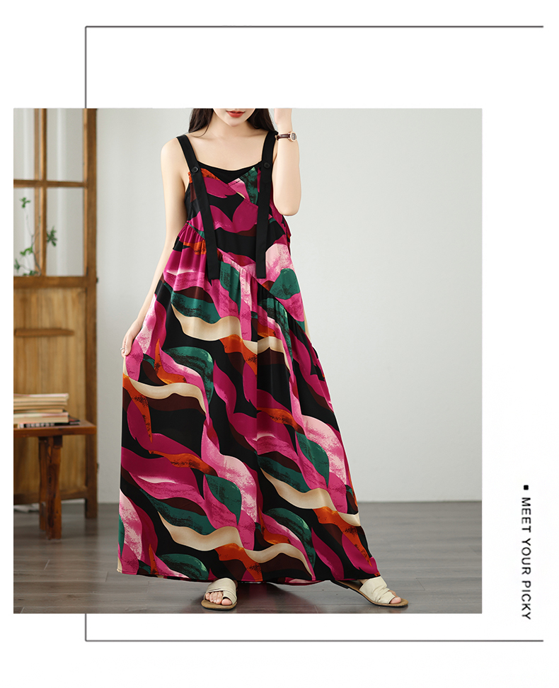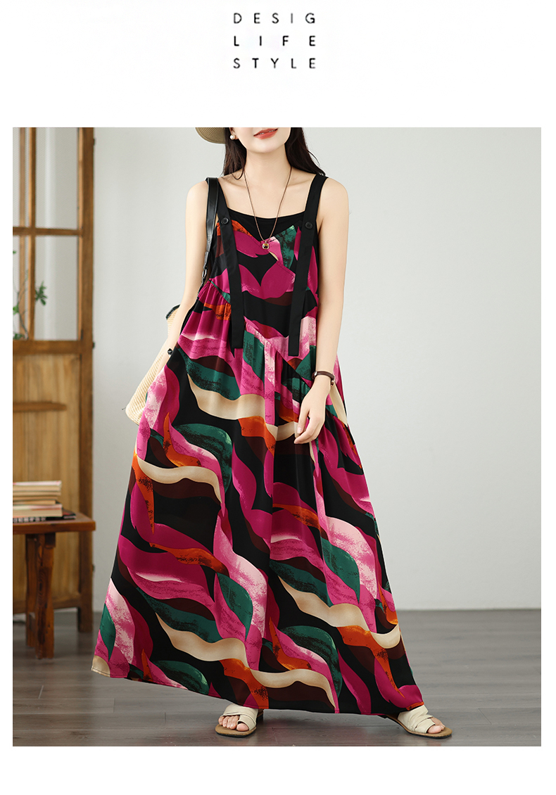 실사 2026 여름 새로운 루즈핏 롱 스커트 쉬폰 수묵화 프린트 디자인 센스 멜빵 중간 길이 드레스