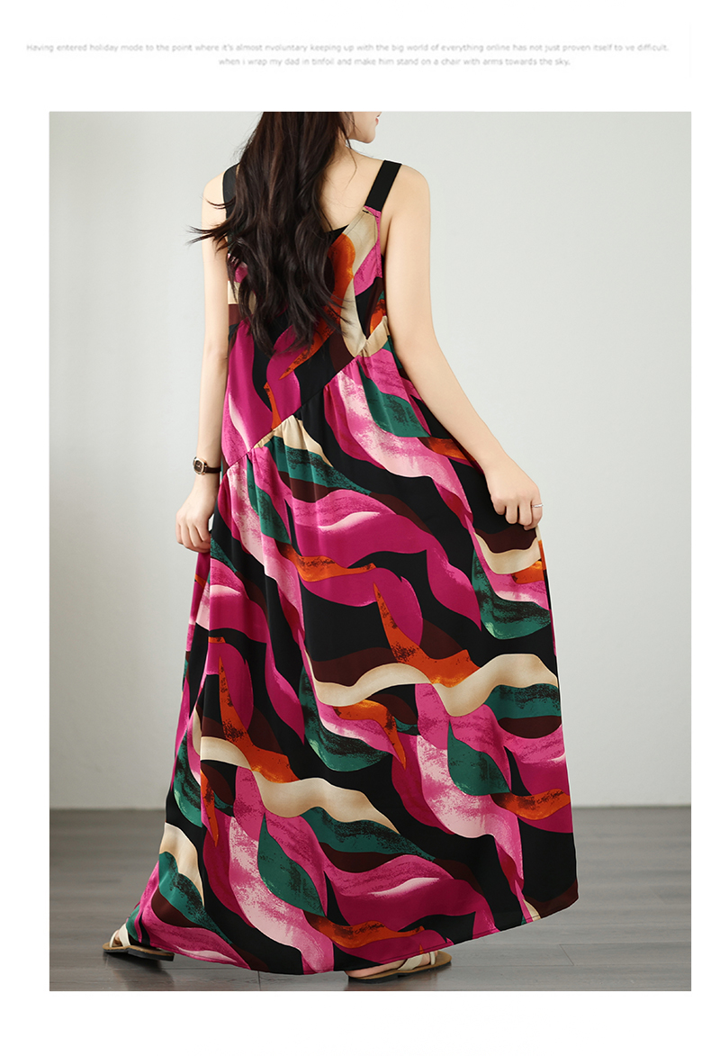 실사 2026 여름 새로운 롱 스커트 쉬폰 물결무늬 페인팅 프린트 디자인 센스 멜빵 중간 길이 드레스