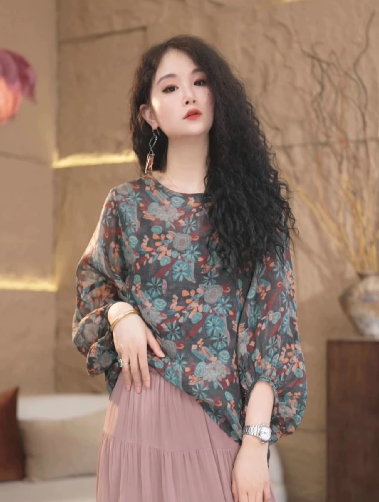 실사 새로운 고급 레트로 프린트 라미 여성 셔츠 문예 벌룬 소매 셔츠 품격 루즈핏 풀오버 맨위