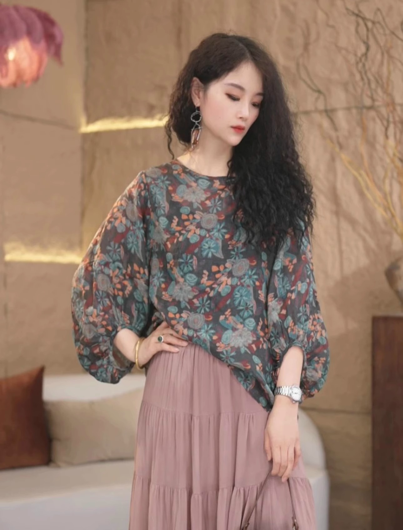 고급 레트로 프린트 라미 여성 셔츠 문예 벌룬 소매 셔츠 품격 루즈핏 풀오버 맨위