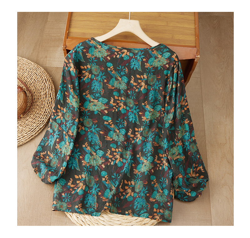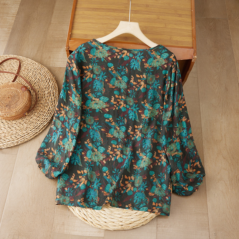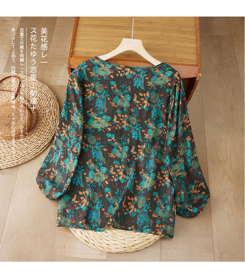 고급 레트로 프린트 라미 여성 셔츠 문예 벌룬 소매 셔츠 품격 루즈핏 풀오버 맨위
