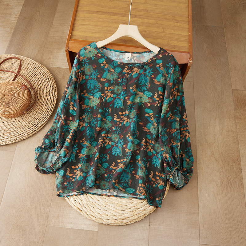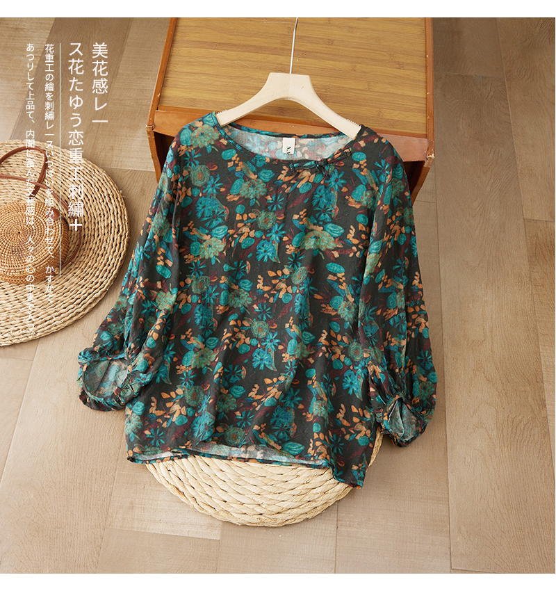 실사 새로운 고급 레트로 프린트 라미 여성 셔츠 문예 벌룬 소매 셔츠 품격 루즈핏 풀오버 맨위