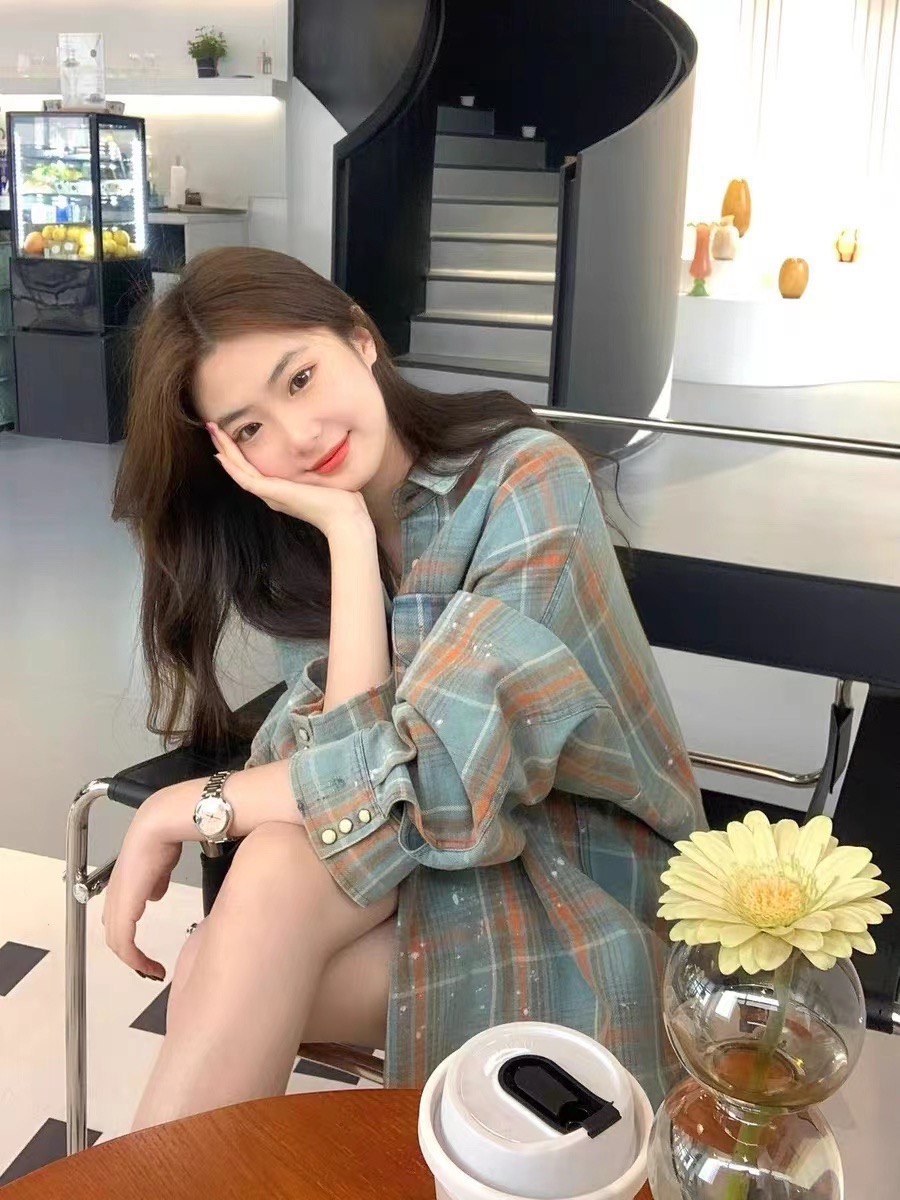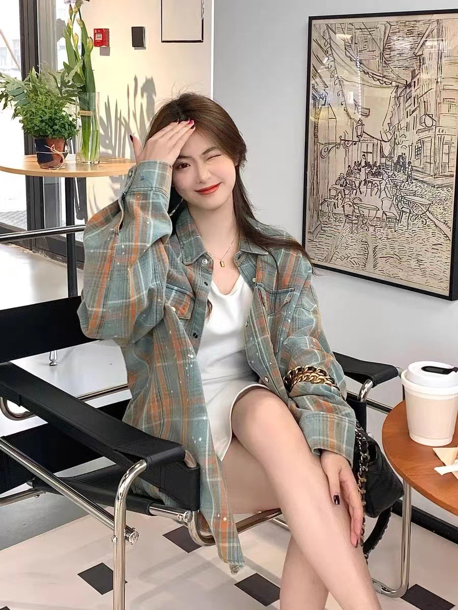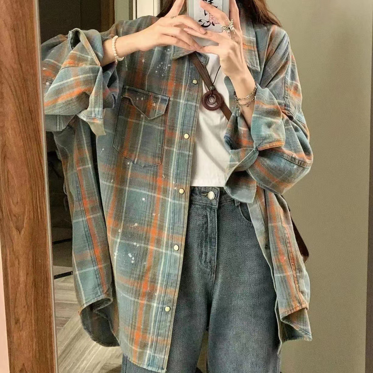 아메리칸 먹물 데님 체크무늬 여성 셔츠 루즈핏 bf 느긋한 바람 외출용 셔츠 트렌디 작은 대중 디자인 센스 봄과 가을