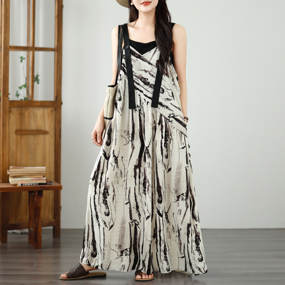 실사 2026 여름 새로운 루즈핏 롱 스커트 쉬폰 수묵화 프린트 디자인 센스 멜빵 중간 길이 드레스