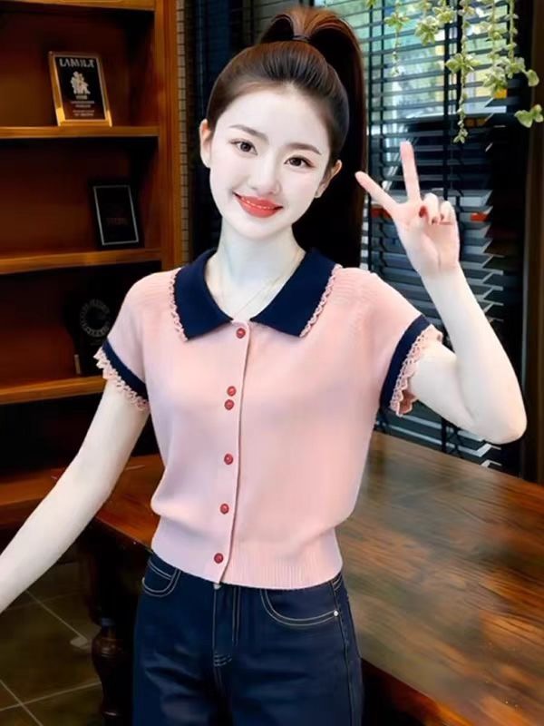 2026 새로운 학원 스타일 폴로 칼라 수건 개 자카드 알파벳 두 장 니트 스웨터 반팔 맨위 티셔츠 여성