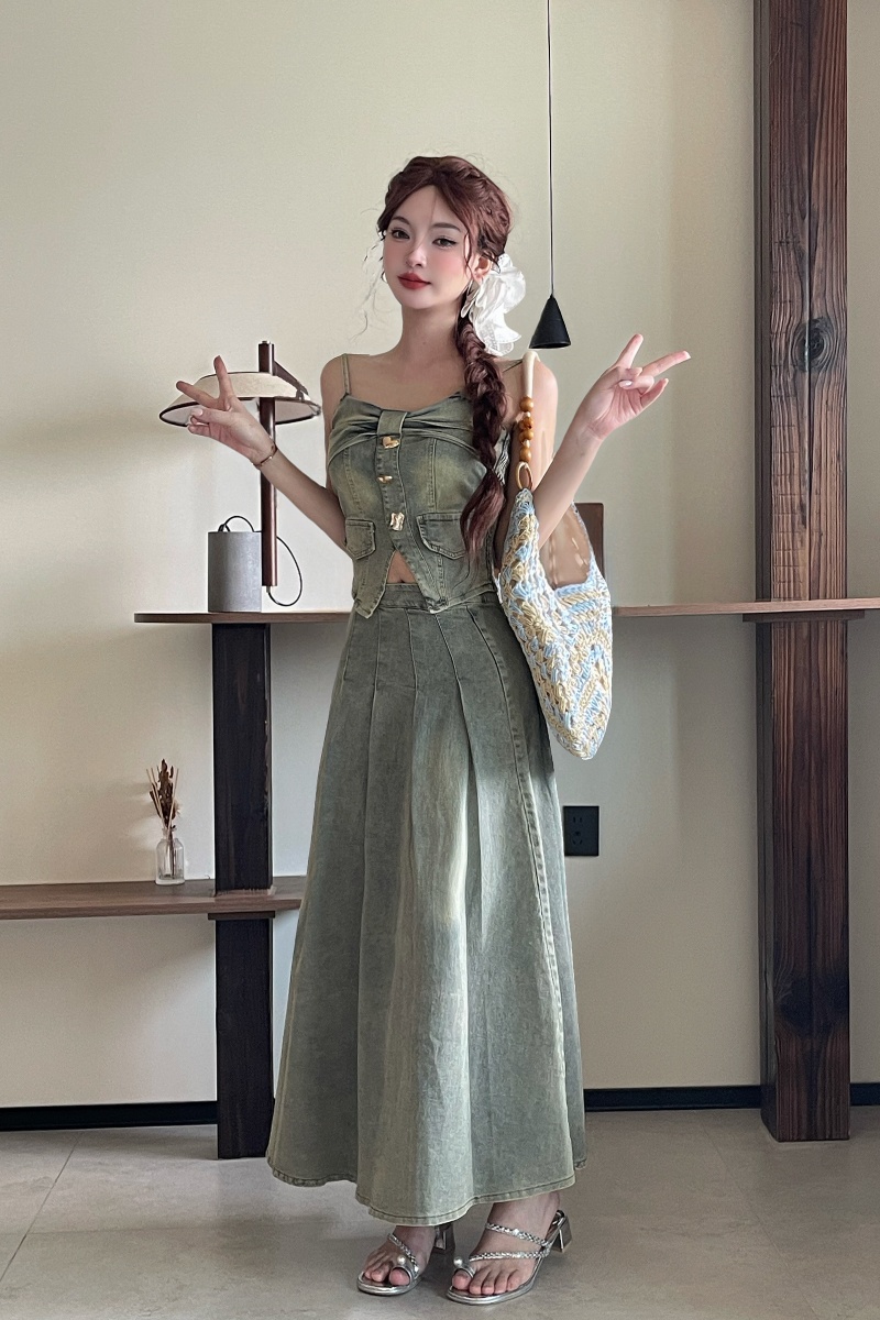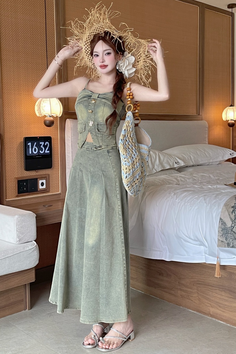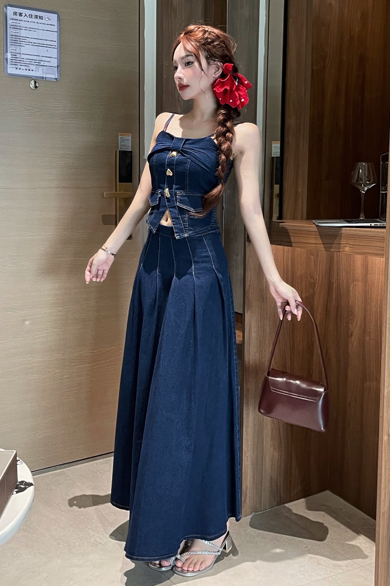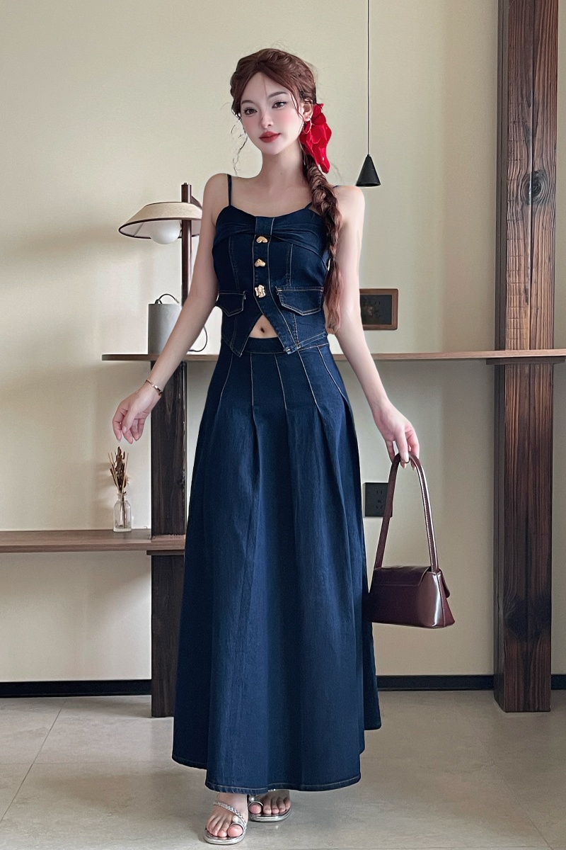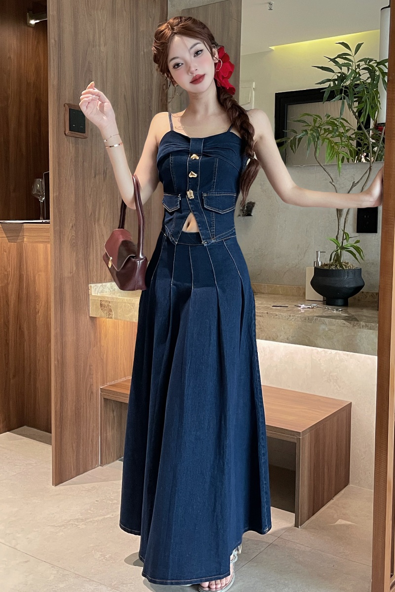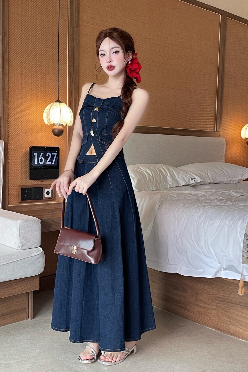 실사 정가 Chic 금속 버클 튜브탑 슬립 맨위 슬림해 보이는 큰 진자 반신 스커트 데님 투피스 세트
