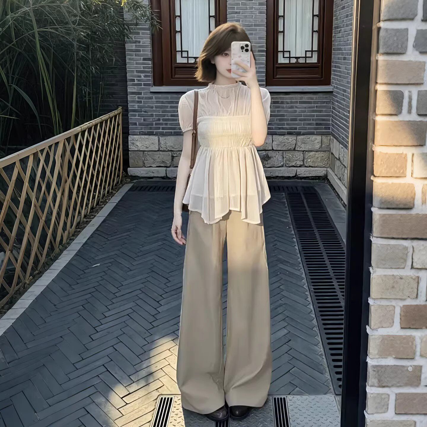 여름 착용 가져 가라. 전체 집합 빅 사이즈 지방 mm 쉬폰 블라우스 맨위 와이드 레그 팬츠 빛 사람들 코치 달콤함 투피스 슈트 여성