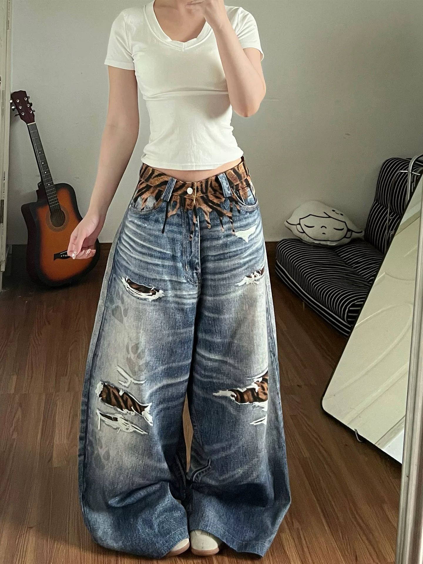 높음 거리 호랑이 무늬 패치워크 찢어진 부분 모통이 칼 청바지 바지 여자 2026 여름 새로운 루즈핏 넓은 다리 바닥 청소 바지