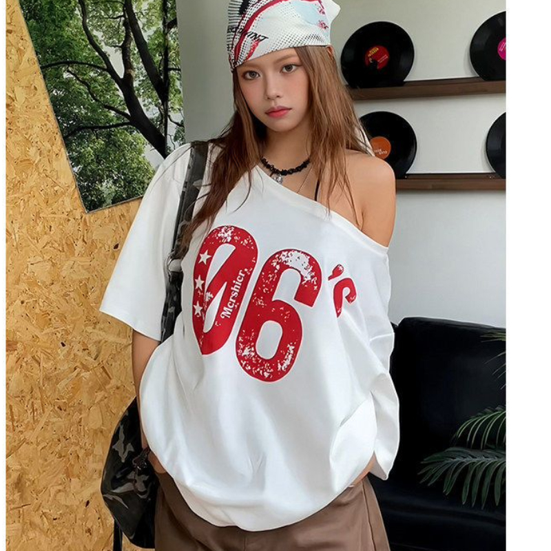 220 그램 92 면 8 암모니아 Lun 아메리칸 핫걸 비스듬한 어깨 알파벳 프린트 반팔 티셔츠 여성