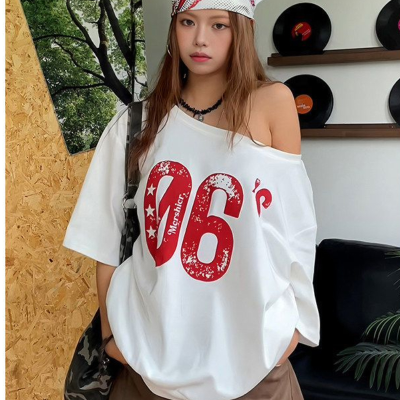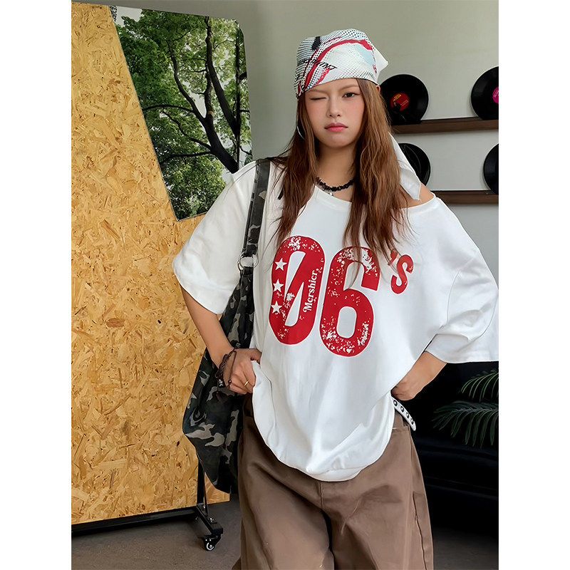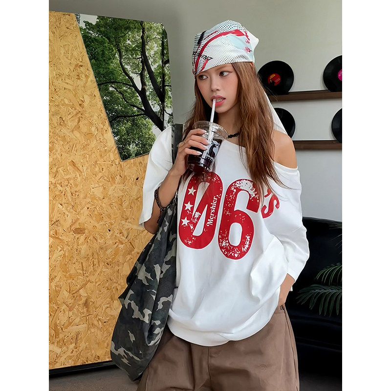아메리칸 오프숄더 별 프린트 화이트 긴팔 티셔츠 여성 여름 달콤한 차가운 느슨함 센스 루즈핏 새로운 y2k 맨위 여성