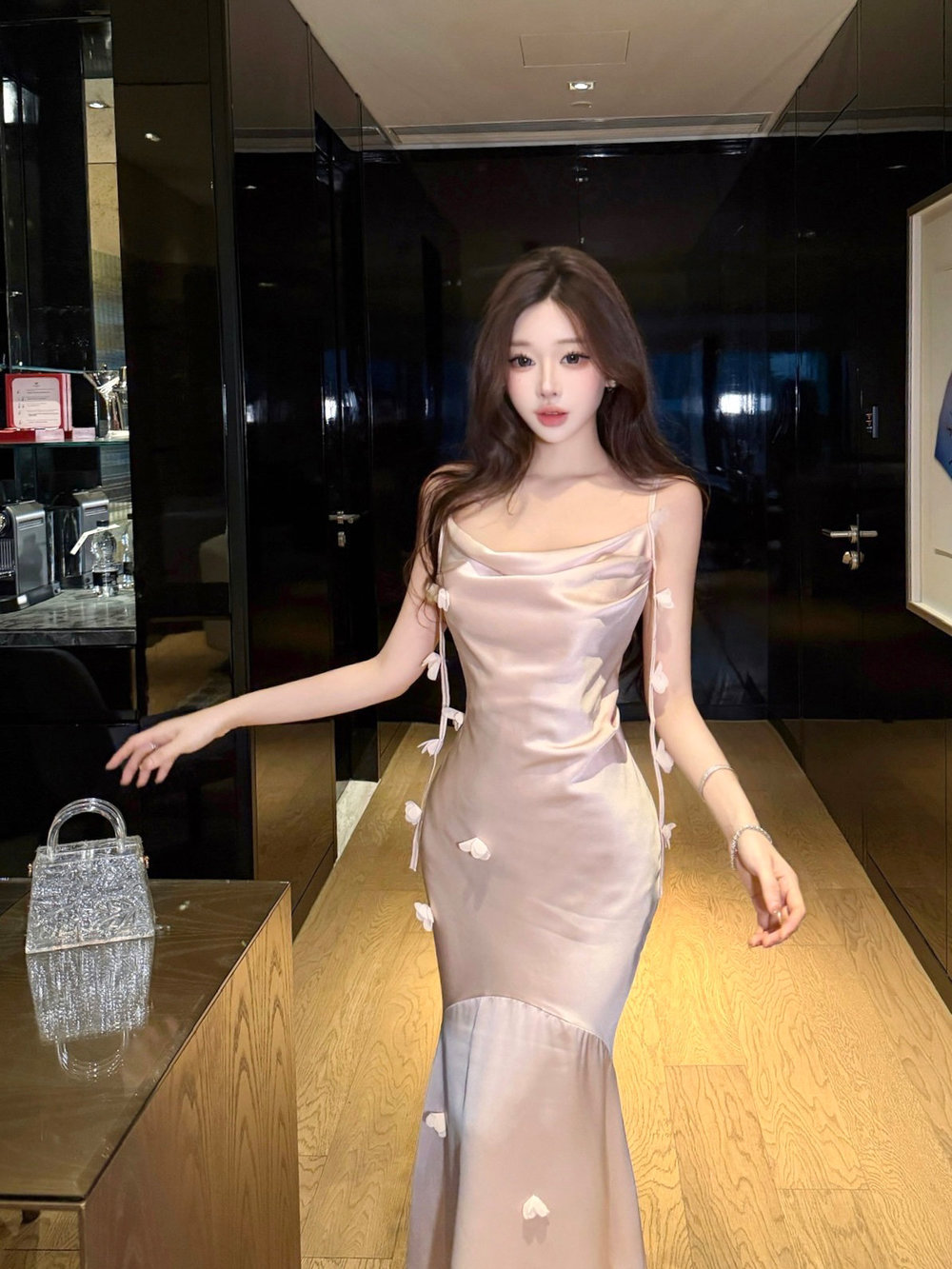 실사 프랑스식 섹시함 새틴 아세트산 슬립 디자인 센스 주름 허리 수축 슬림해 보이는 드레스
