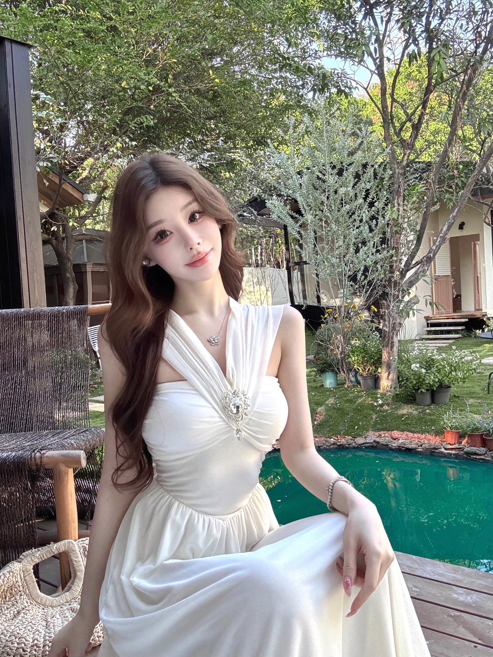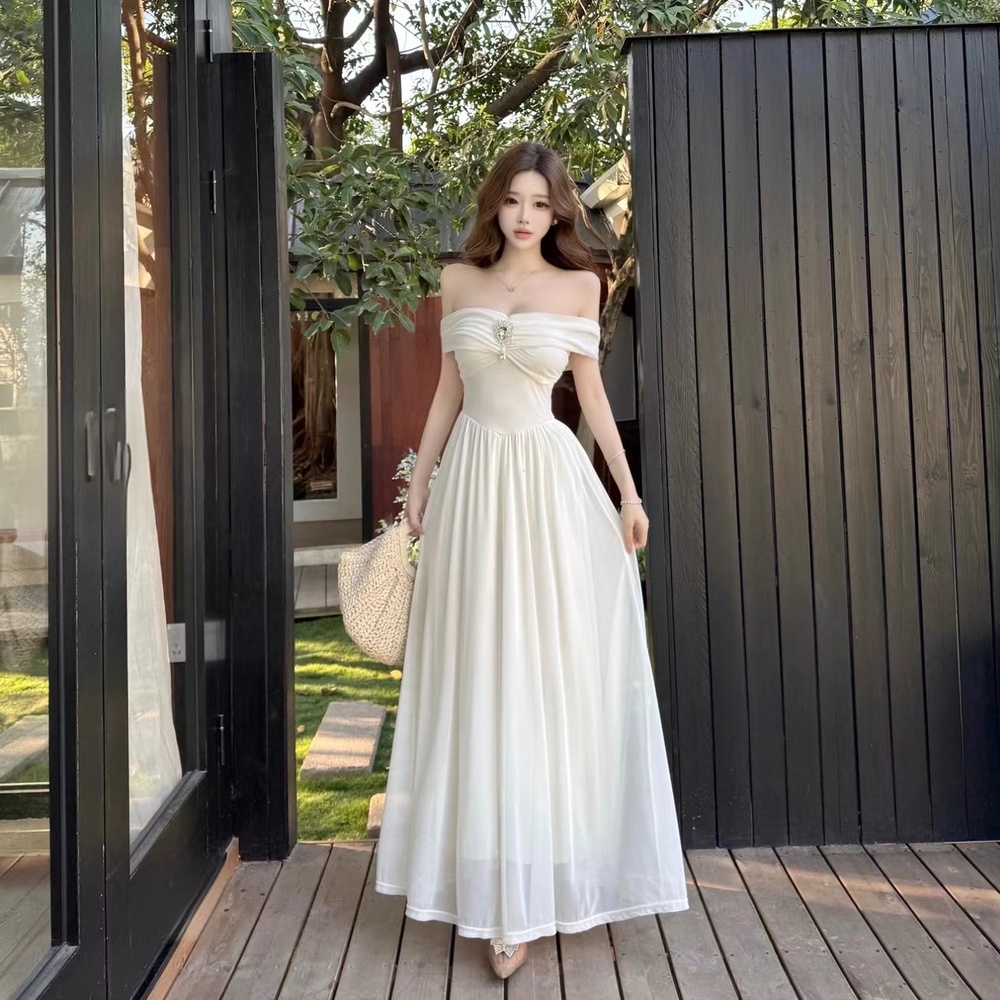 실사 프랑스식 순수한 욕망 디자인 센스 해변가 휴가 오프숄더 주름 튜브탑 분위기 센스 예복 드레스