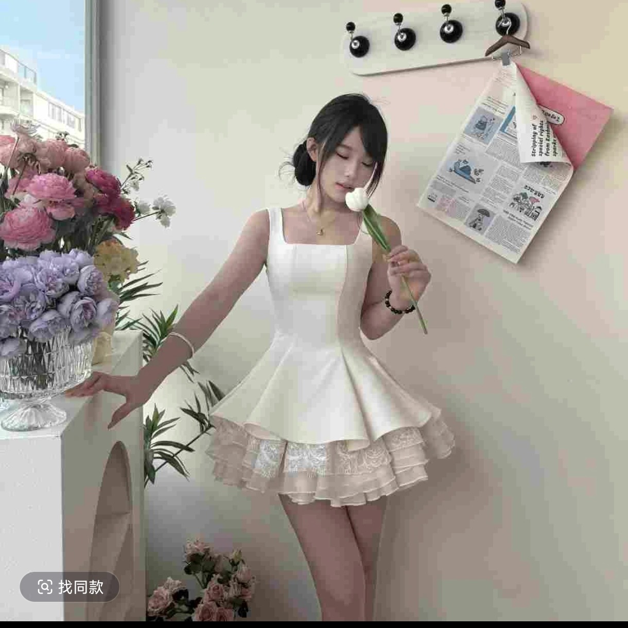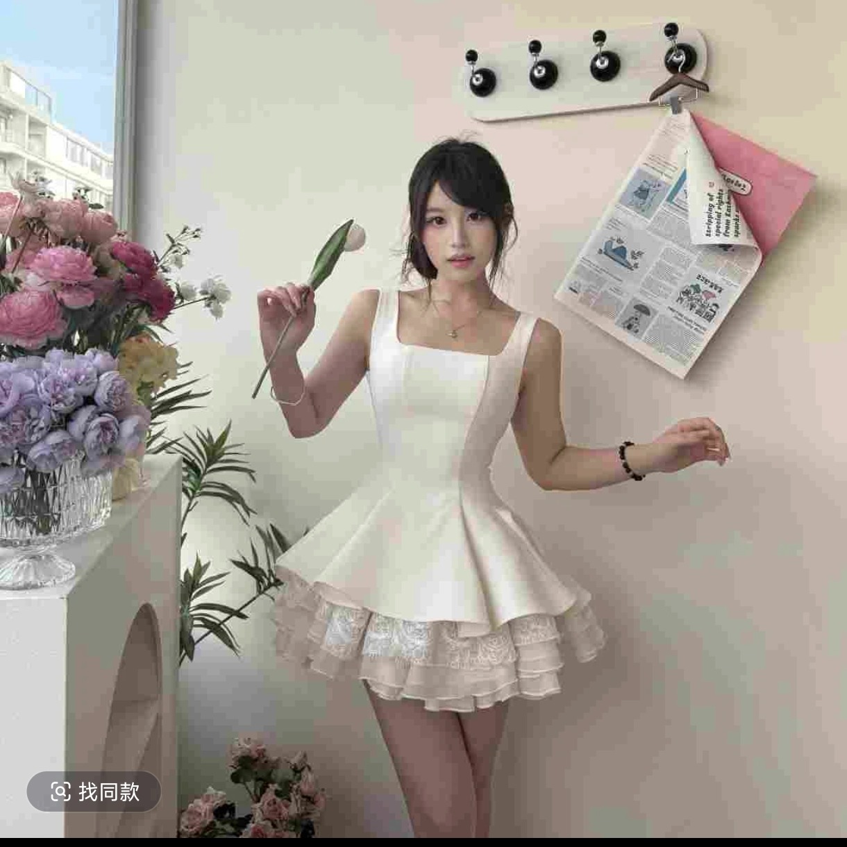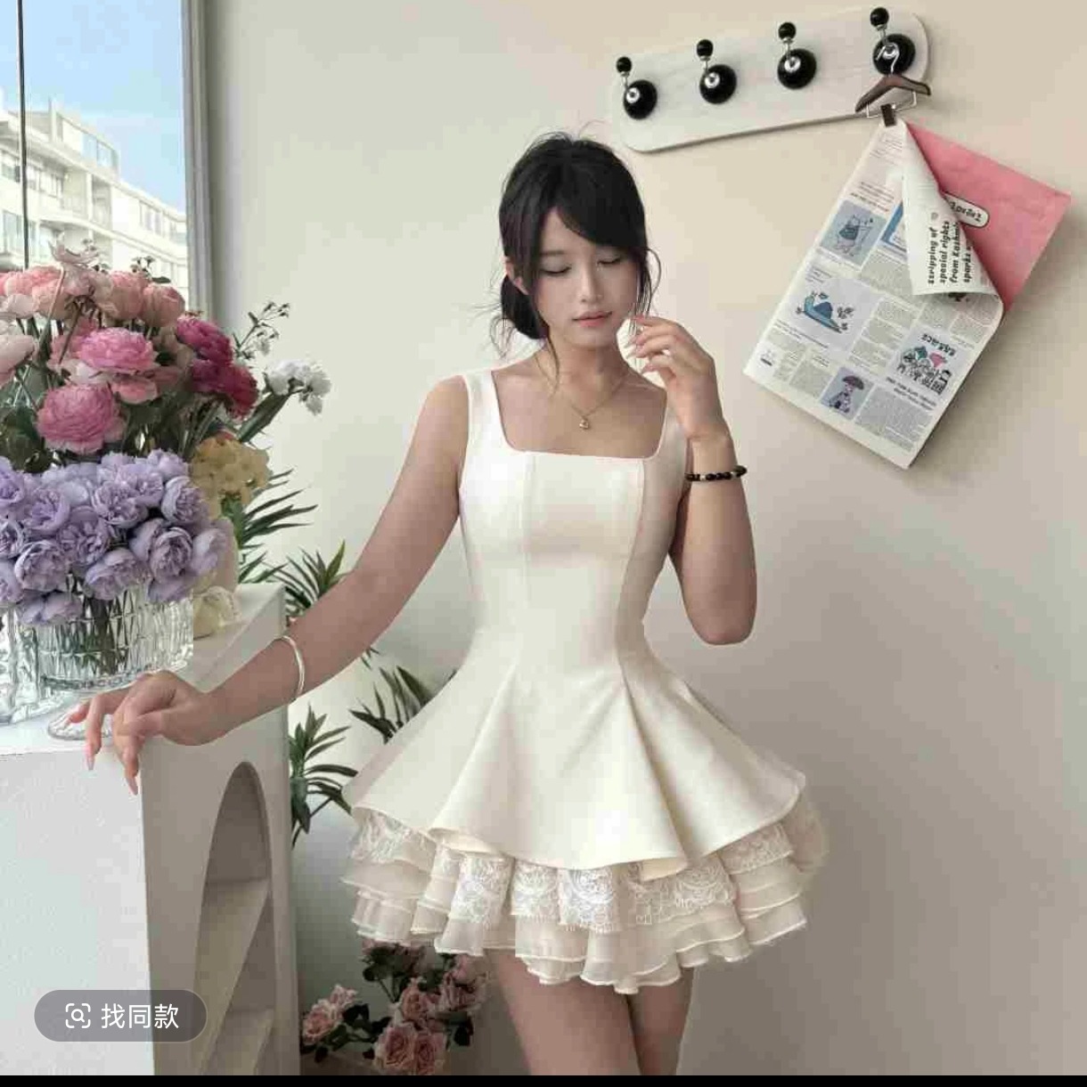 화이트 도자기 공주 허리 수축 슬림해 보이는 달콤함 천 금빛 바람 퍼프 공주 드레스 여름 품격 민소매 드레스