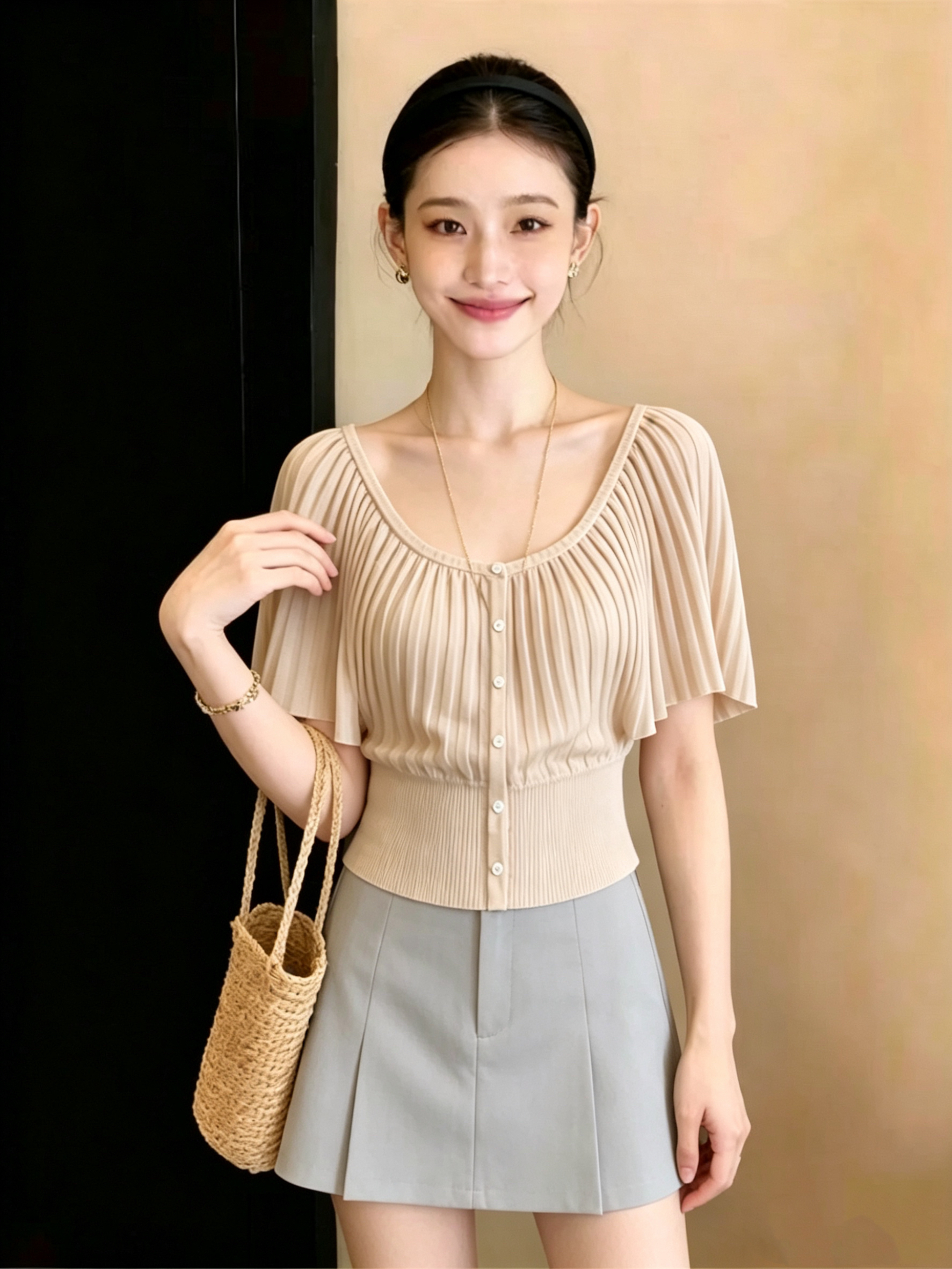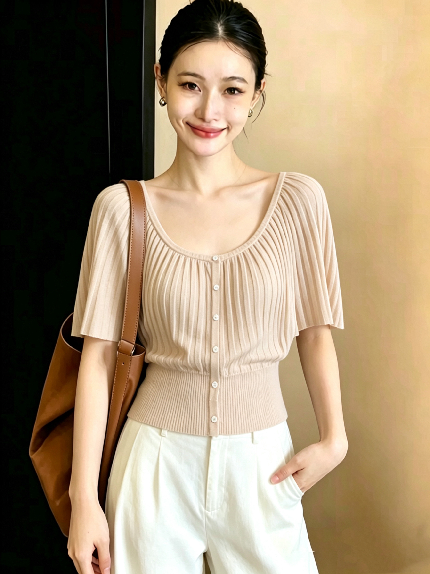재고 있음 2026 여름 새로운 반팔 니트 스웨터 여성 꼬집기 허리 디자인 맨위