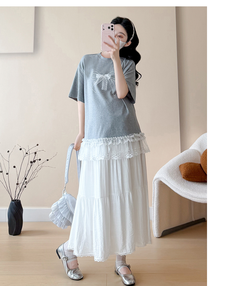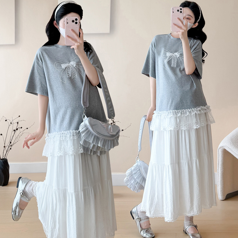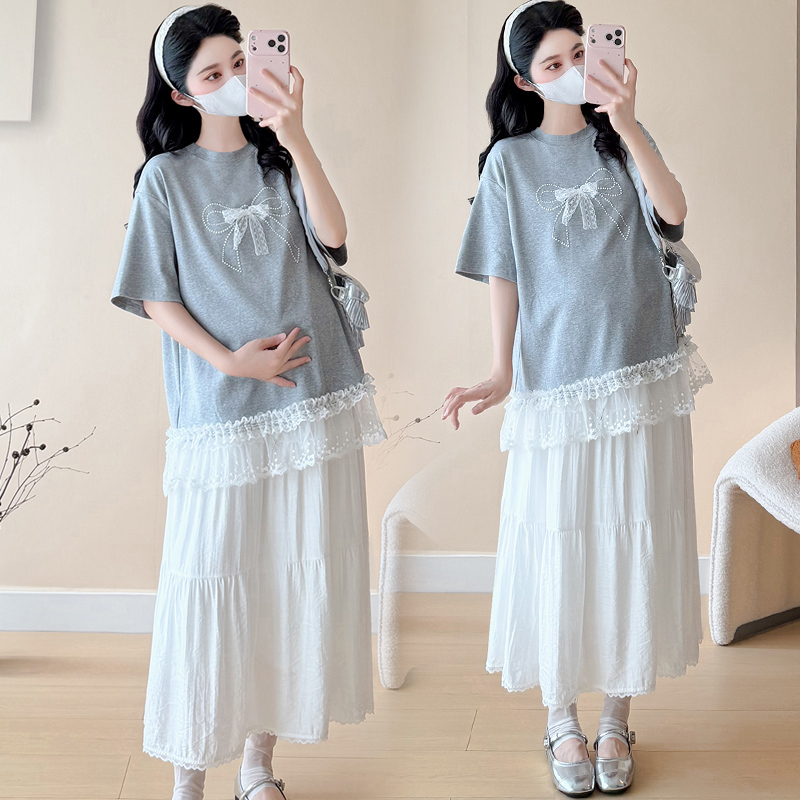 실사 여름 한 부서 루즈핏 레이스 패치워크 맨위 펌프 로프 레이스 반신 스커트 임신 엄마 달콤함 세트