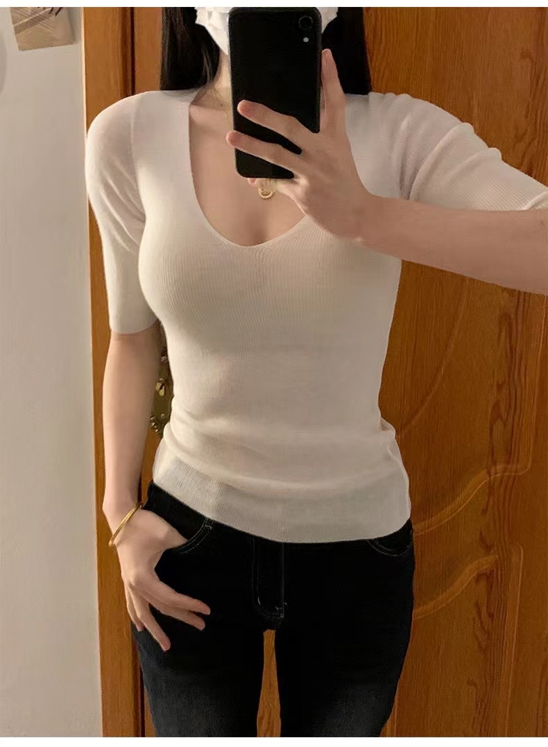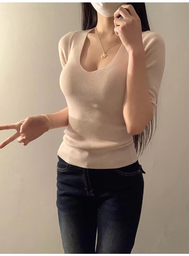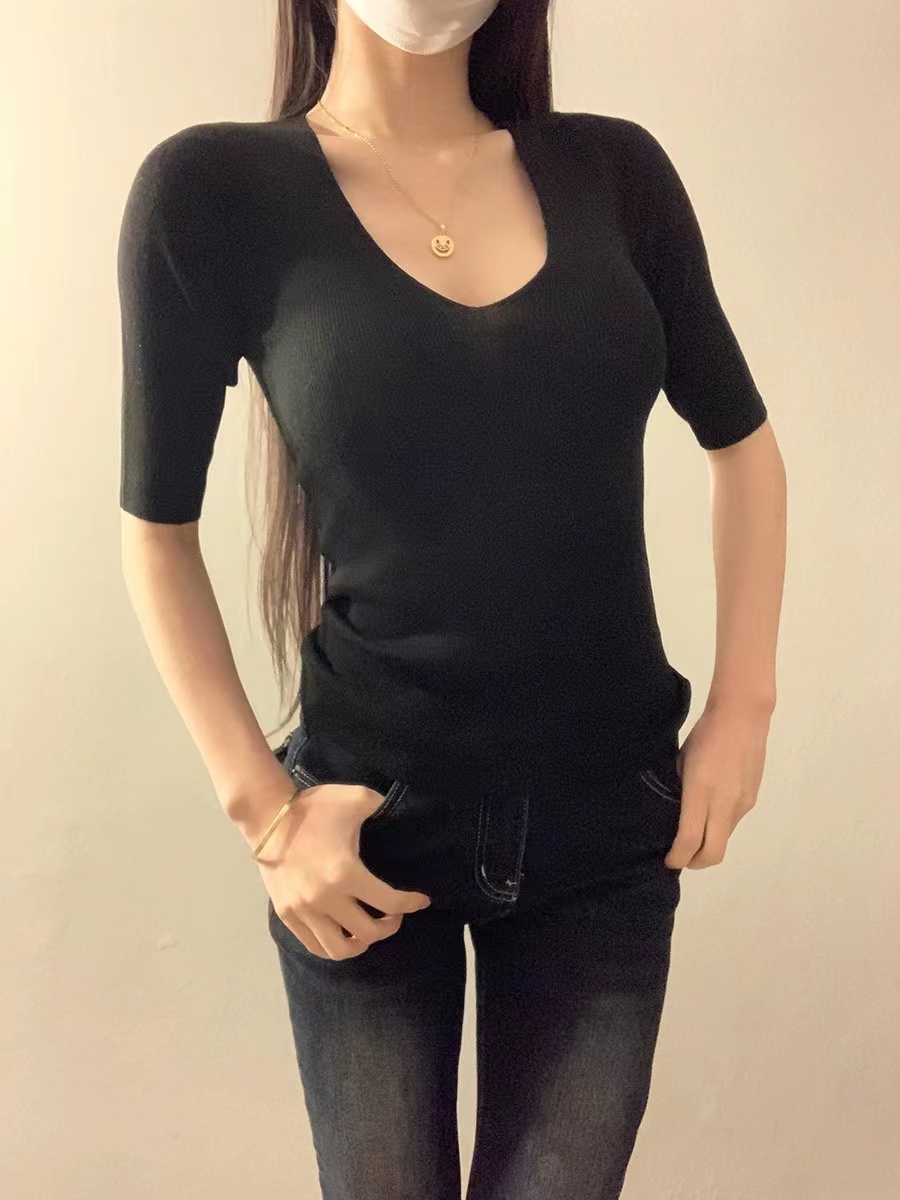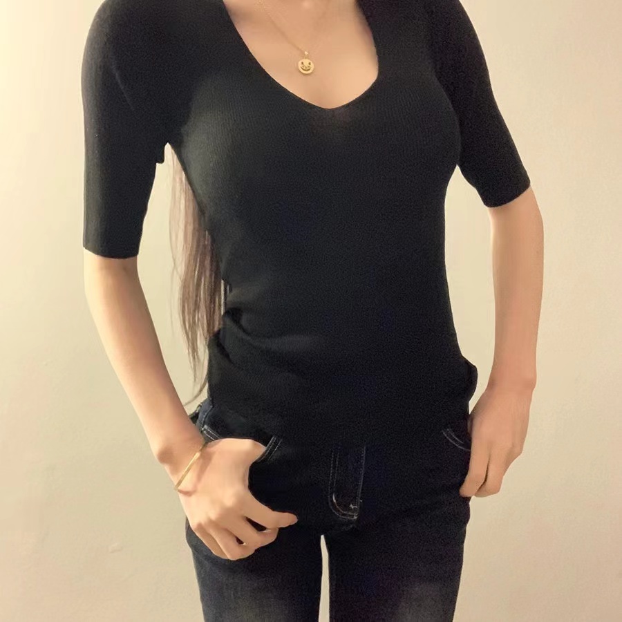 순수한 욕망 V넥 몸매 가꾸기 5 점 소매 짠 셔츠 여성 한 부서 아름다운 자이언트 잘 생긴 ~ 중 기본 셔츠 이른 봄 품격 맨위