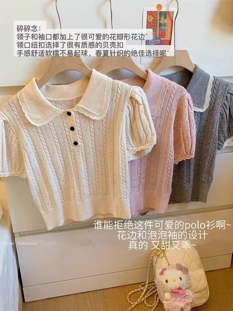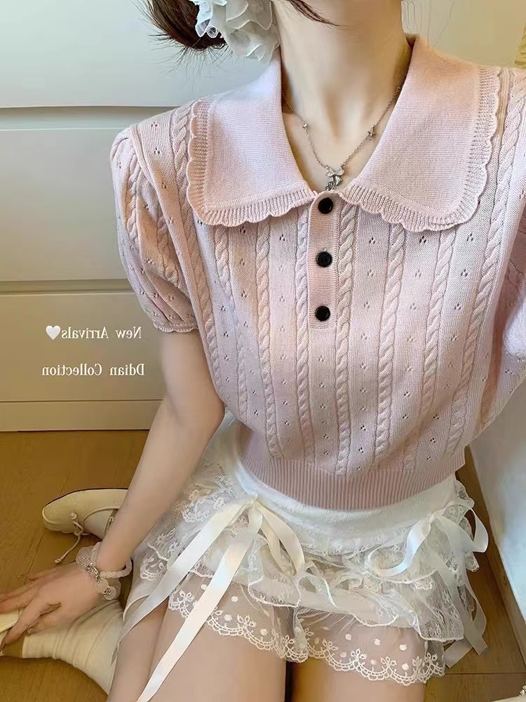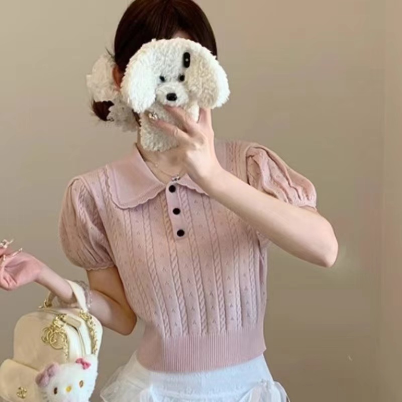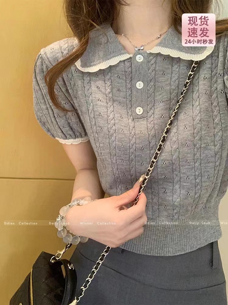 단색 베이비 칼라 꽈배기 거품 소매 니트 스웨터 여성 여름 2026 새로운 허리 수축 다용도 쇼트 스타일 인사이드 가져 가라. 반팔