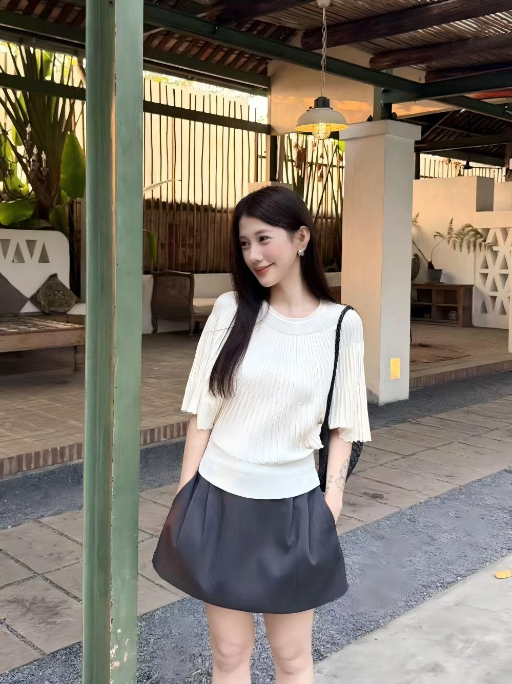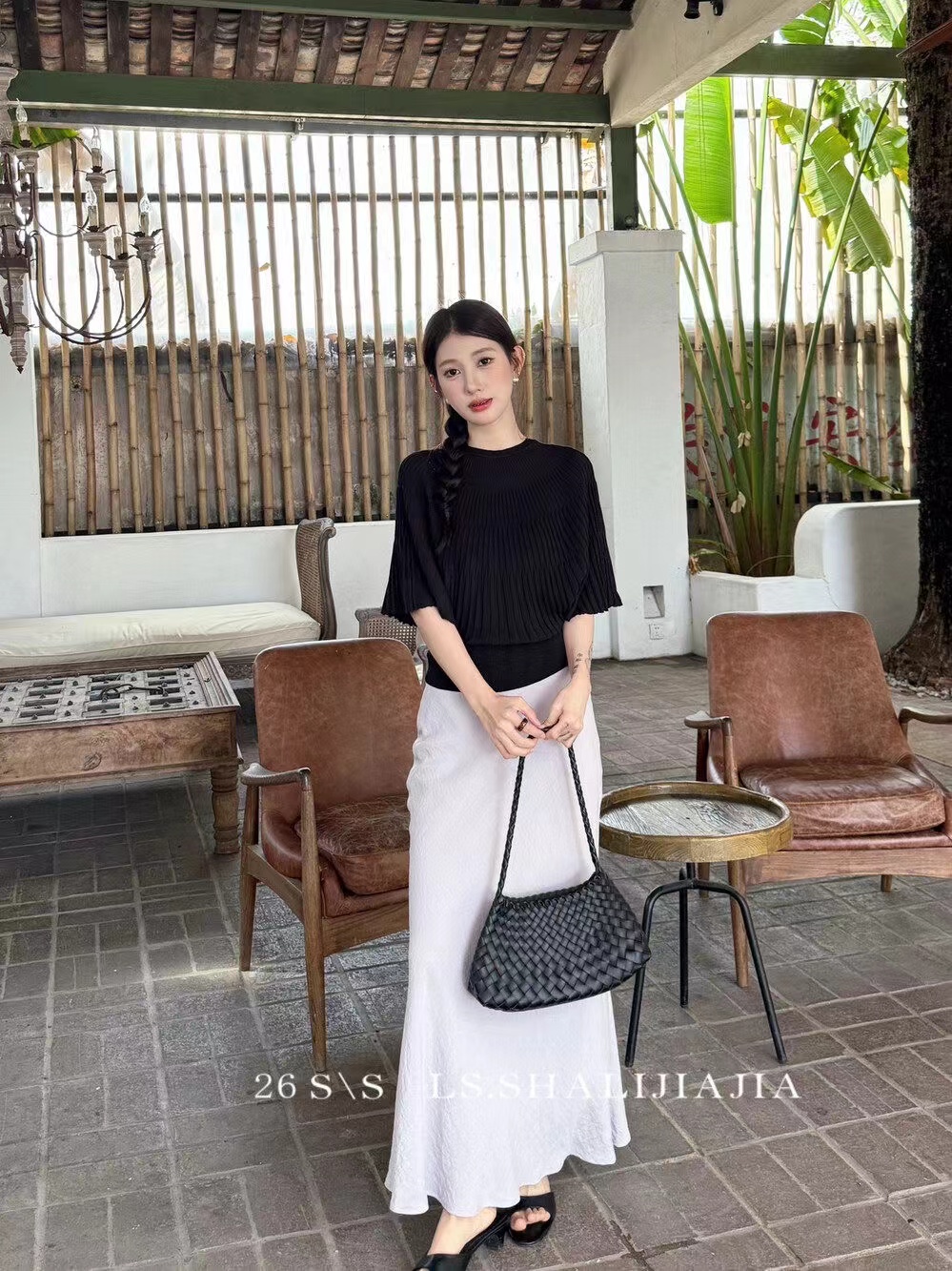 여름 새로운 패션 치마 품격 슬림해 보이는 V넥 반팔 맨위 세트